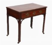 Late 18th century. A fine George III mahogany side table, of serpentine outline, with satinwood crossbanding and stringing, fitted with a single drawer and raised on square tapering legs with spade feet.