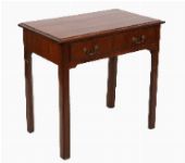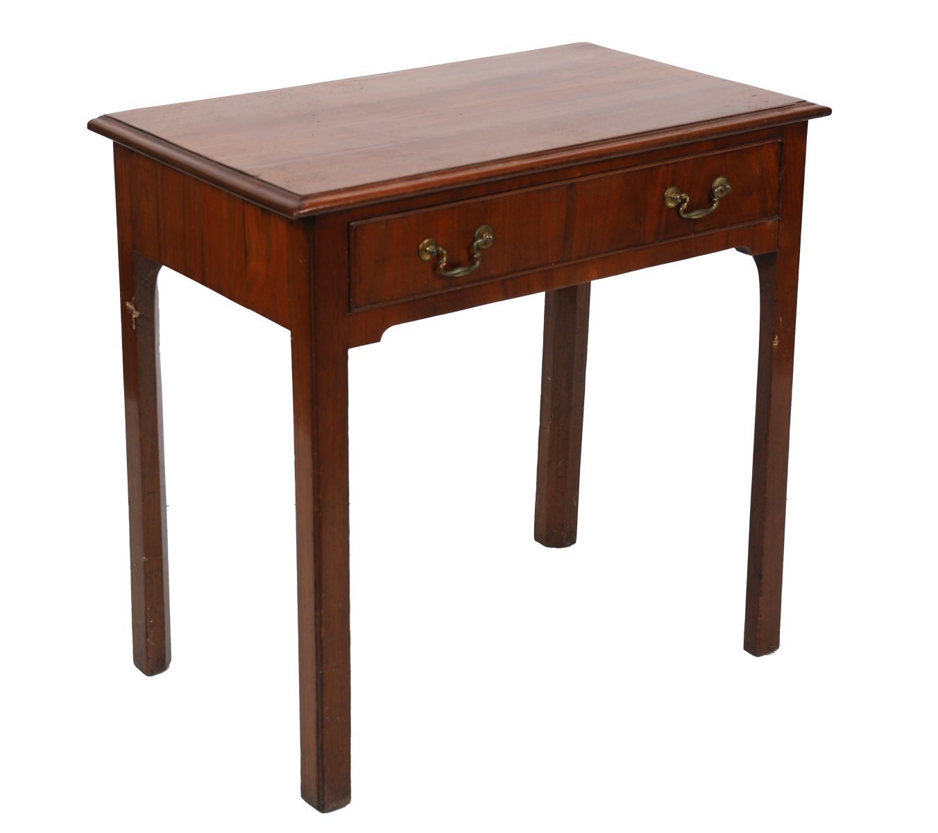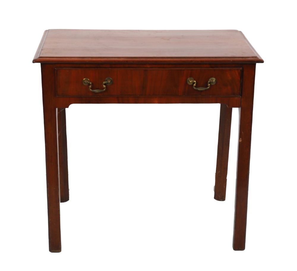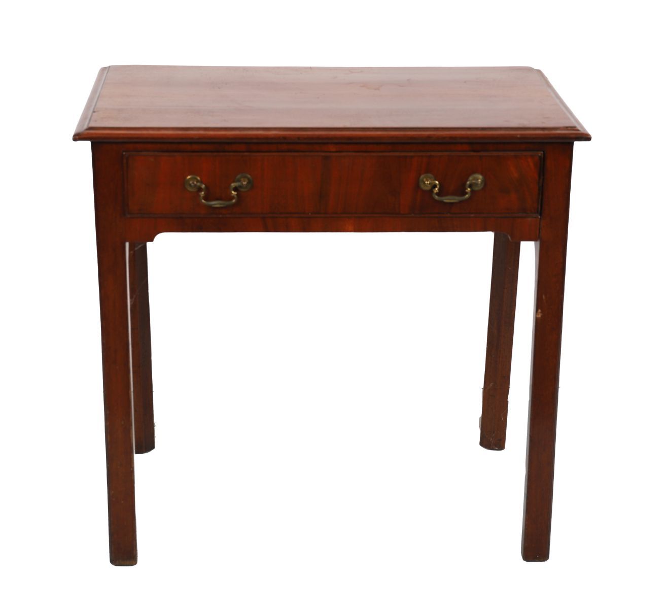 Late 18th century. A George III mahogany side table of rectangular form, with single frieze drawer fitted with brass swan-neck handles, raised on square tapering legs.