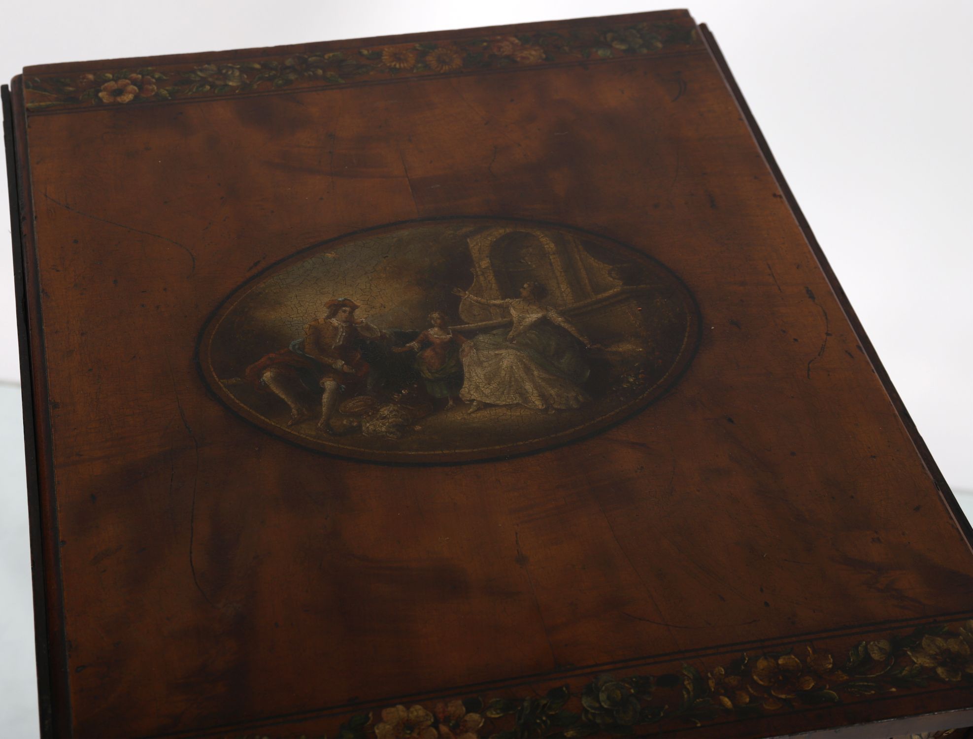 A charming George III period satinwood Pembroke table, the rectangular top finely painted with a central oval reserve depicting a romantic 18th-century courtship scene, flanked by hand-painted floral borders. The drop-leaf sides are similarly decorated, supported on slender tapering legs with ring-turned details, terminating in brass castors. The drawer and opposing dummy drawer are framed within elegant inlaid stringing.