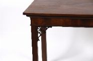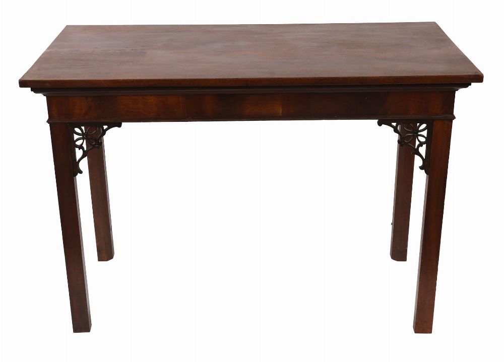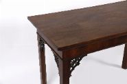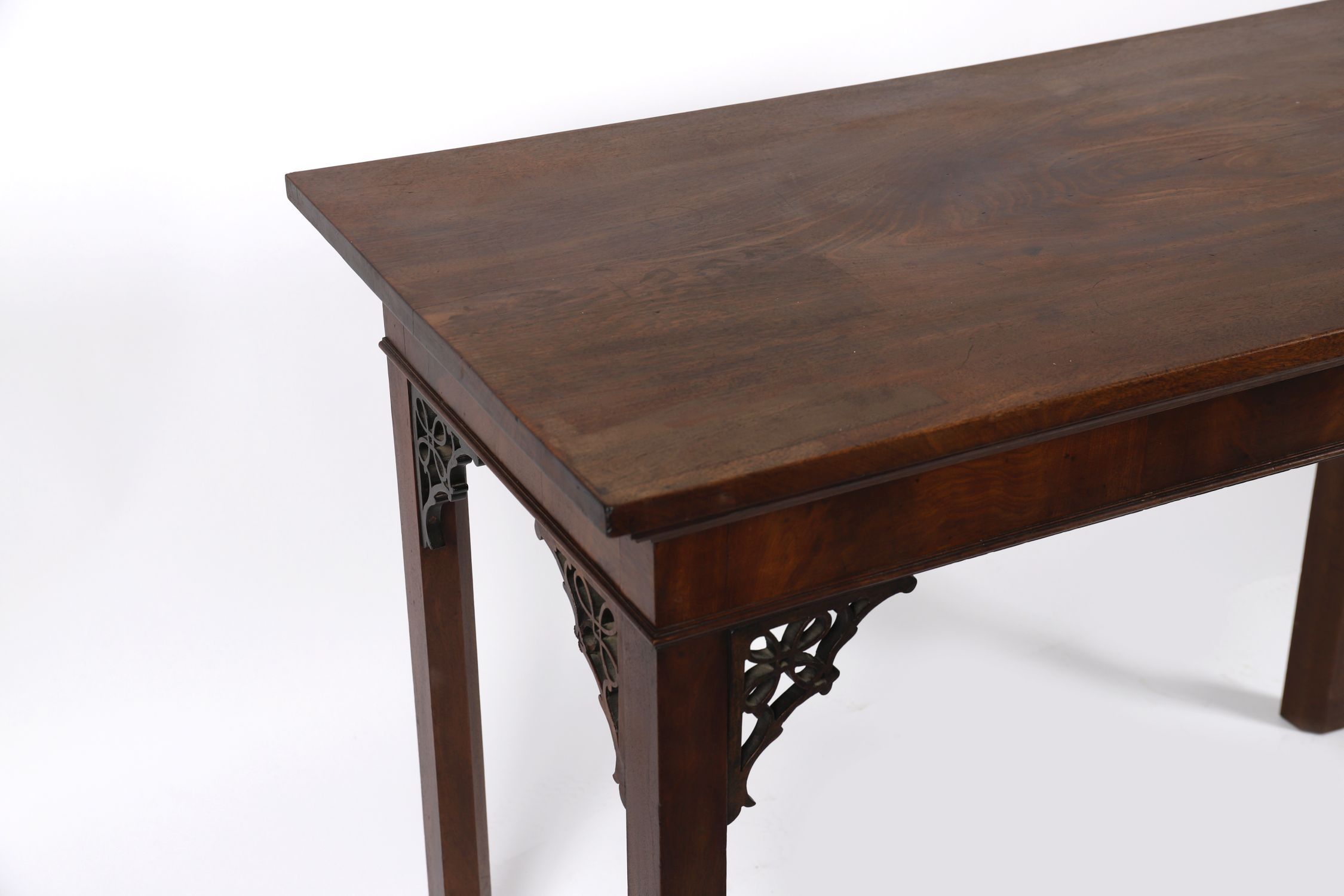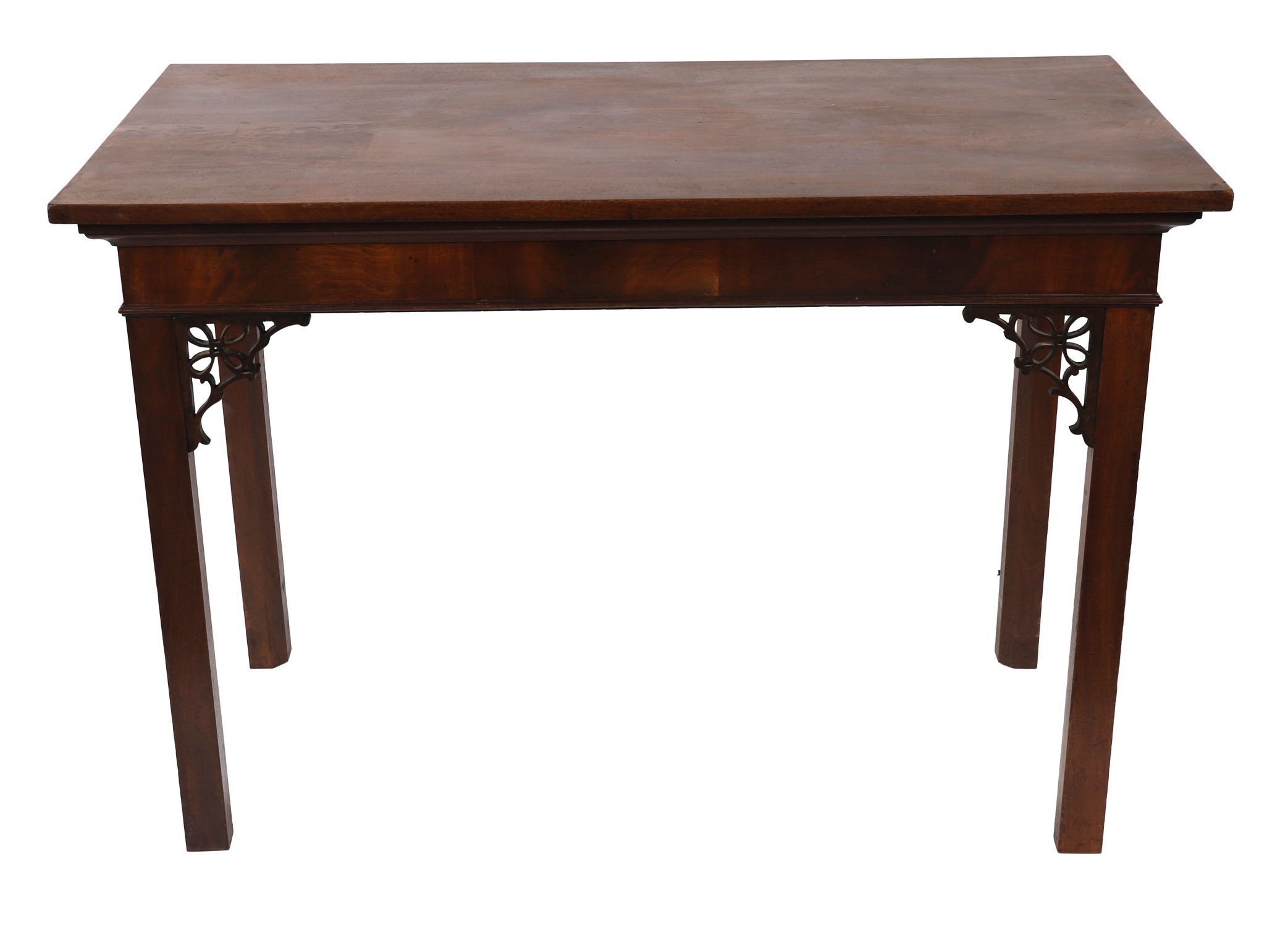 A George III mahogany side table, the rectangular top above a plain frieze, supported on square tapered legs with pierced fretwork corner brackets.