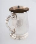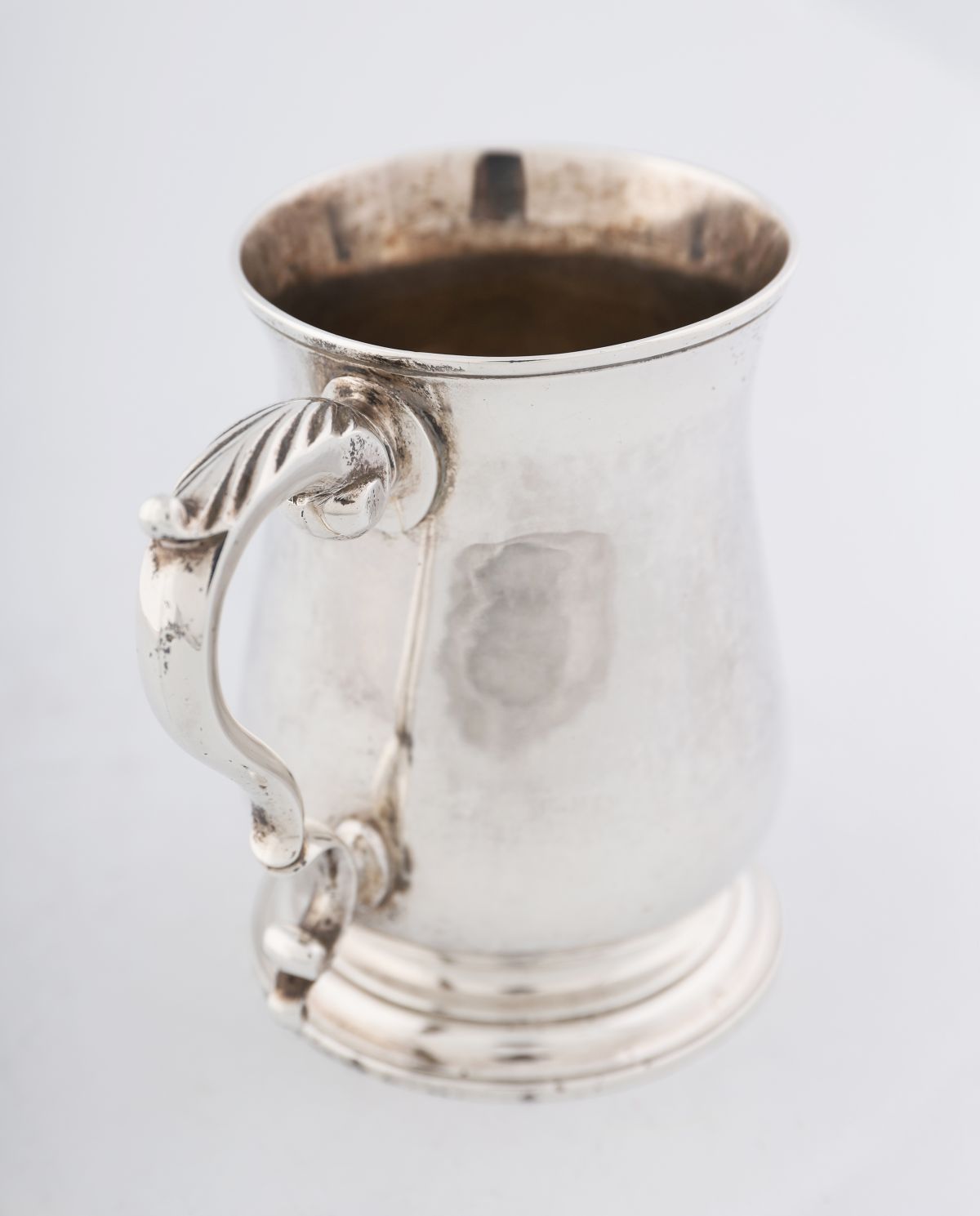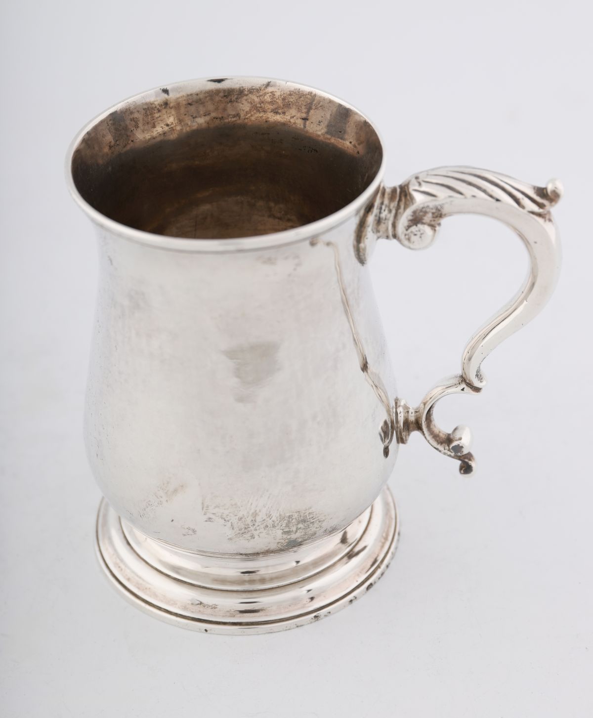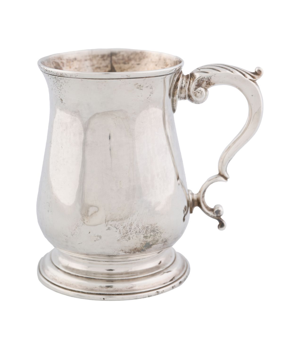 A George III silver mug, William Cripps, London, 1764. Of baluster form with leaf-capped scroll handle, plain body, and stepped foot. Fully hallmarked. 328 g (10 oz)