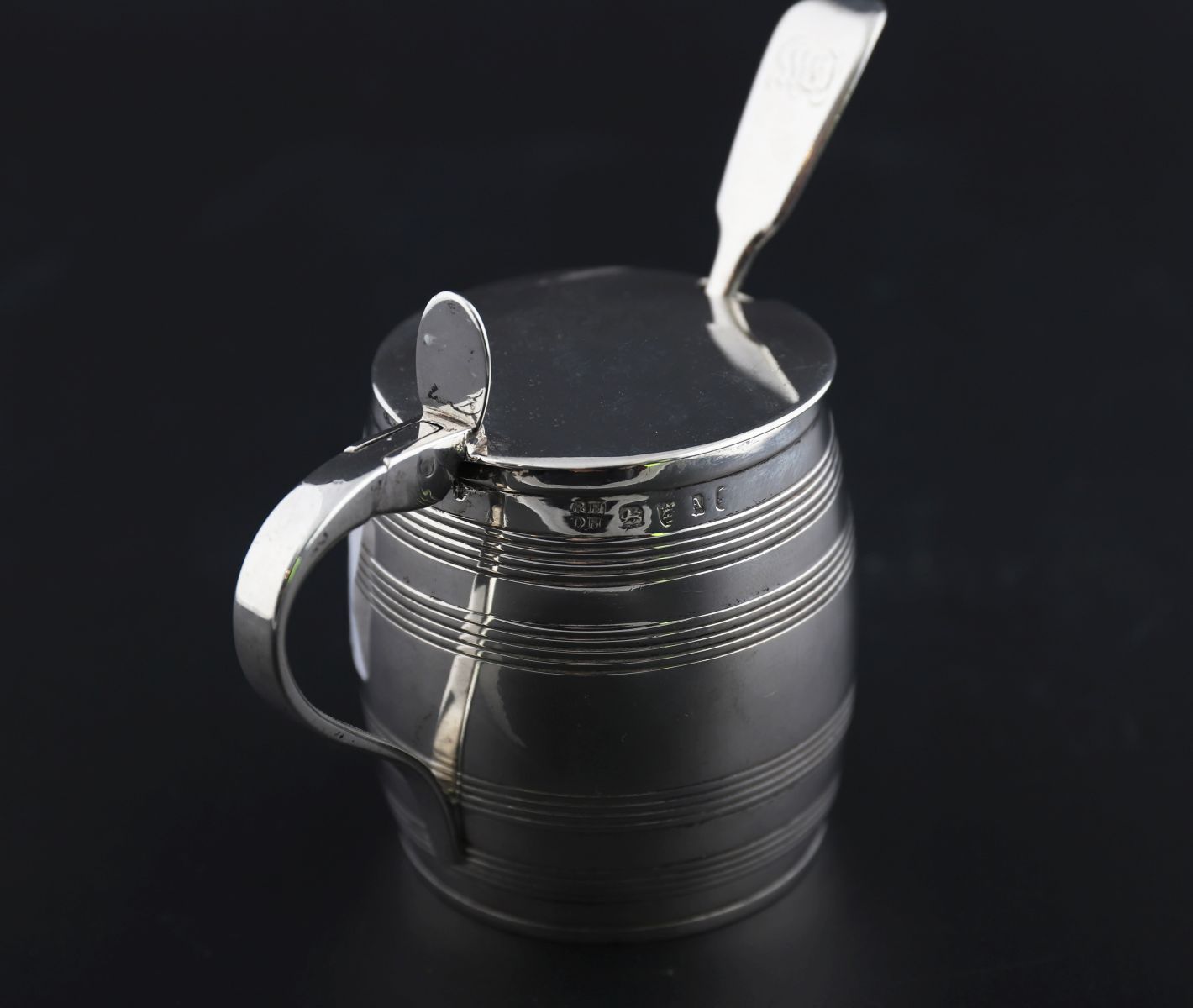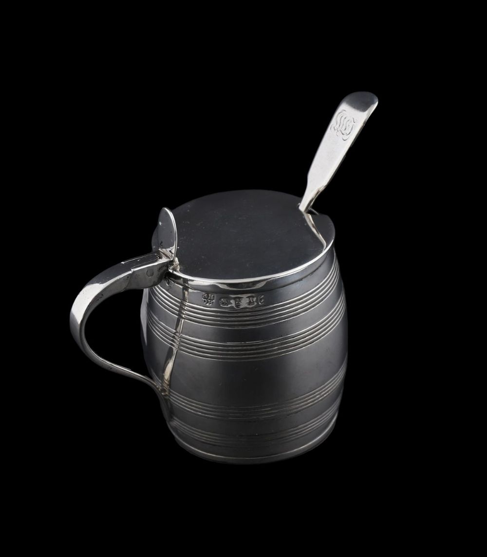 A George III silver mustard pot, Robert & David Hennell, London, 1796. Barrel form with flat cover, engraved initials, gilt interior, blue glass liner, and later non-matching spoon. 3.25 oz