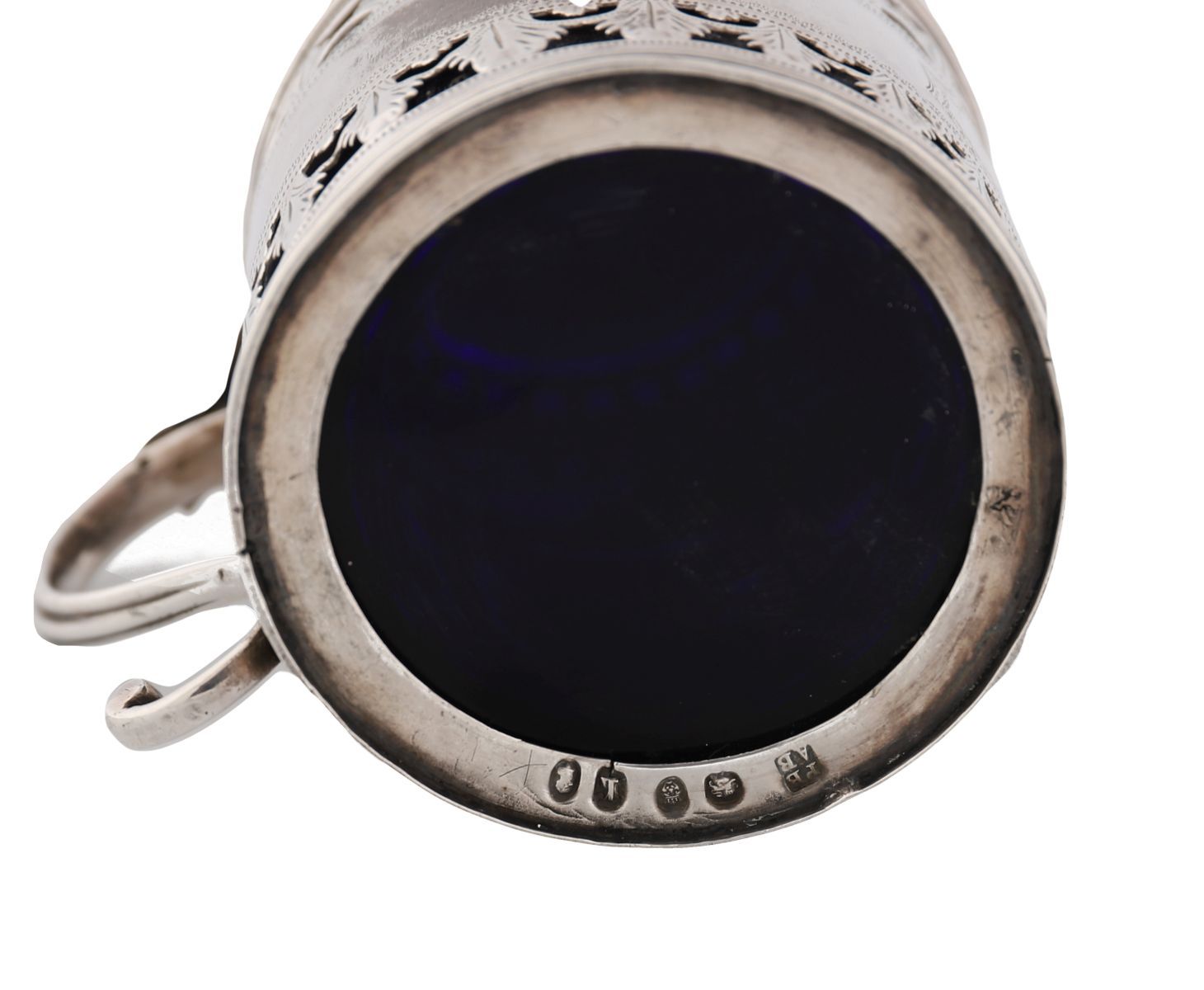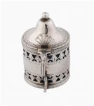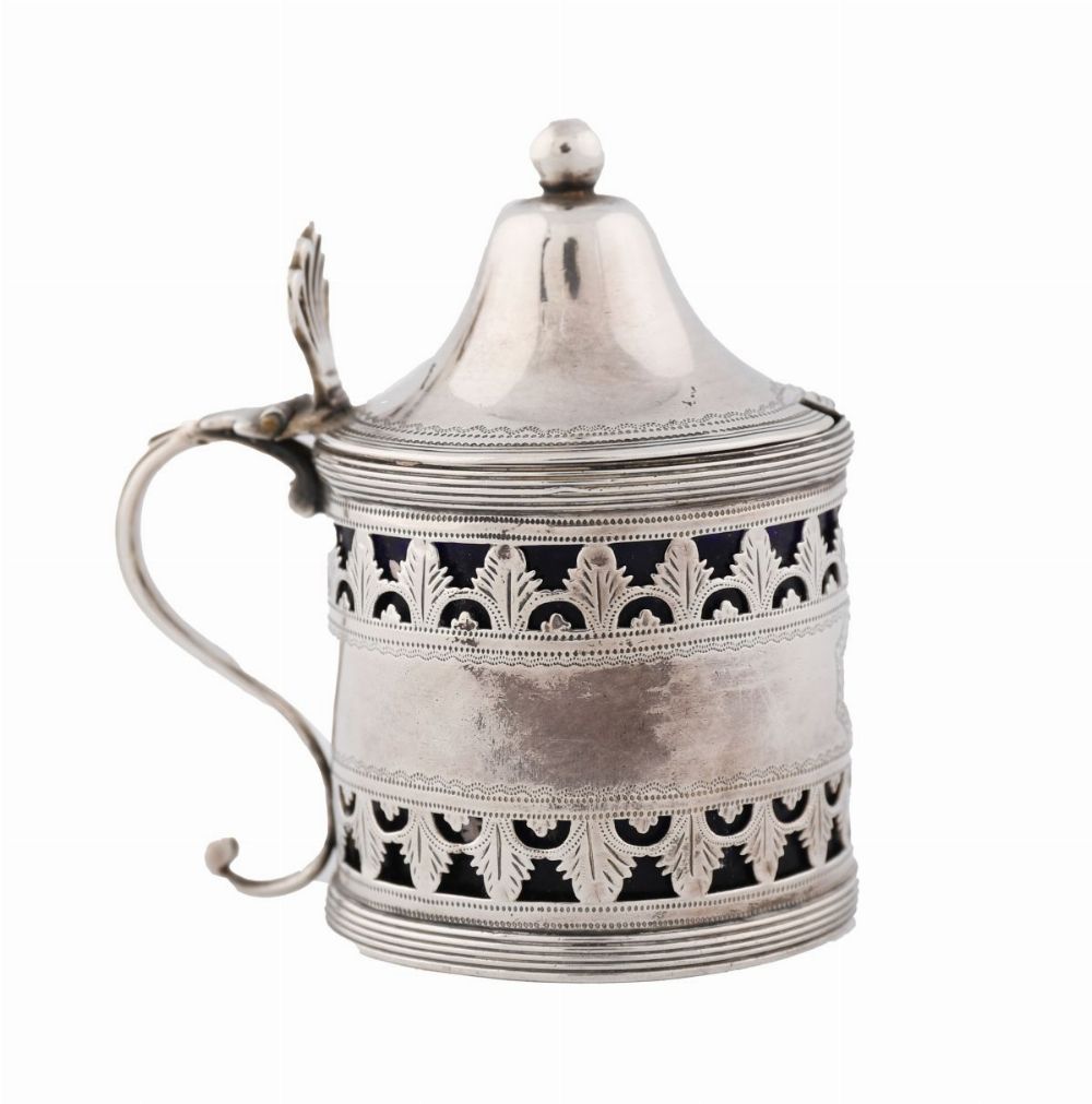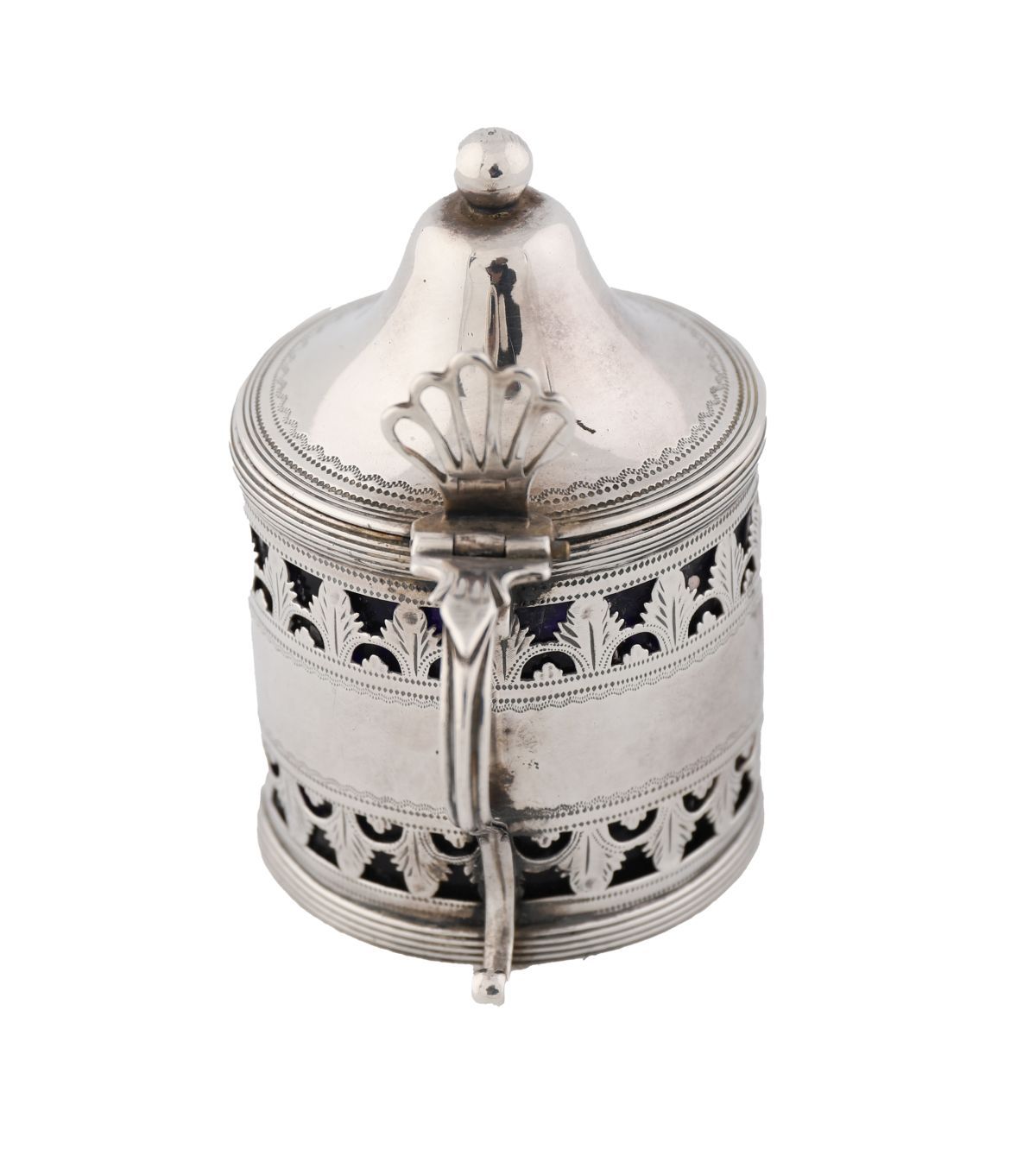 A fine late 18th-century silver mustard pot by Peter and Ann Bateman, of drum form with pierced acanthus banding and reeded borders, fitted with hinged domed cover and scroll handle. 250 grams