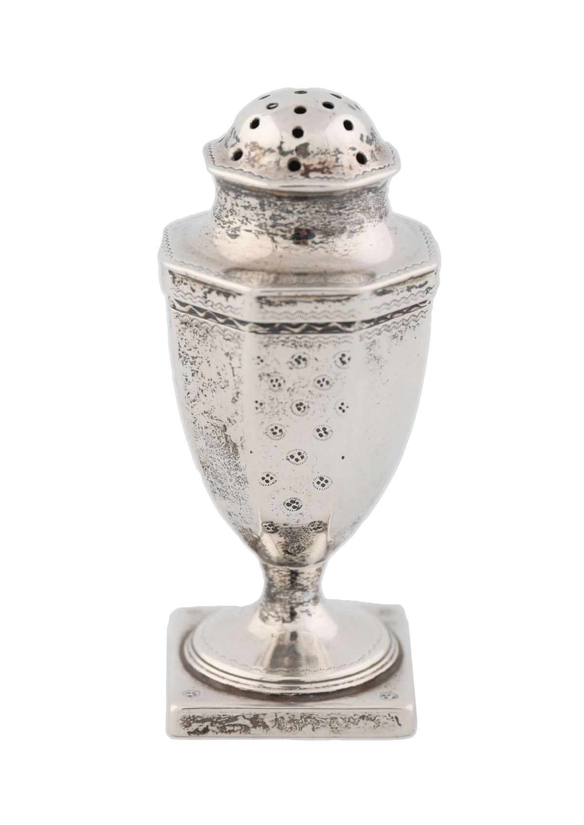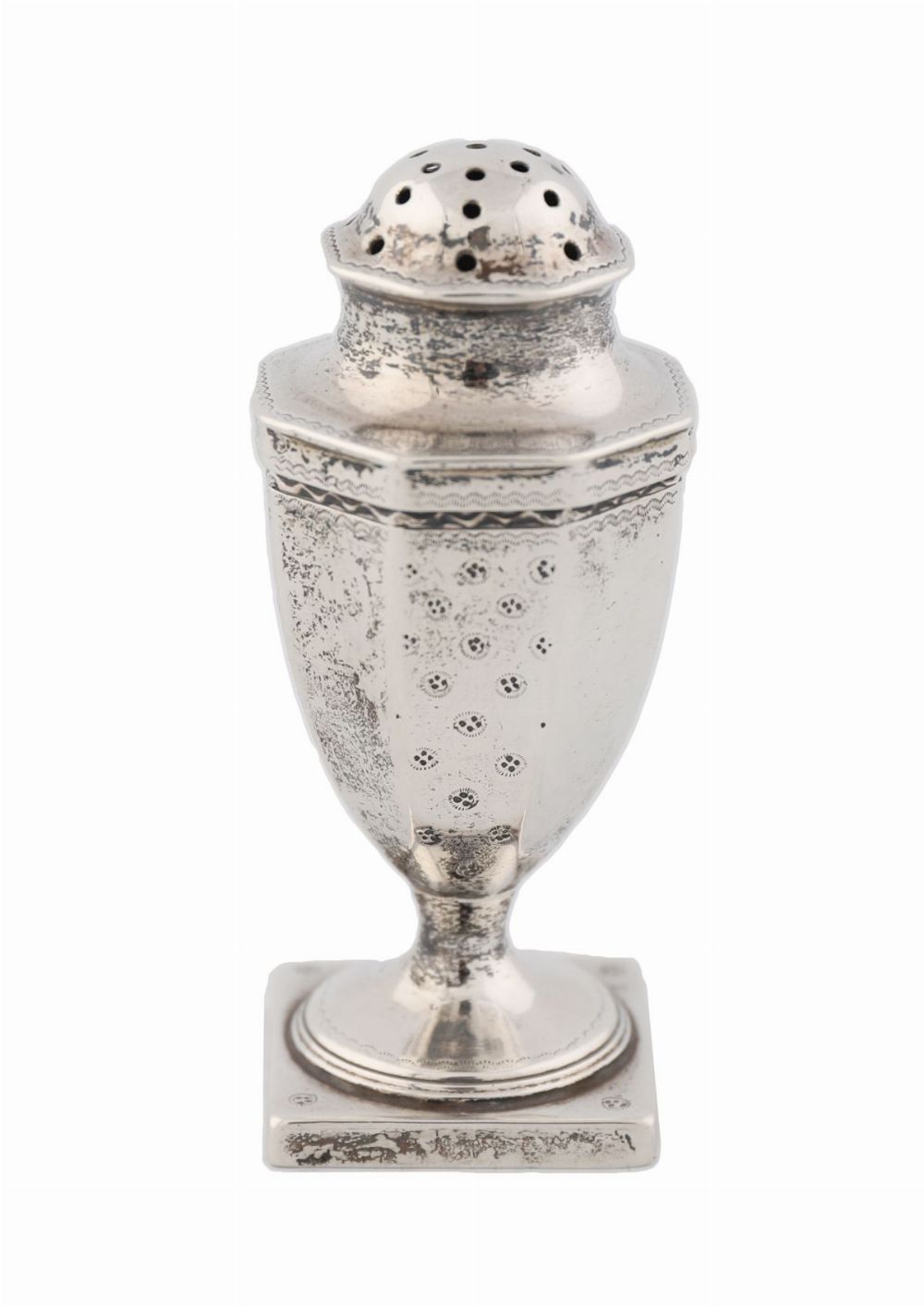 A small George III silver pepperette of urn form on square pedestal base with pierced domed cover and beaded borders. Weight: 48 g