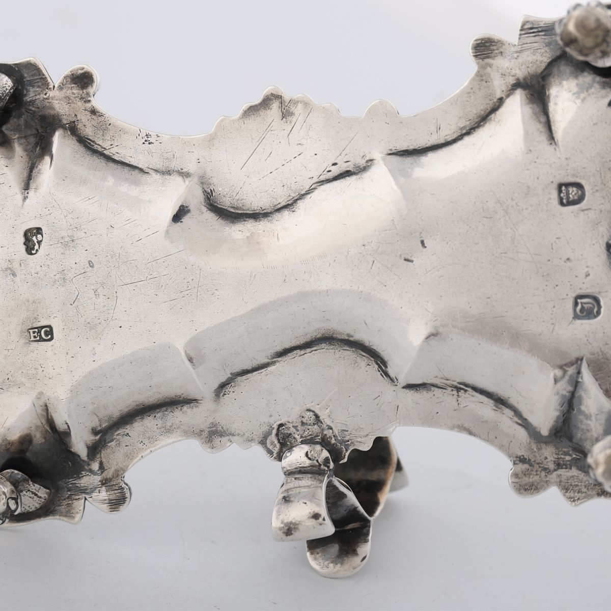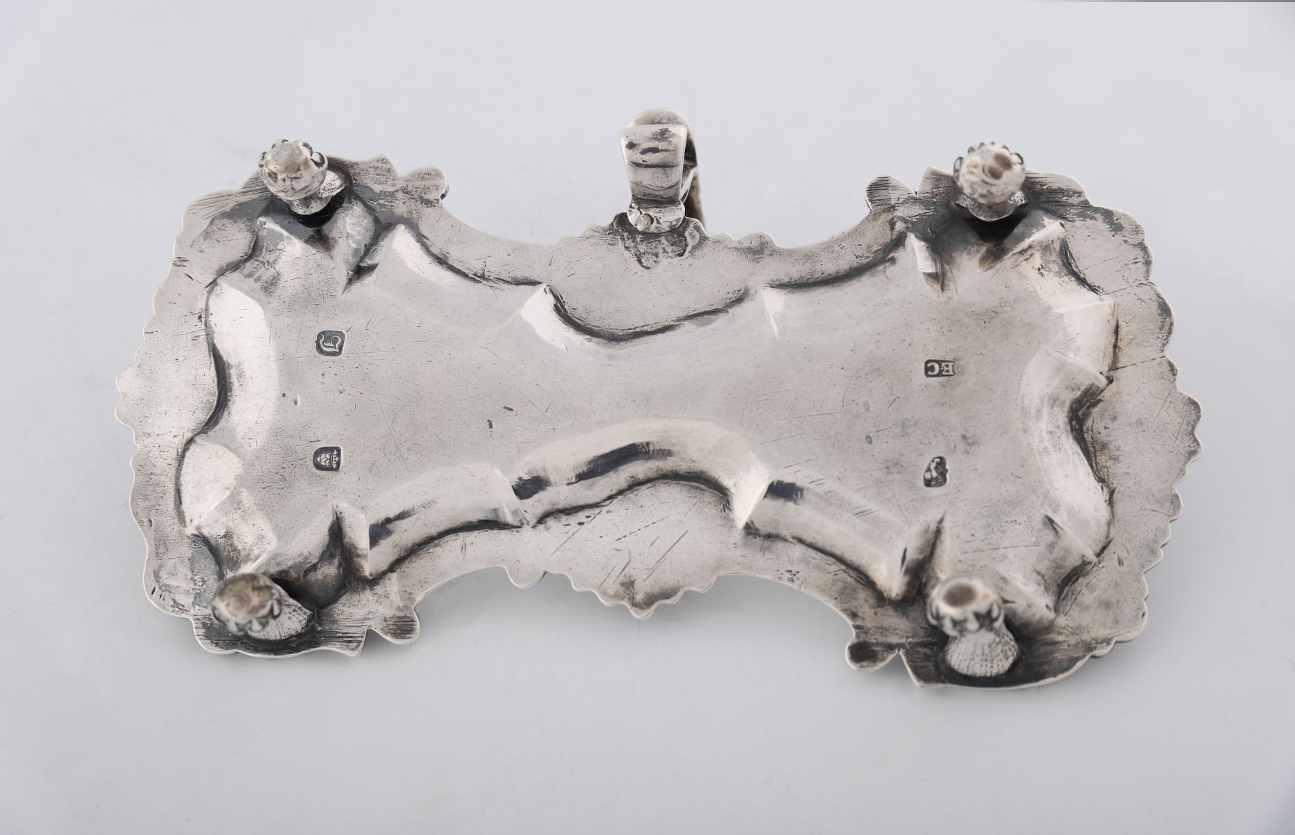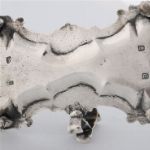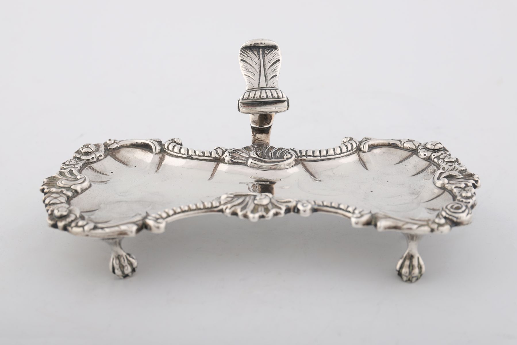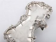 Waisted rectangular tray with shell, scroll, floral and gadroon border, leaf-capped scroll handle, raised on ball and claw feet, engraved with the crest of a bear’s paw holding a flag. weight 12 oz (372 g)