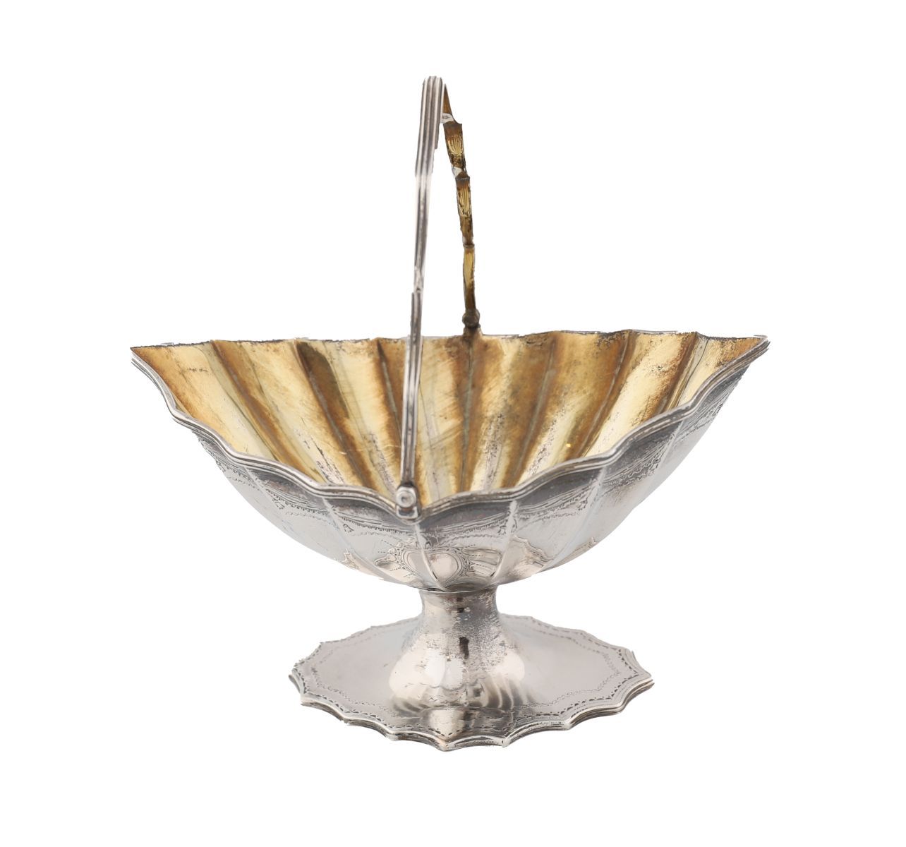 A George III silver sugar basin, Henry Greenway, London, 1789. Of shaped oval section with overhead handle, engraved with a coat of arms, on a pedestal foot. 6 oz.