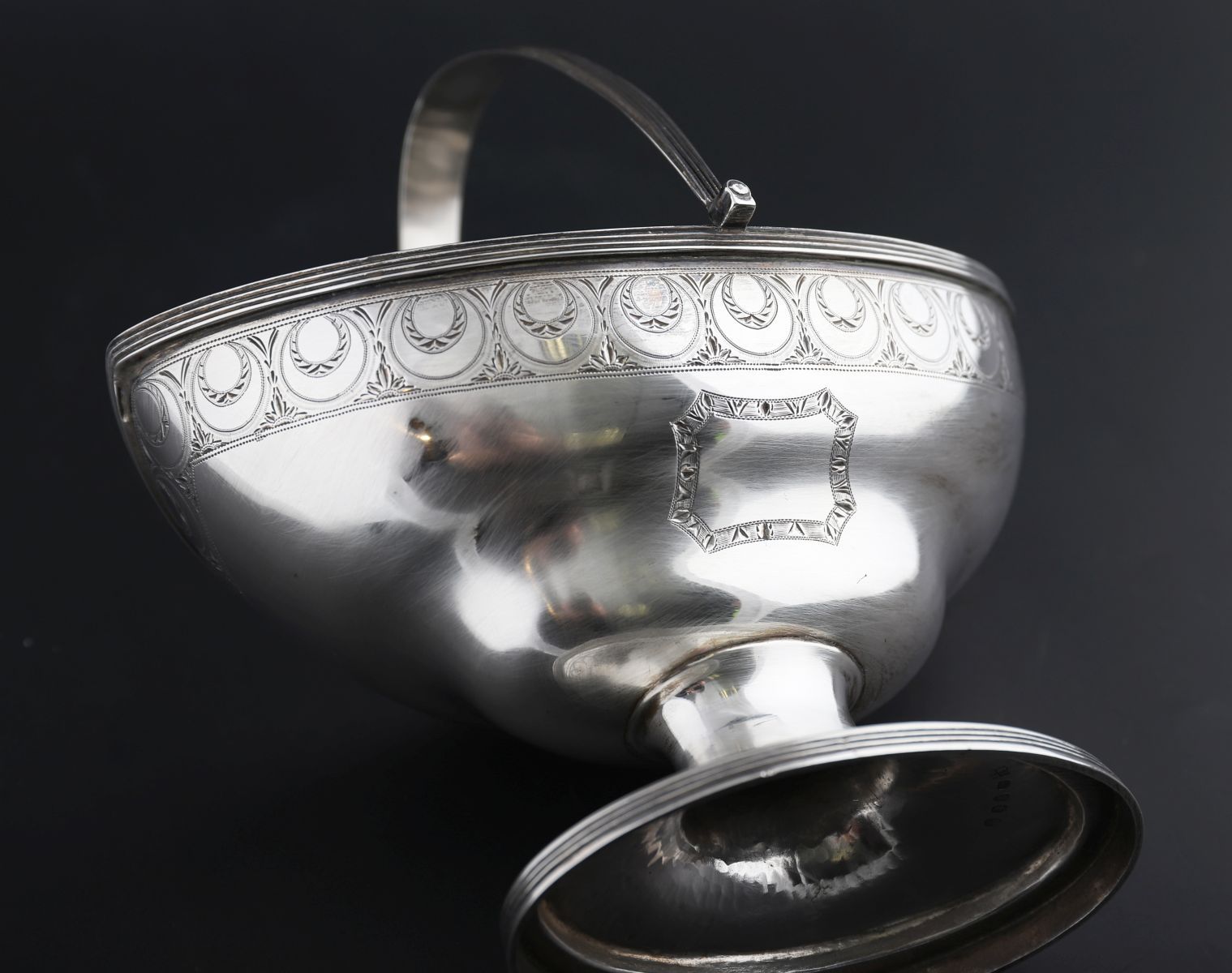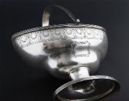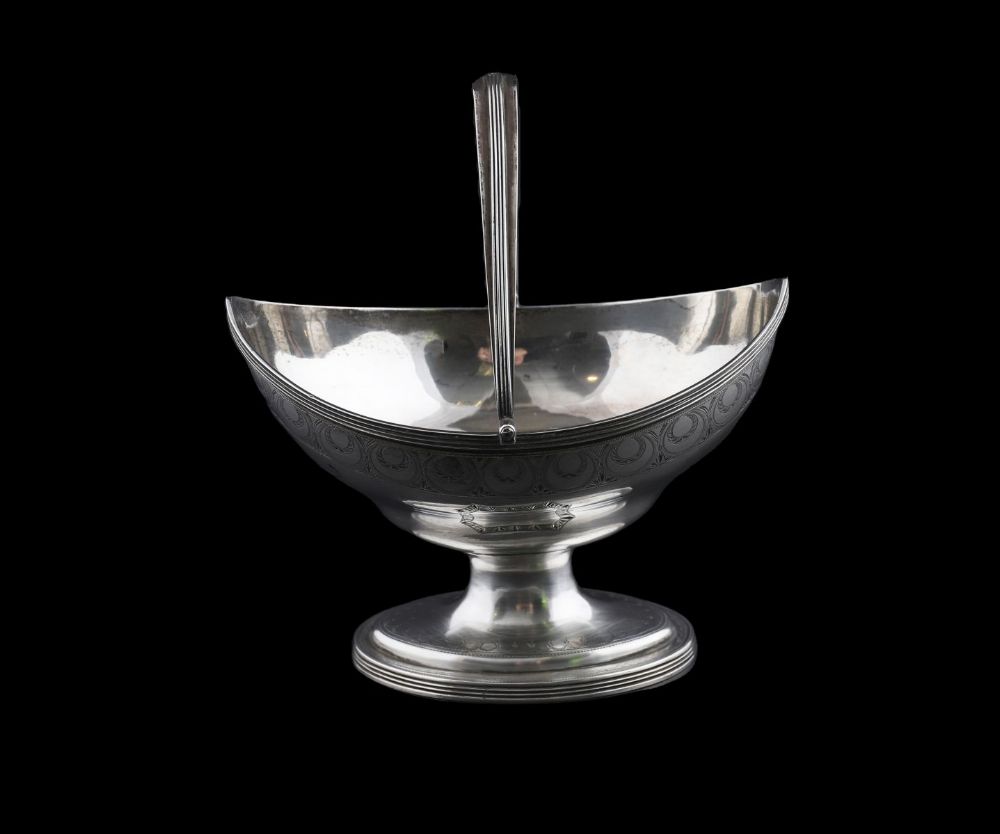 A George III silver sugar basket, Peter & Ann Bateman, London, 1794. Of oval form, crisply bright-cut with crescent band above a ram’s head crest, reeded borders, and swing handle. 246 g (7 oz 18 dwt)