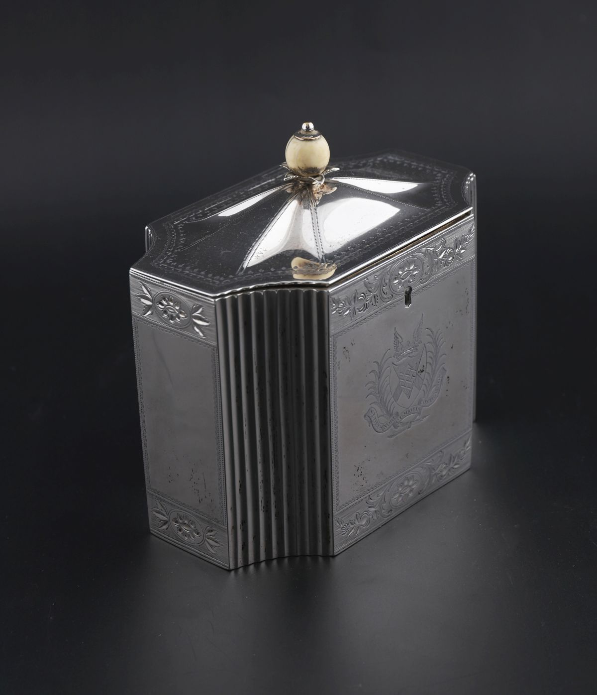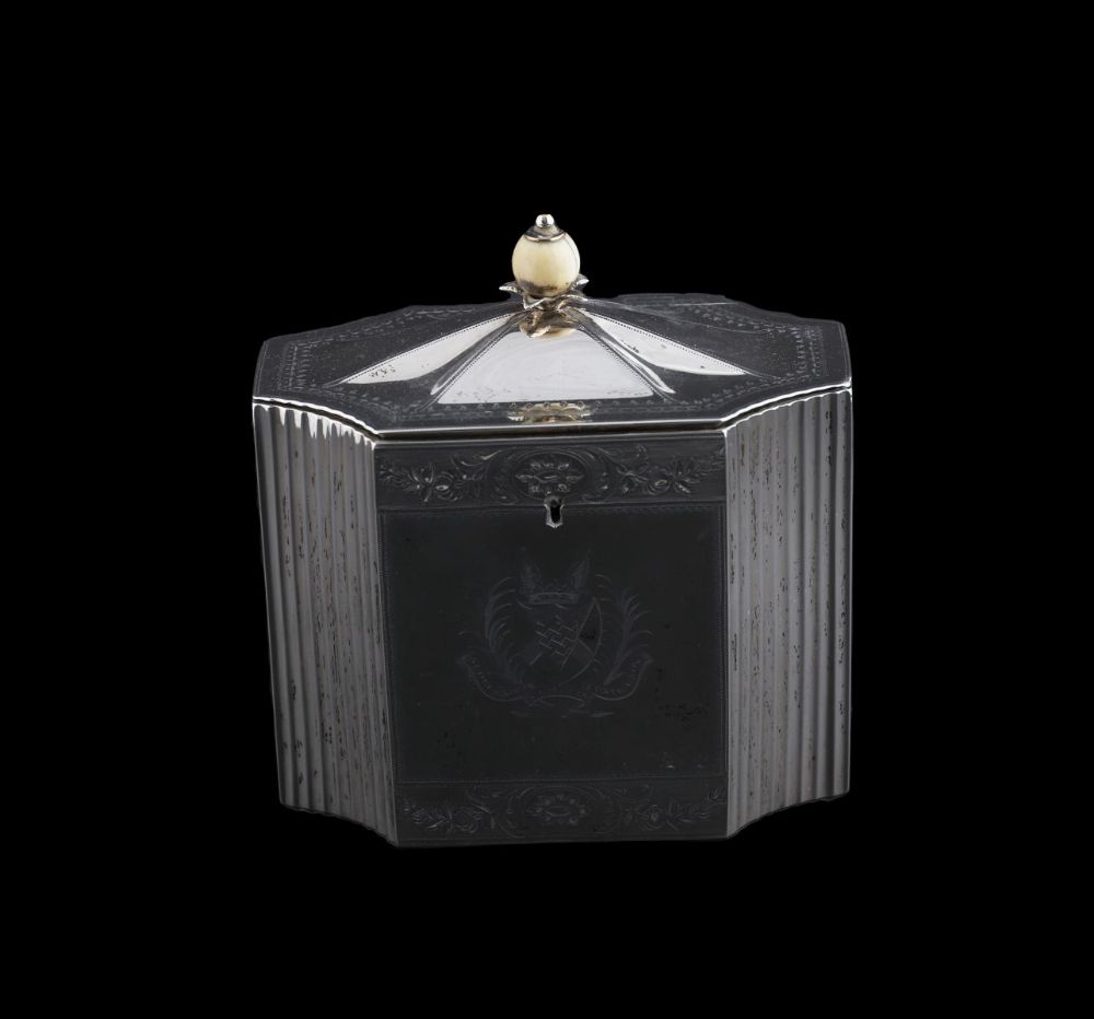 A George III silver tea caddy, William Abdy, London, 1799. Of shaped rectangular form with bright-cut engraved hinged cover and sides, interior divider, and front panel engraved with coat of arms and crest, ivory finial to lid. 602 g (19 oz 6 dwt)