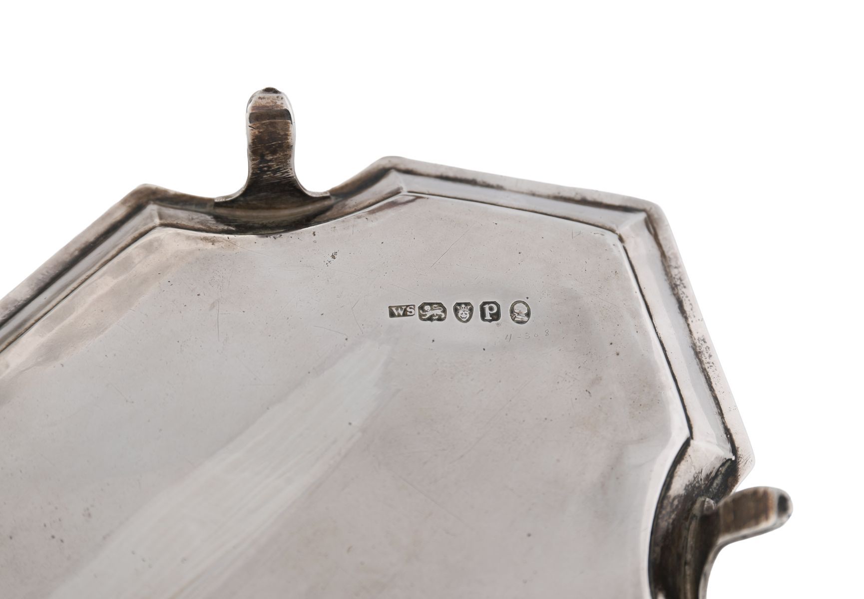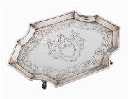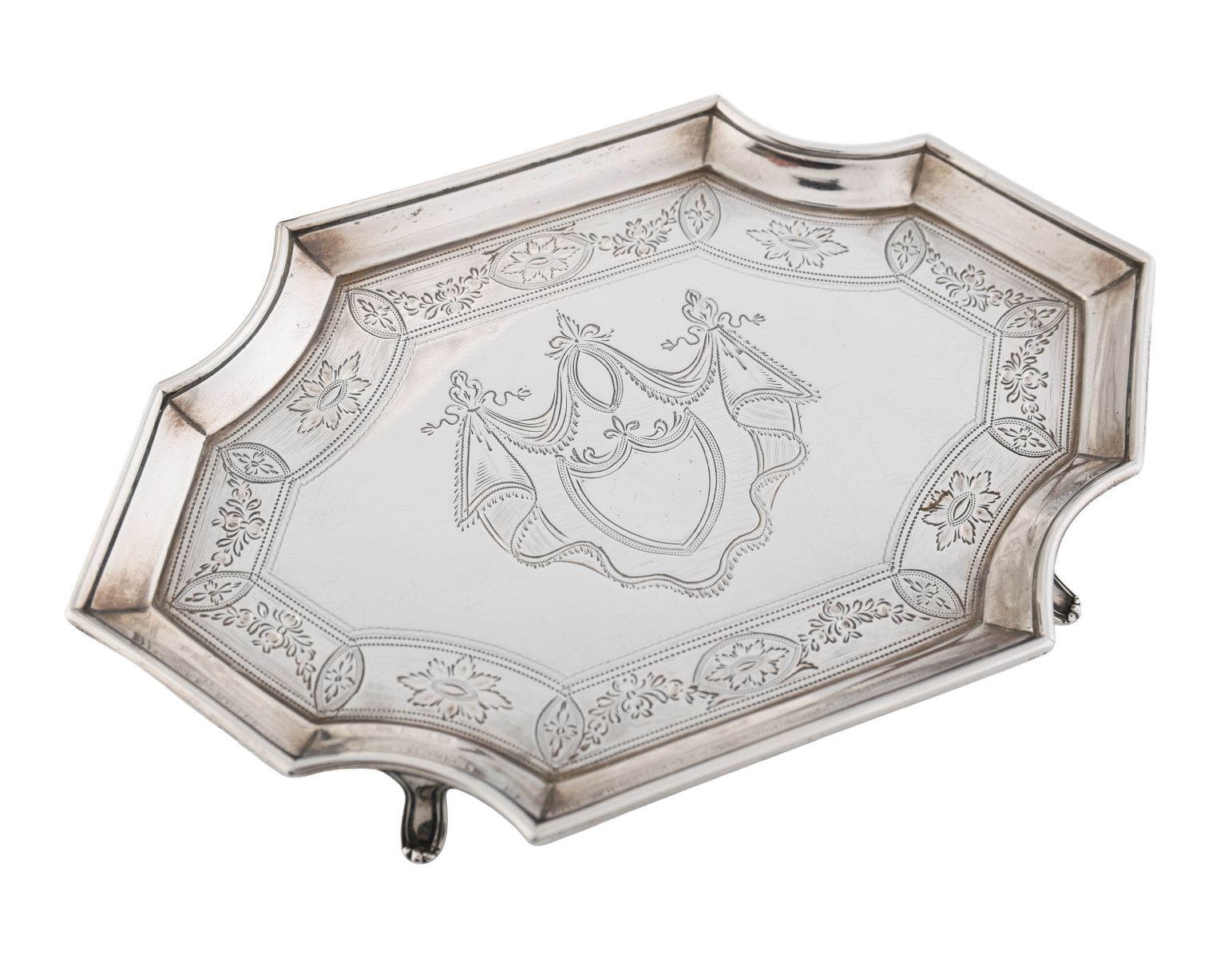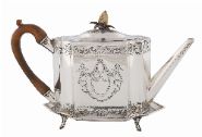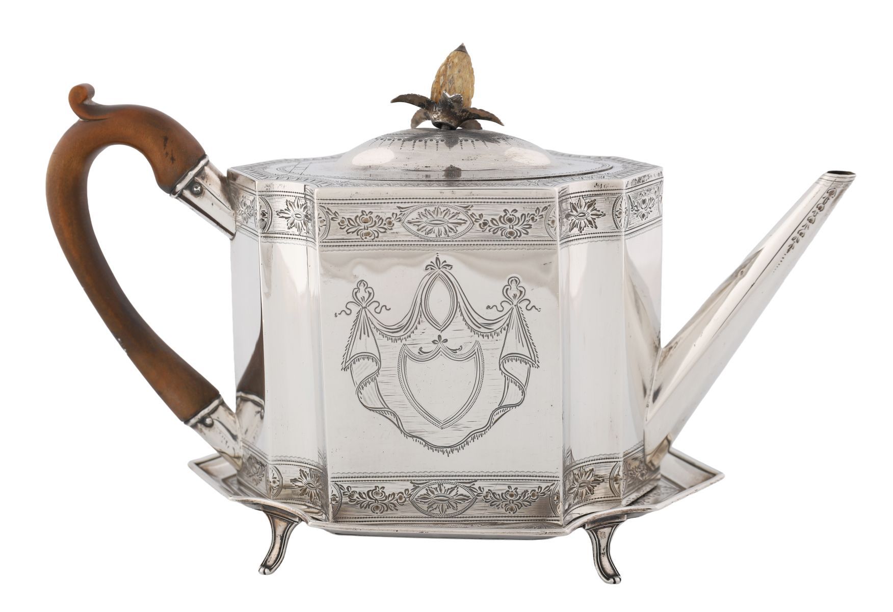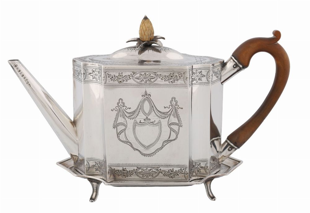 Shaped octagonal teapot with incurved angles, the stand on four bracket feet. The teapot features a straight spout and hinged domed cover with silver and ivory pineapple finial, both pieces bright-cut engraved with rosette and foliage borders on a hatched ground, each with a vacant shield cartouche within drapery mantling.