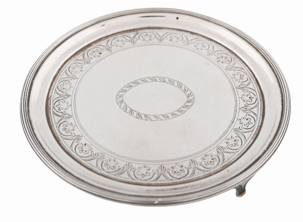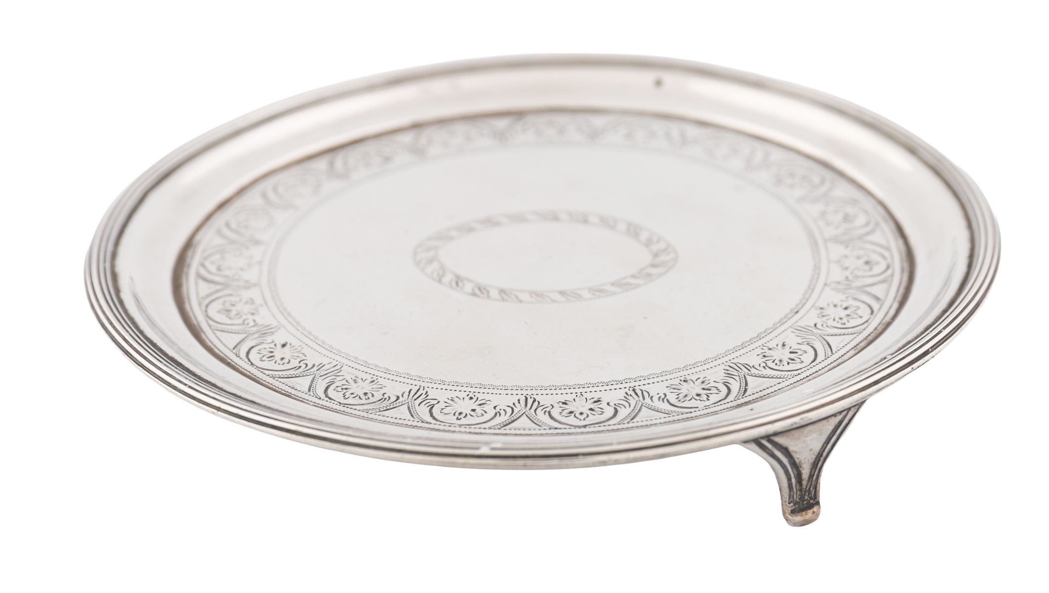 Circular silver waiter with reeded border, engraved with foliate scroll decoration, raised on three bracket feet. 6.2 oz.