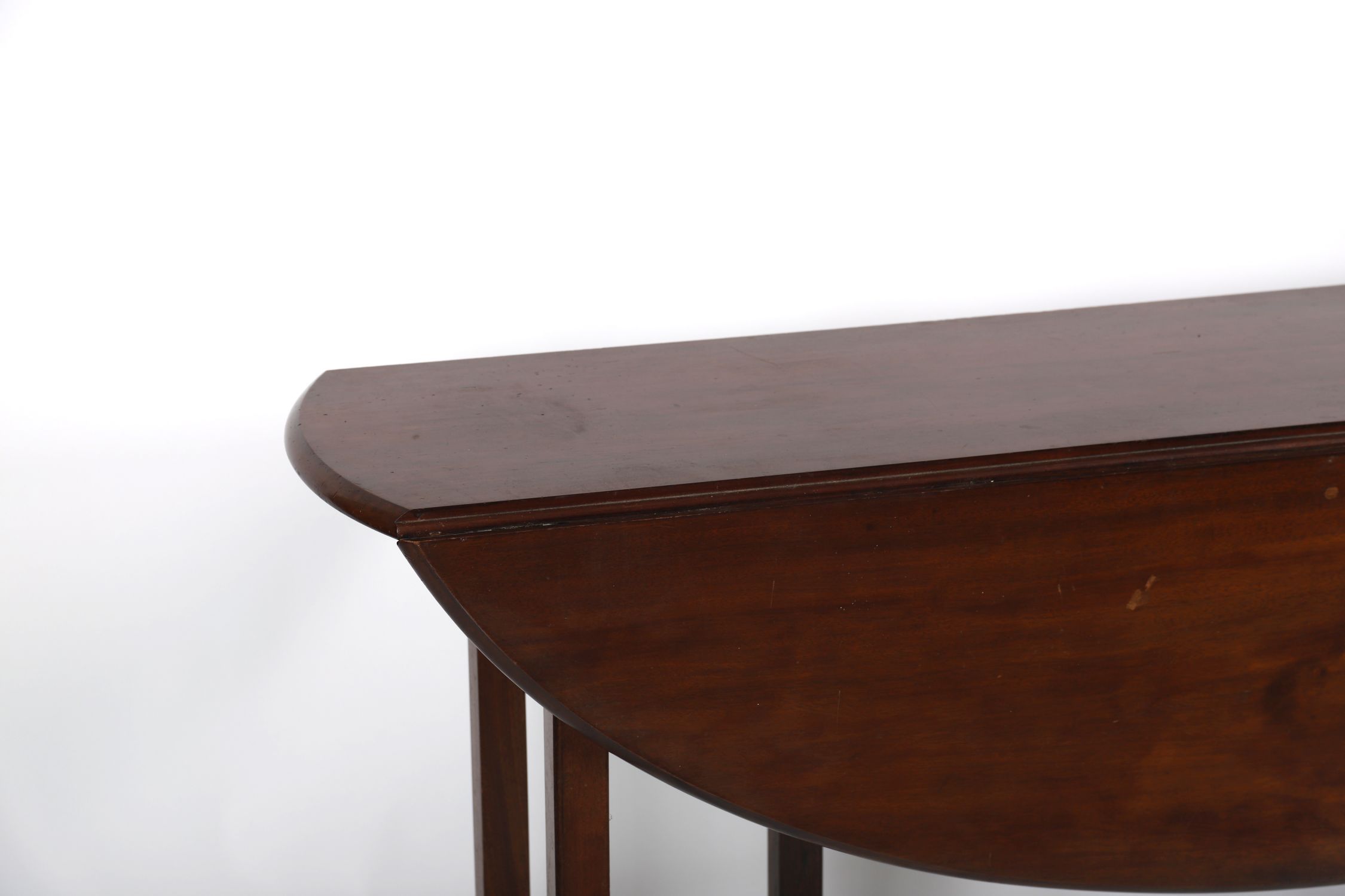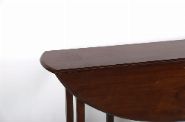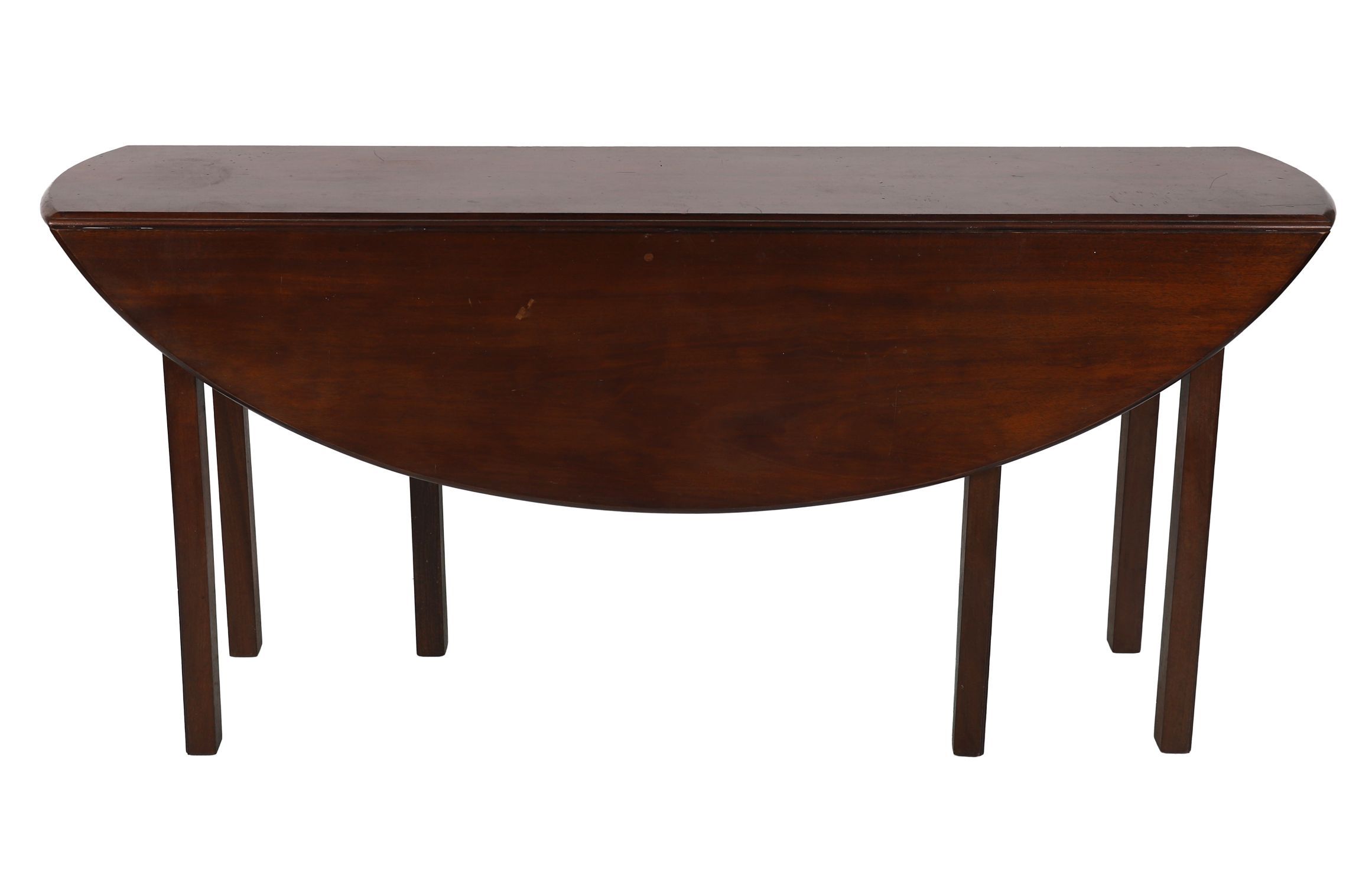 George III style mahogany hunt table, of demi-lune drop-leaf form, raised on square tapered legs. The hinged leaves open to form a circular dining surface, typical of tables designed for entertaining during hunts. Rich patina and colour throughout.
