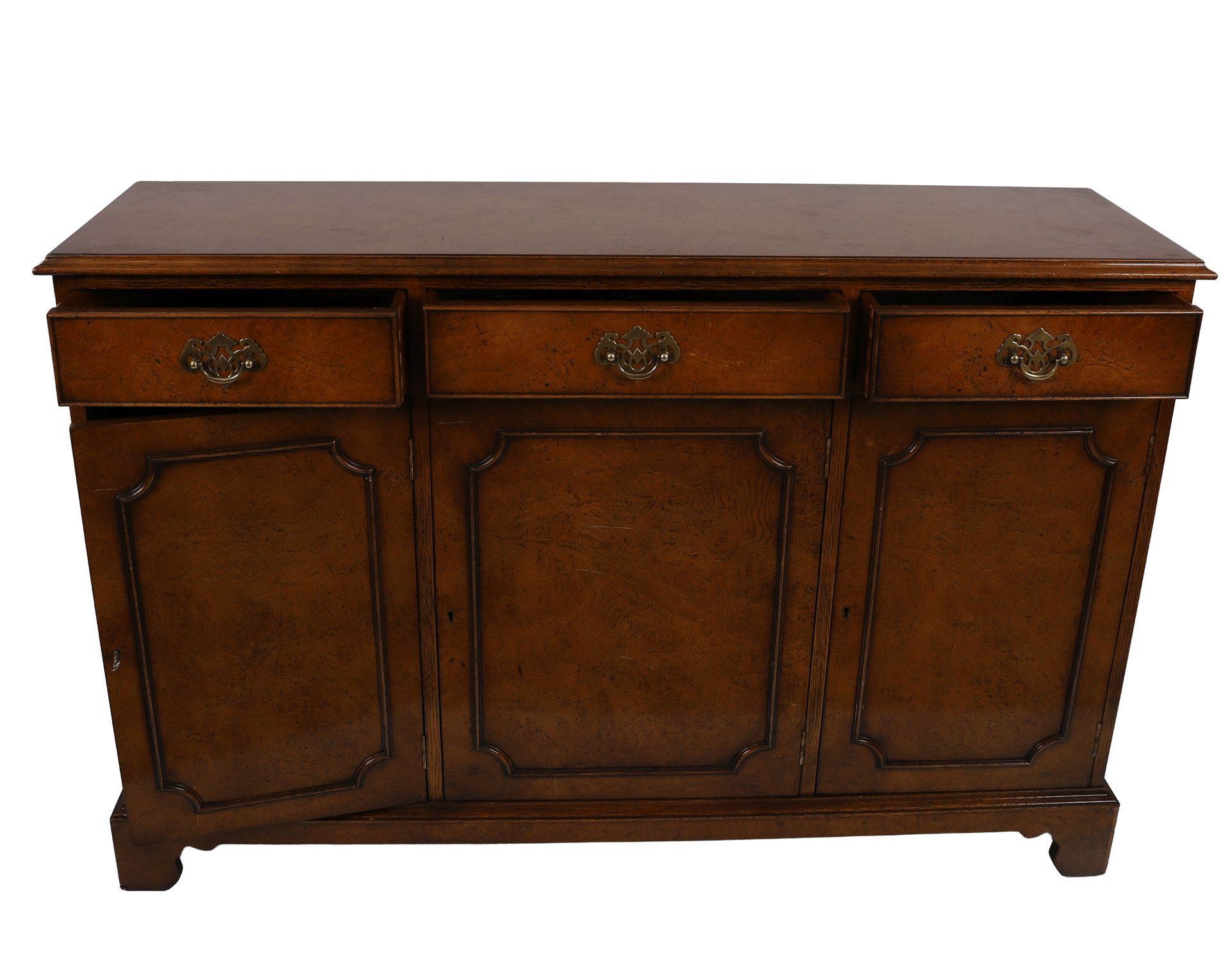 A 20th-century walnut veneered sideboard, with three drawers over panelled cupboard doors, brass handles, and bracket feet.