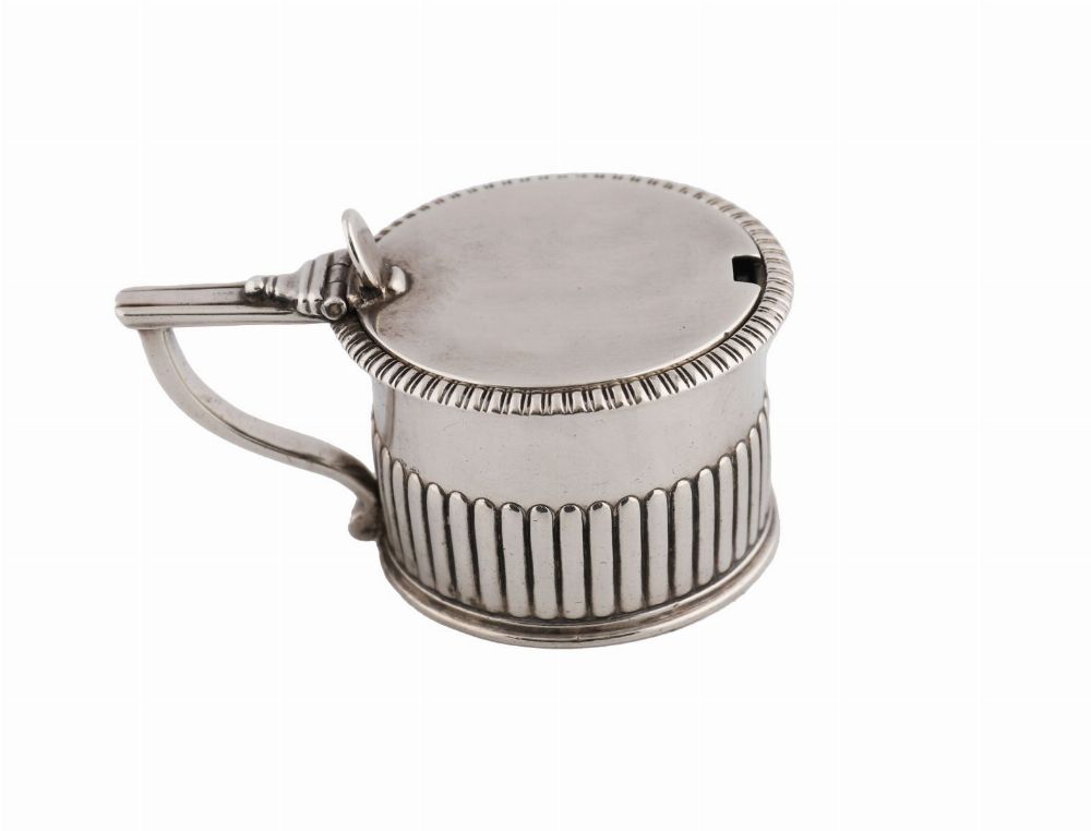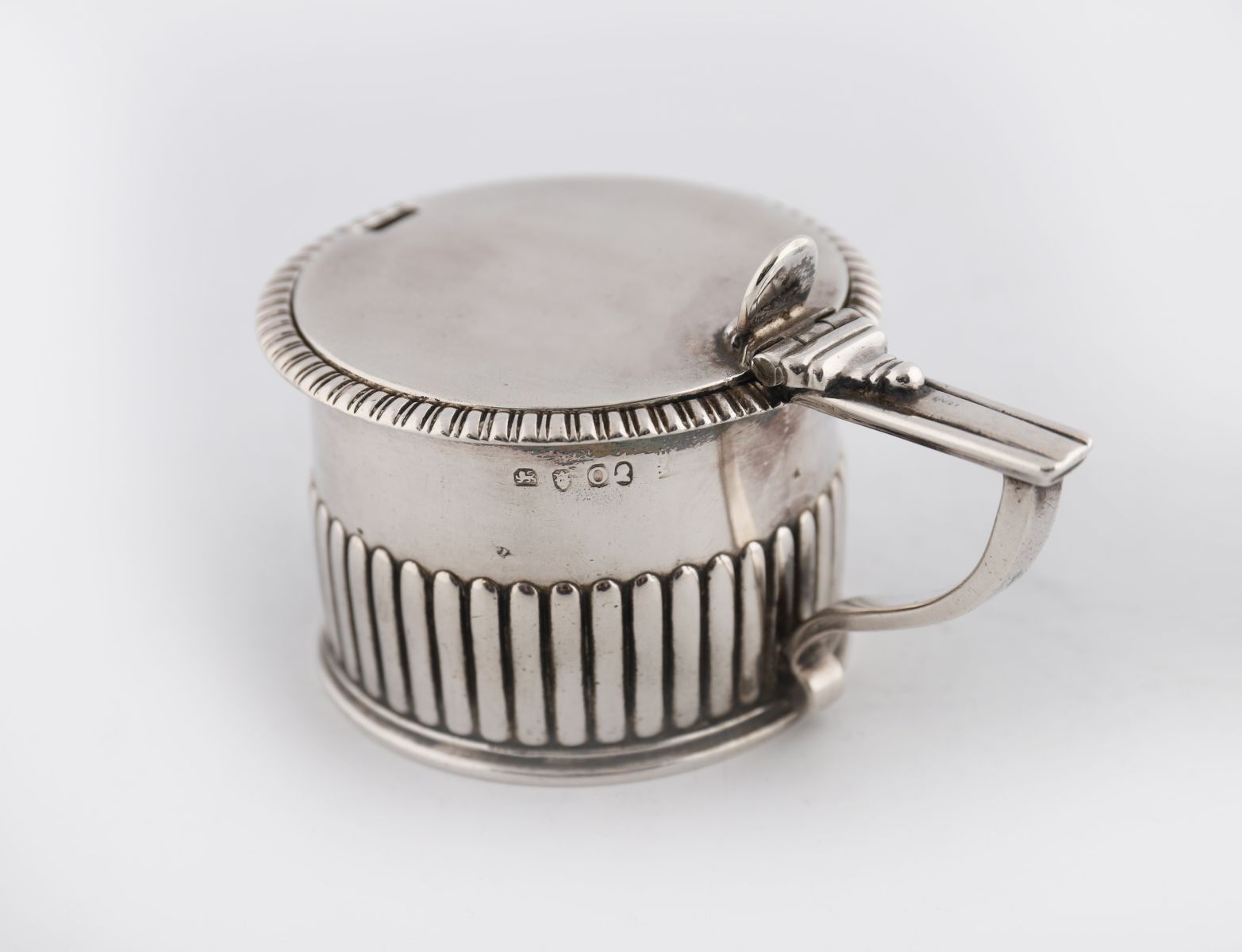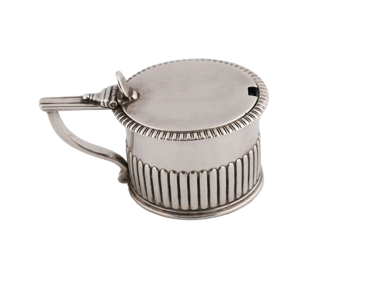 A George IV half-fluted, drum-shaped mustard pot by William Eley II, with plain hinged lid and simple loop handle, resting on a flat base. Weight 5.49ozs