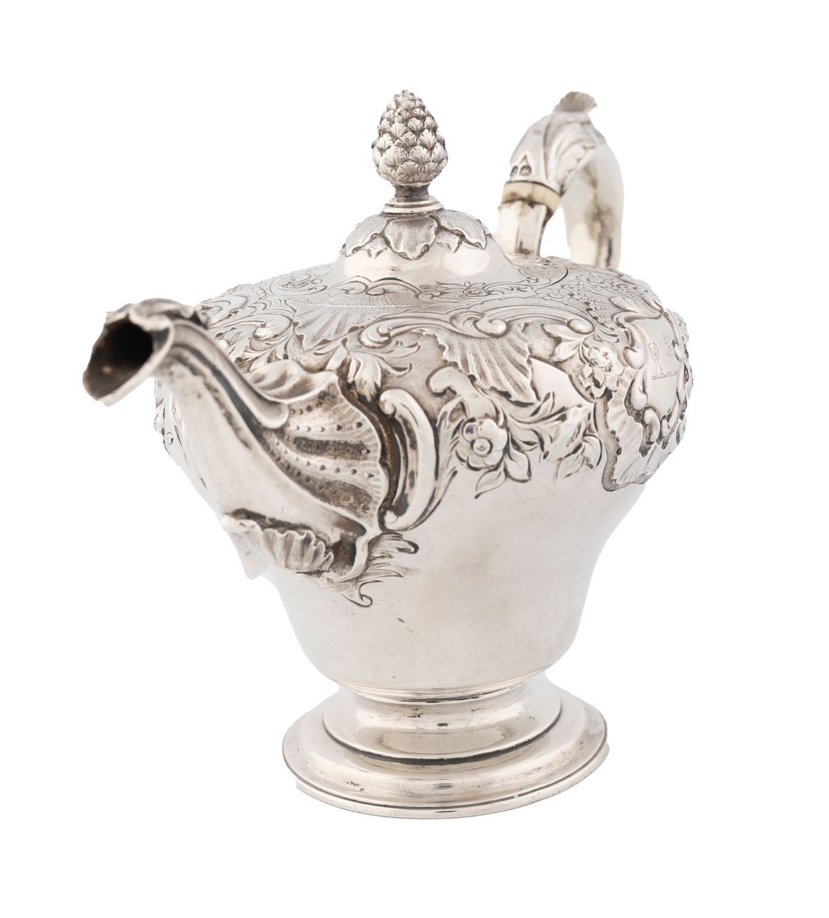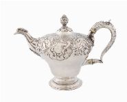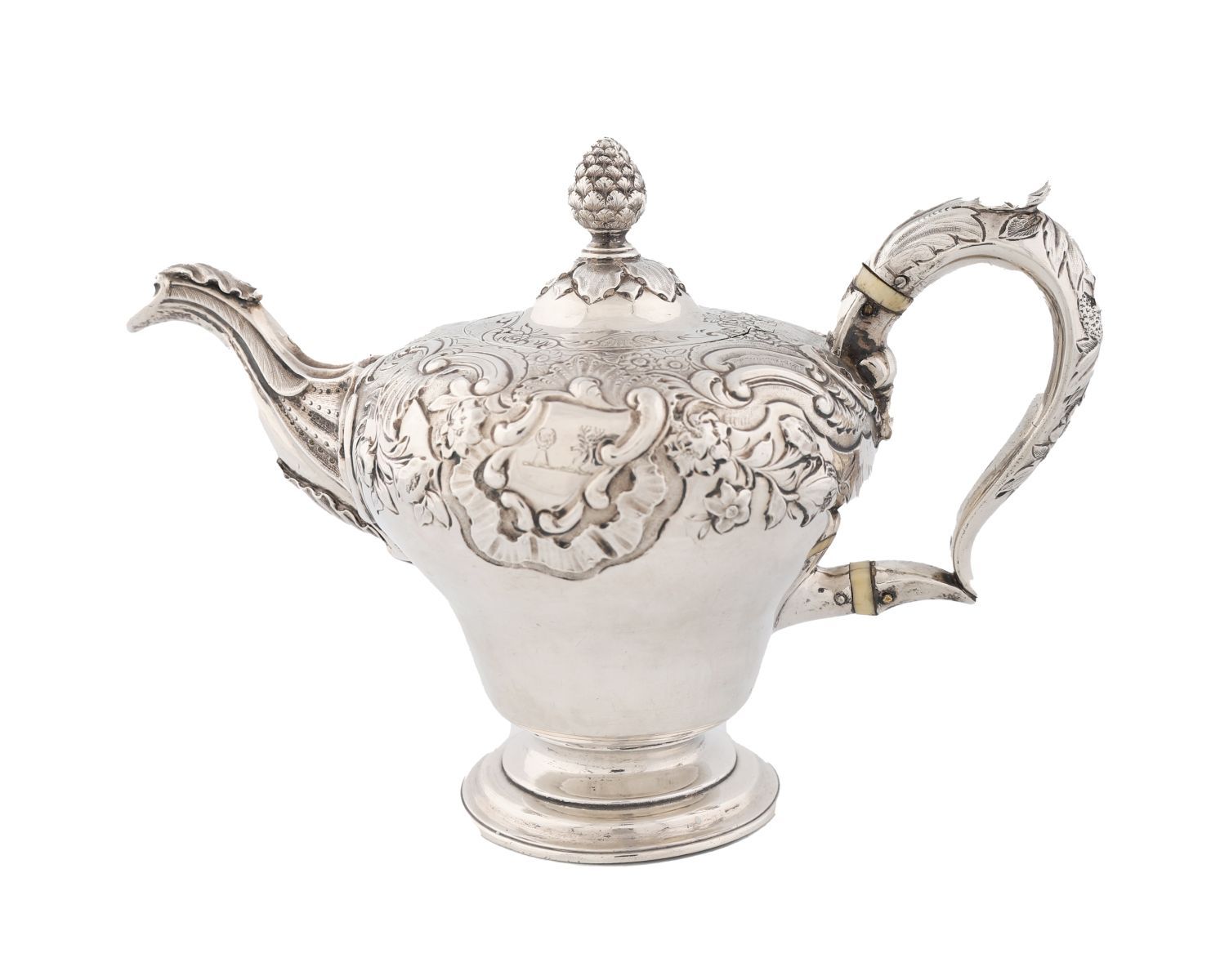 A George IV silver teapot, Charles Fox, London, 1825. Of inverted pear shape on spreading foot, with leaf-capped handle and spout, artichoke finial, part chased with C-scrolls, rocaille, and foliage, engraved with coat of arms. weight 19.5 oz gross