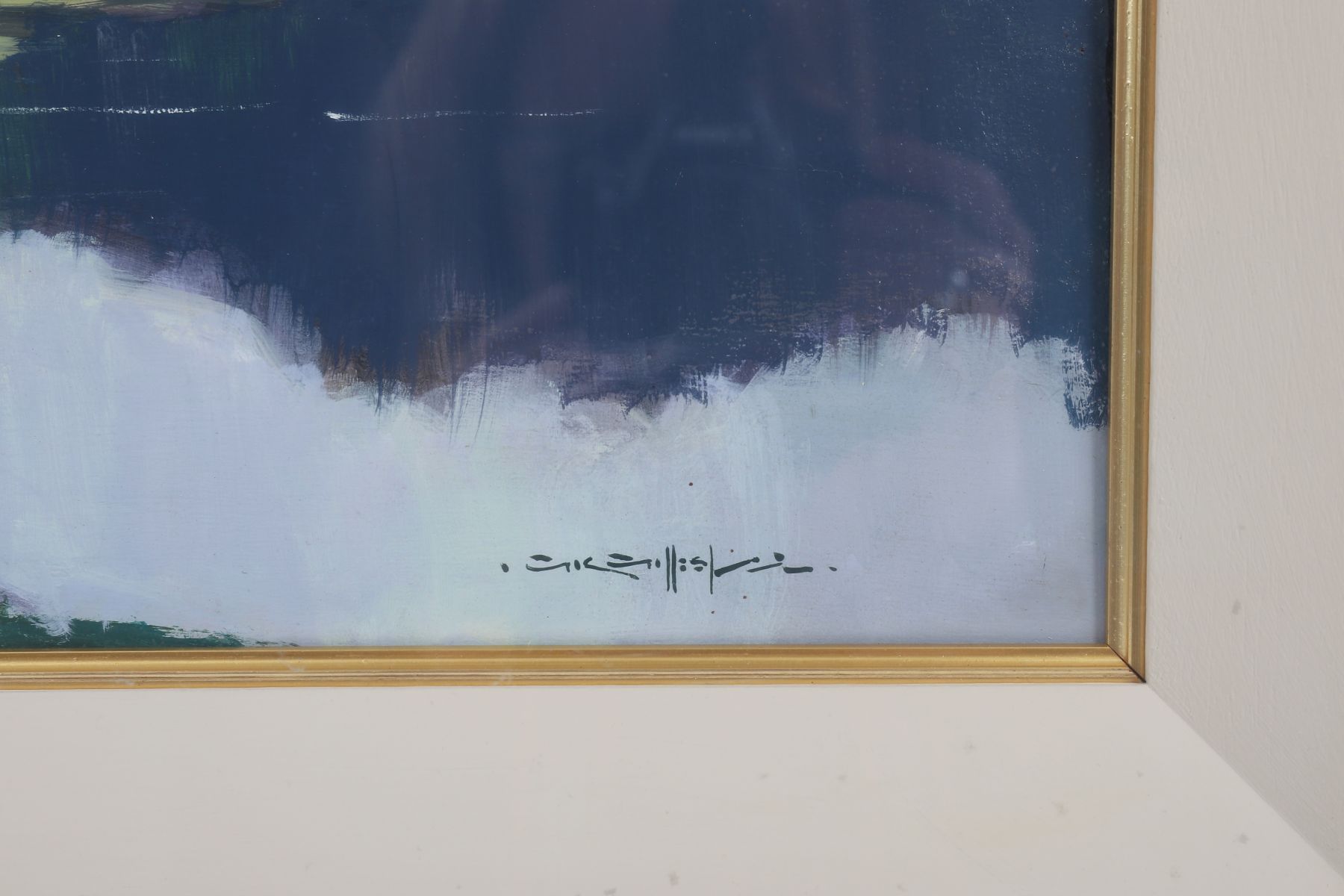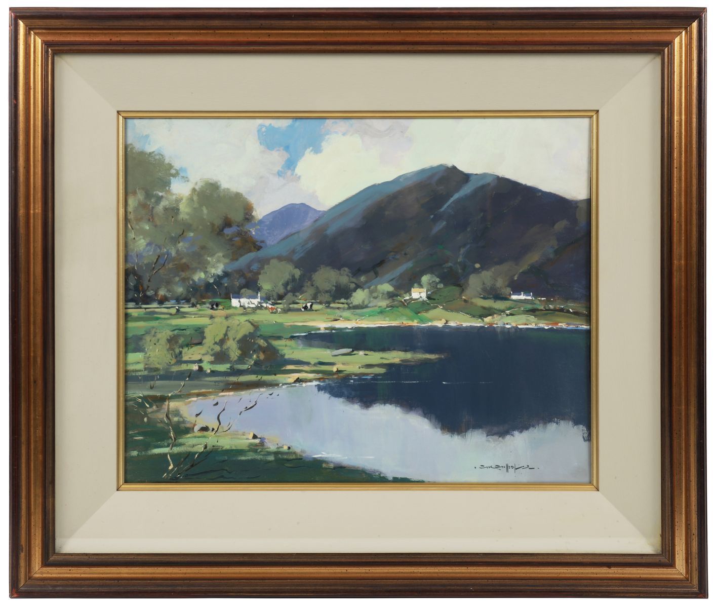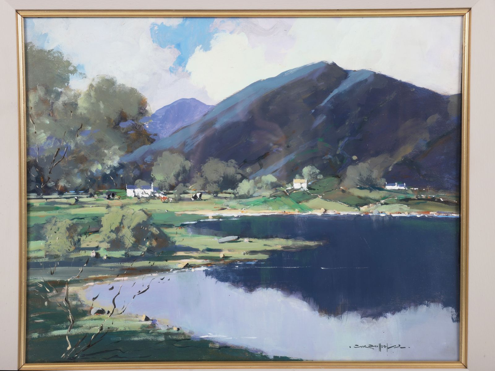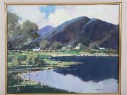 A tranquil landscape depicting reflective waters beneath the Donegal hills. Gillespie’s subtle brushwork and tonal modulation capture the calm atmosphere and shifting northern light of the Irish countryside.