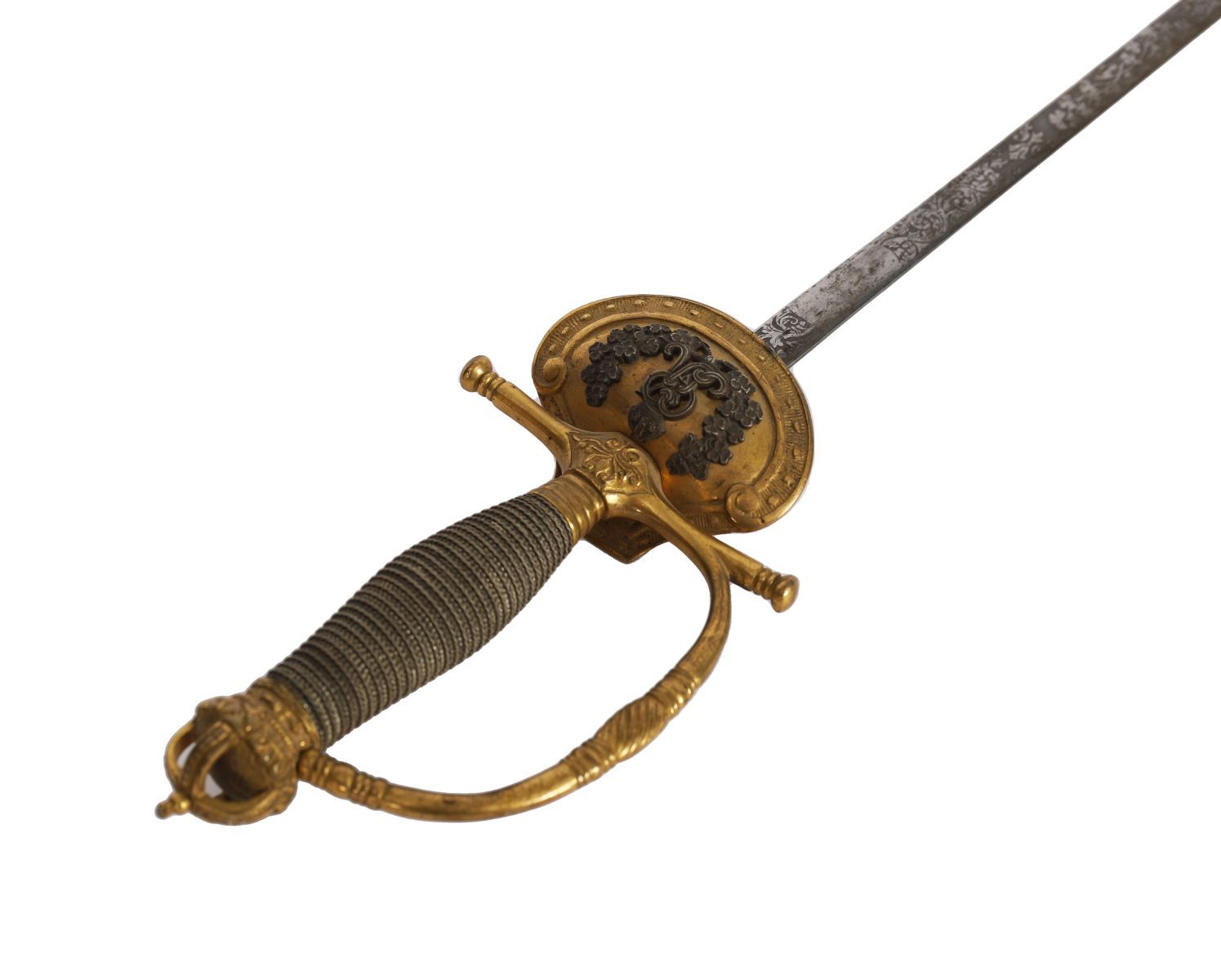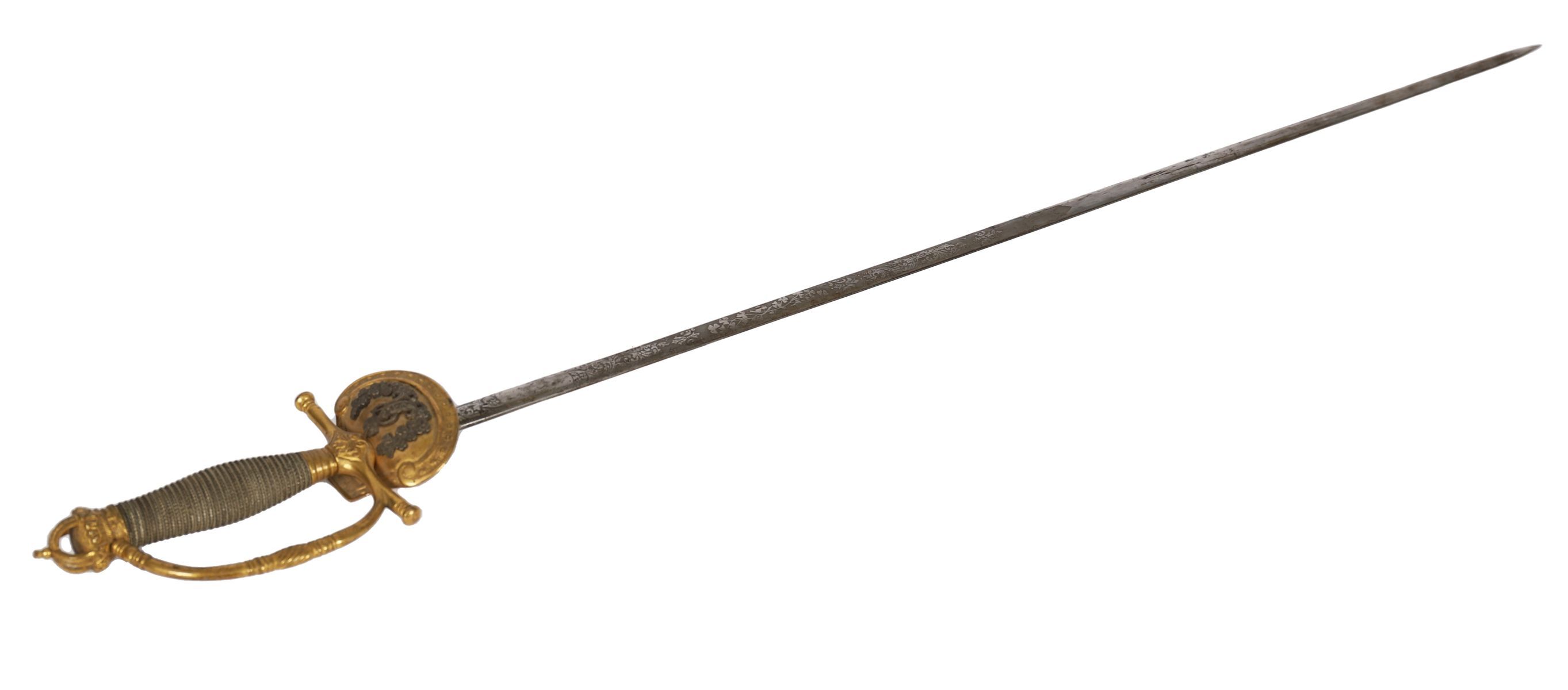 With gilt brass hilt incorporating crowned royal cypher, wire-bound grip and steel blade, in ceremonial court pattern.