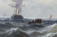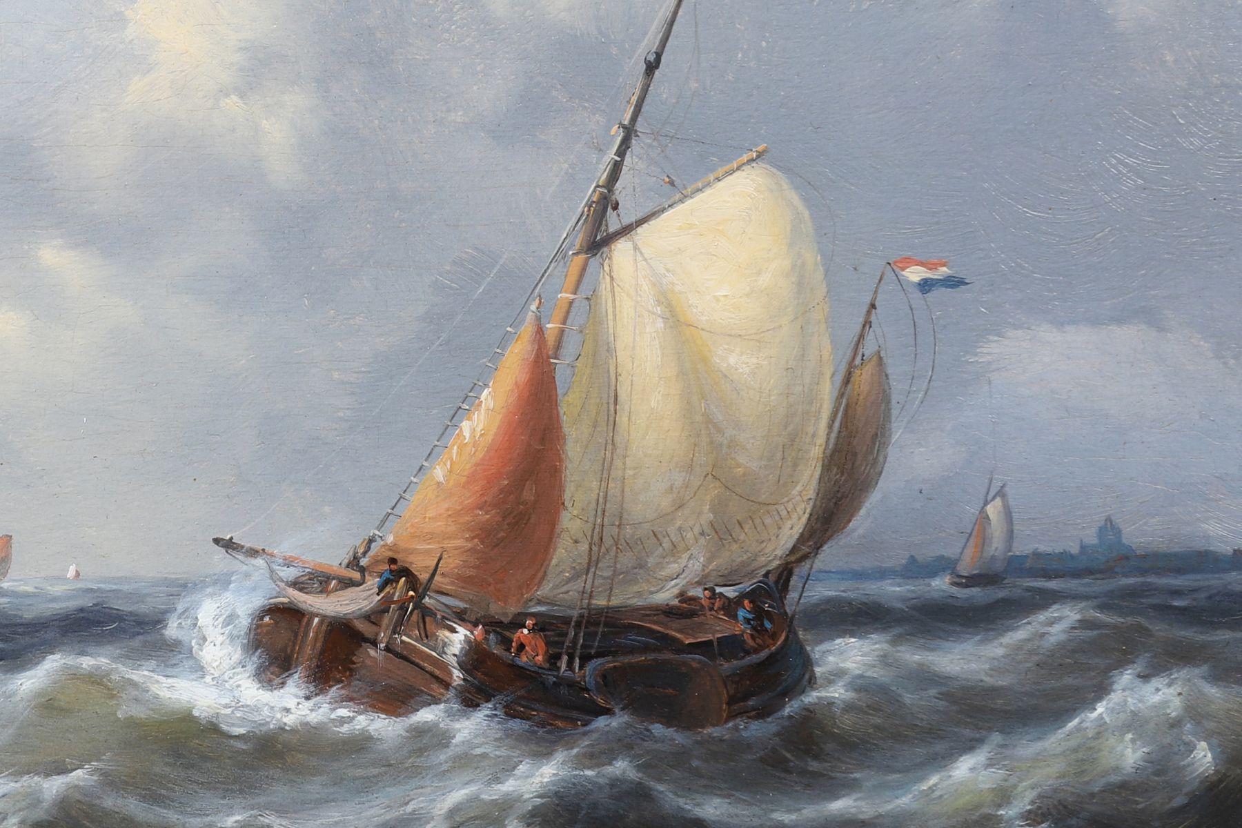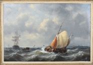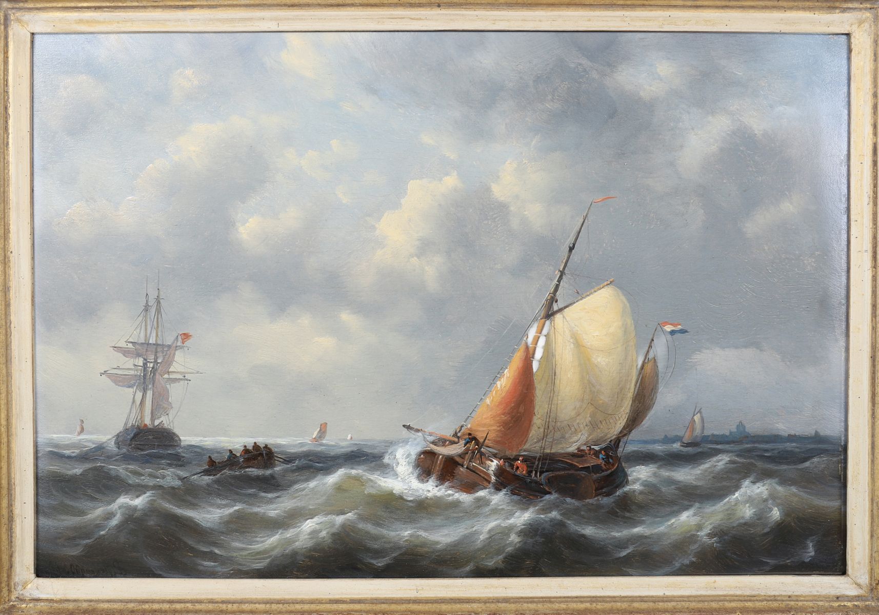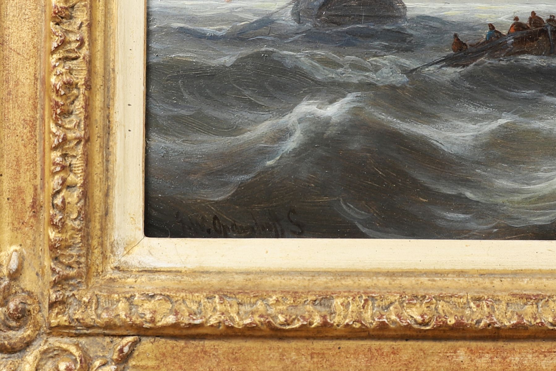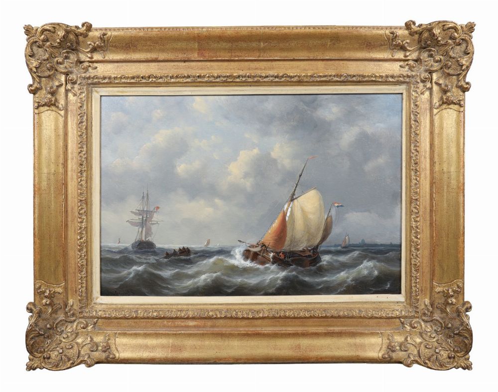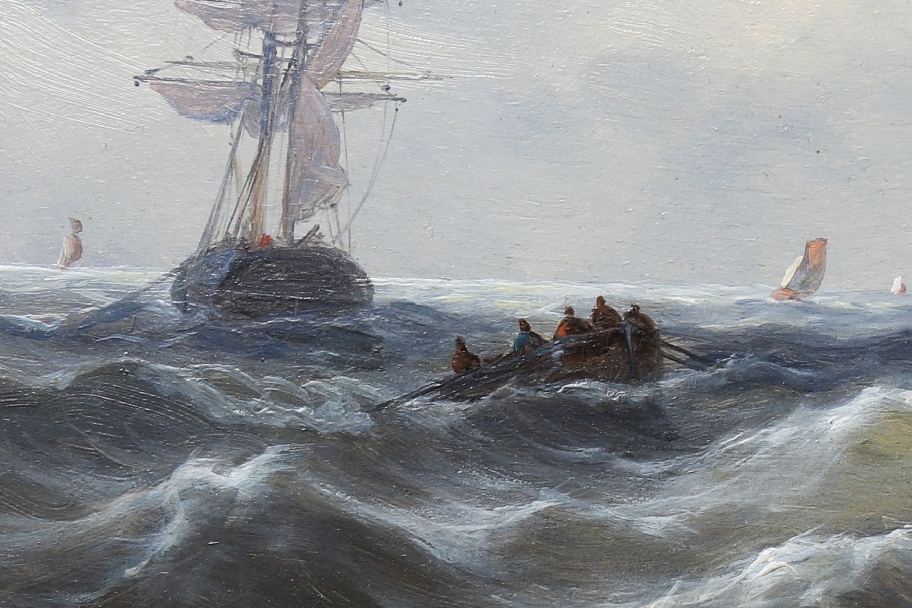 Marine painting depicting sailing vessels battling through choppy waves under a turbulent grey sky, with distant ships on the horizon. Oil on panel, signed lower left. Presented in a gilt frame with foliate corners.
