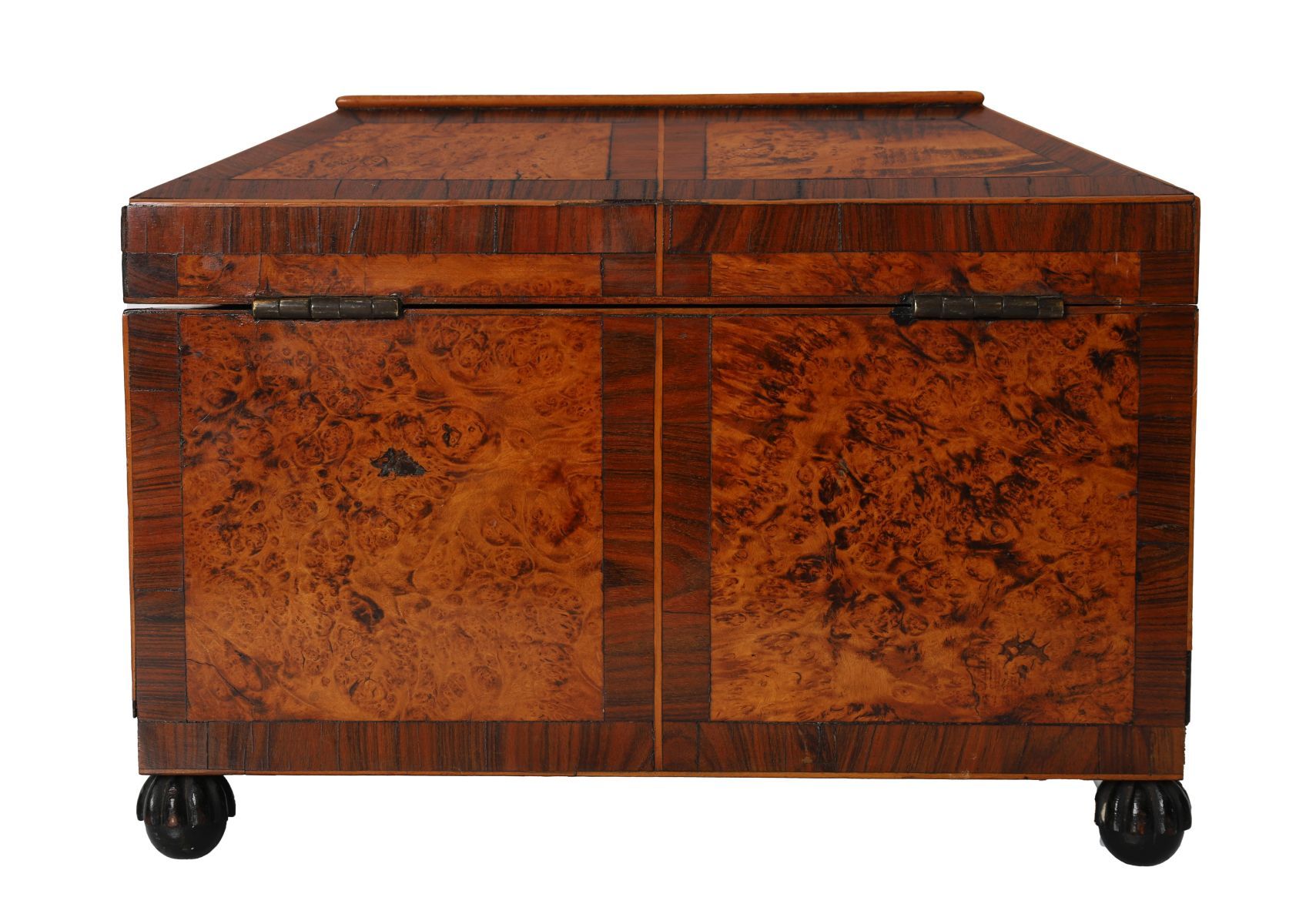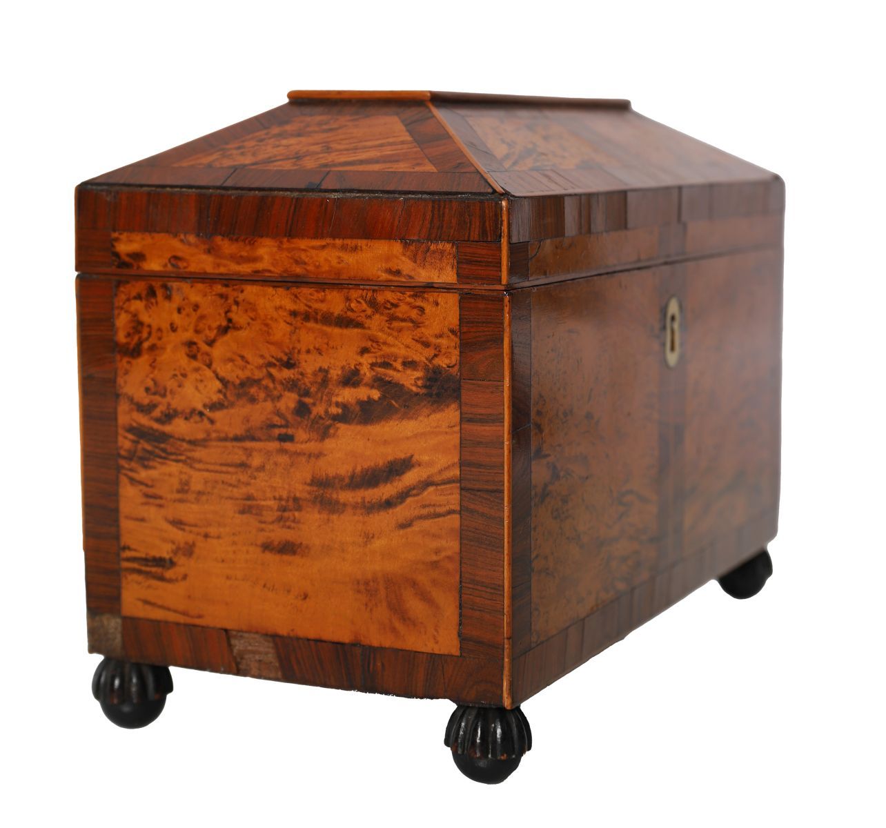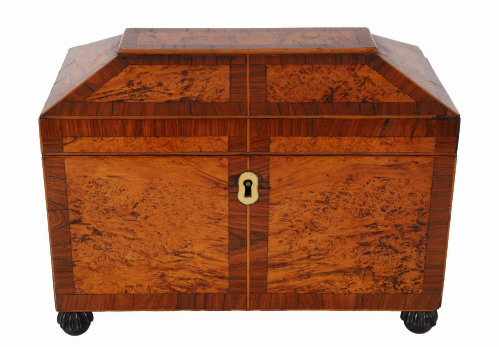 Lot 321 GEORGIAN AMBOYNA AND FRUITWOOD BANDED TEA CADDY