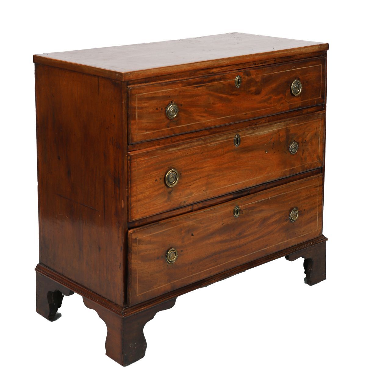 of three long drawers furnished with brass scroll handles, raised on bracket feet.