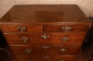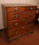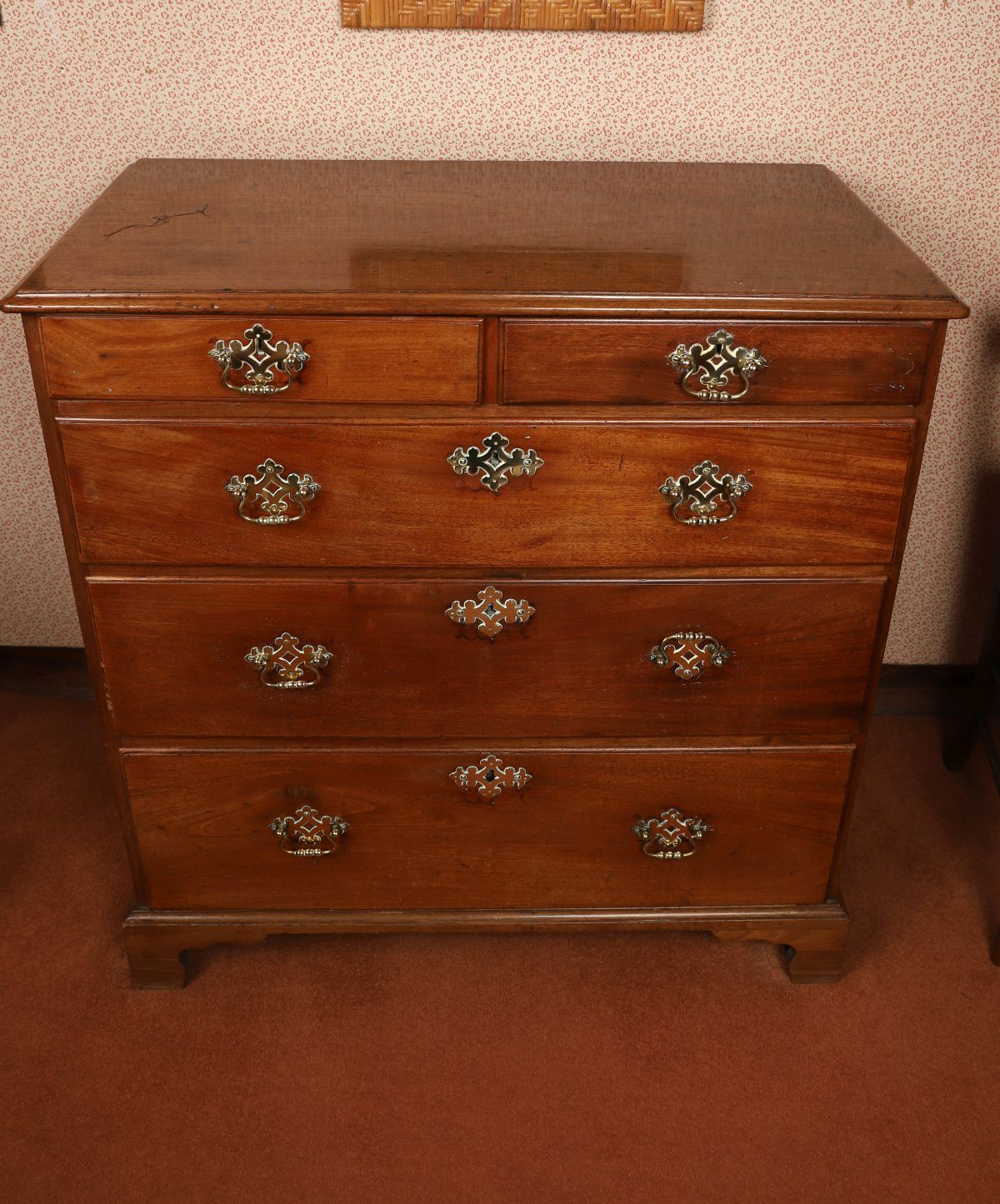 An 18th-century Georgian mahogany chest of drawers, the rectangular top above two short and three long graduated drawers, each fitted with ornate brass handles. Raised on bracket feet. Rich patination throughout, with signs of age and use consistent with period.