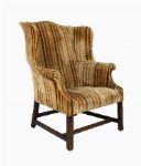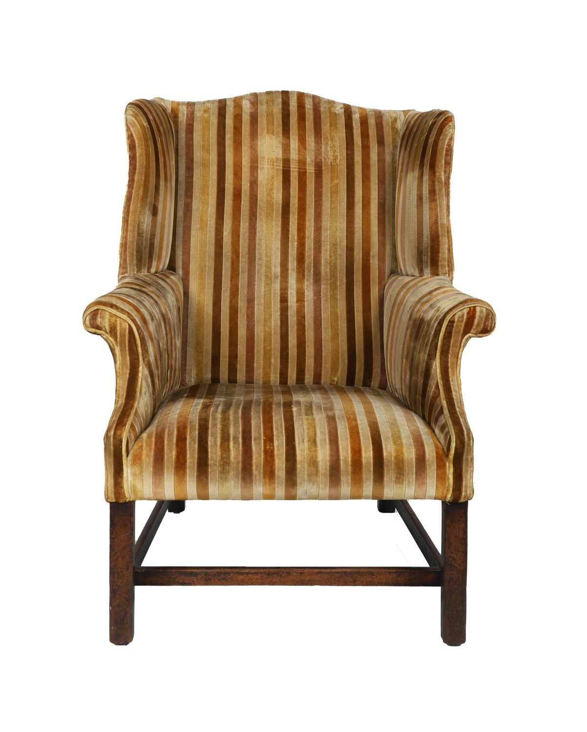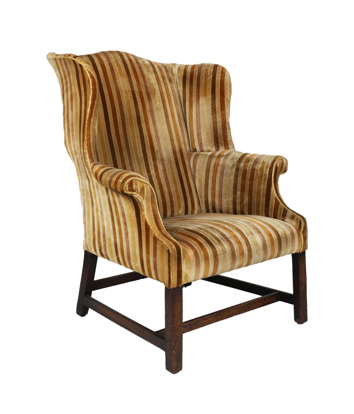 18th-century mahogany wingback armchair with upright square legs joined by stretchers, upholstered in gold and cream striped velvet. The generous proportions and traditional form reflect late Georgian comfort and design. Circa 1780.