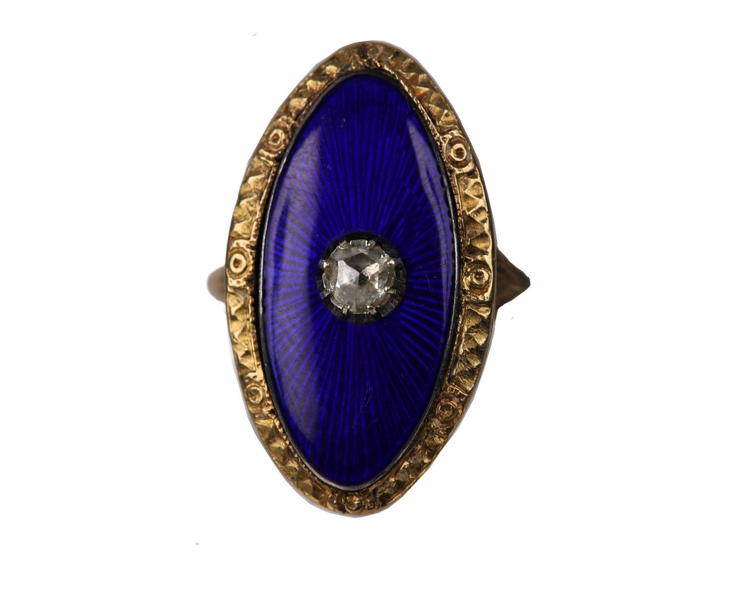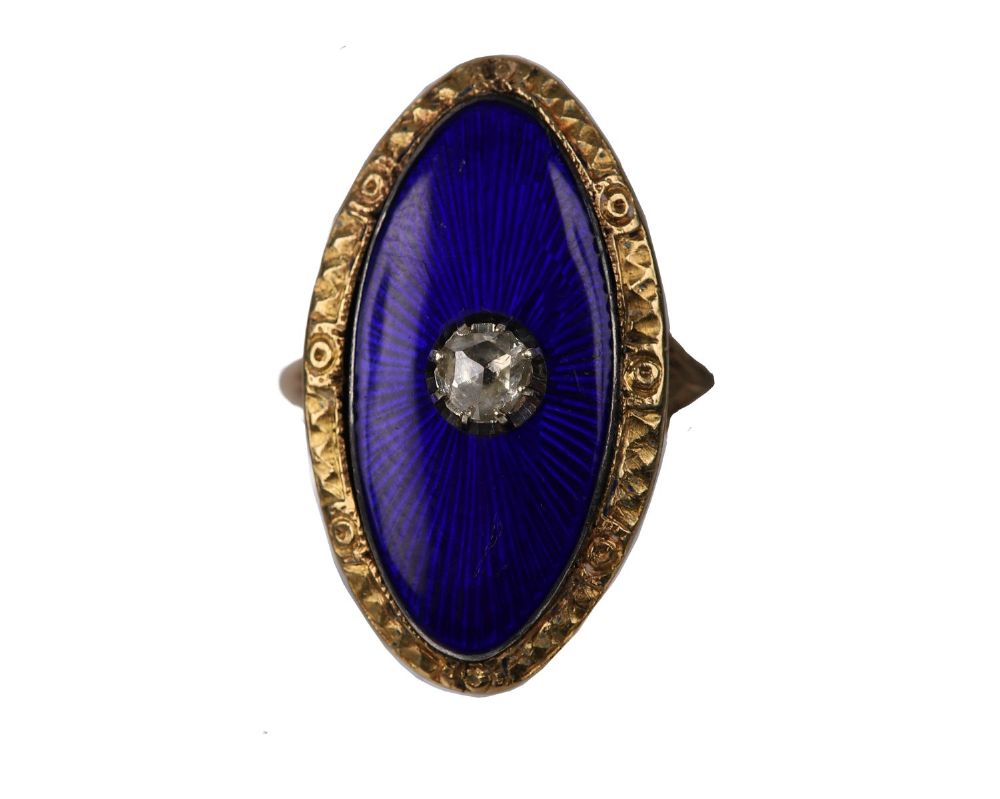 A Georgian-style oval ring featuring a vivid cobalt-blue enamel panel centred with a single old-cut diamond, bordered by delicate rope-twist goldwork.