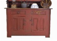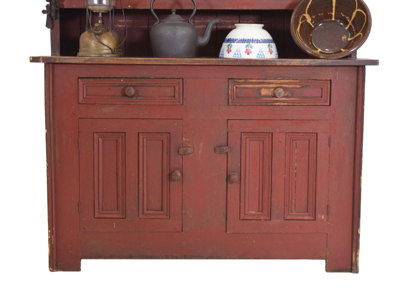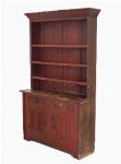 in original red paint, the upper section with three open shelves above a two-door base flanked by short drawers.