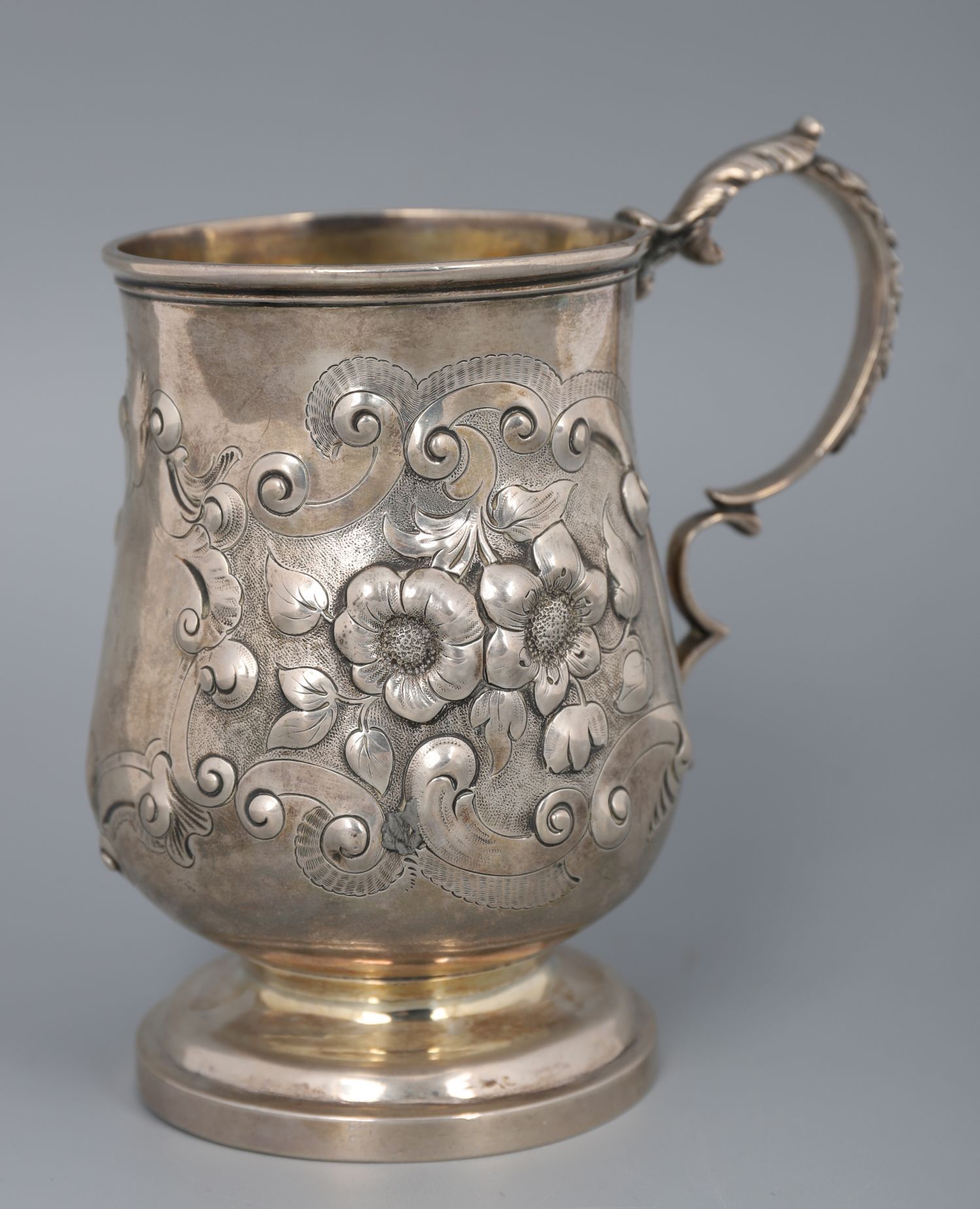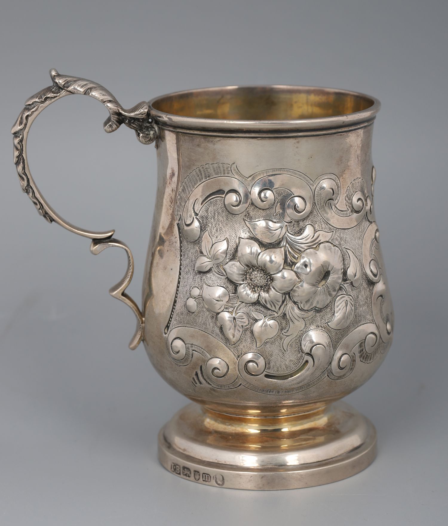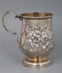 A Georgian silver mug, baluster form with embossed floral decoration and scrolled handle, gilt interior. Hallmarked, 18th century.