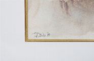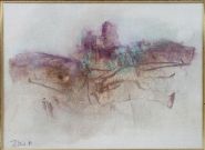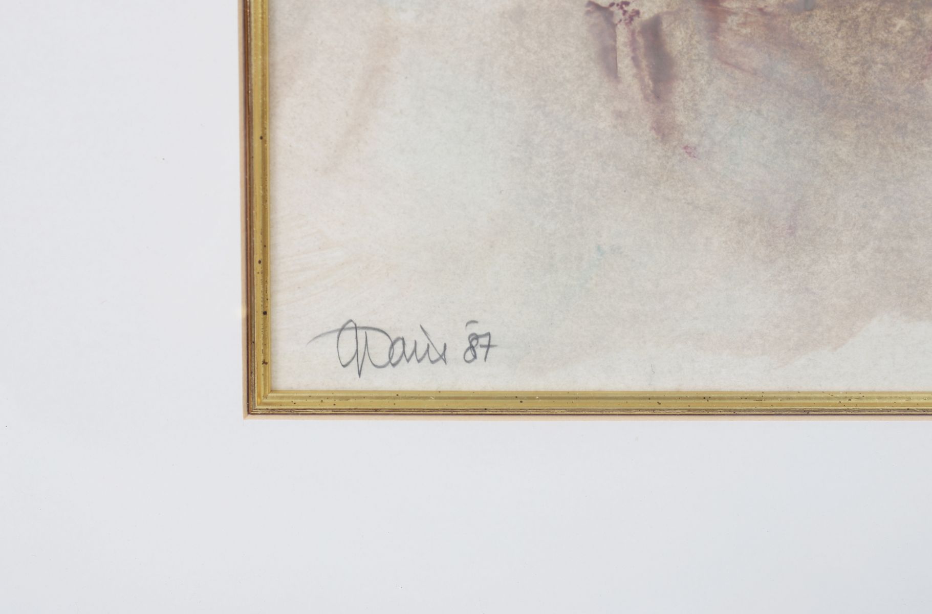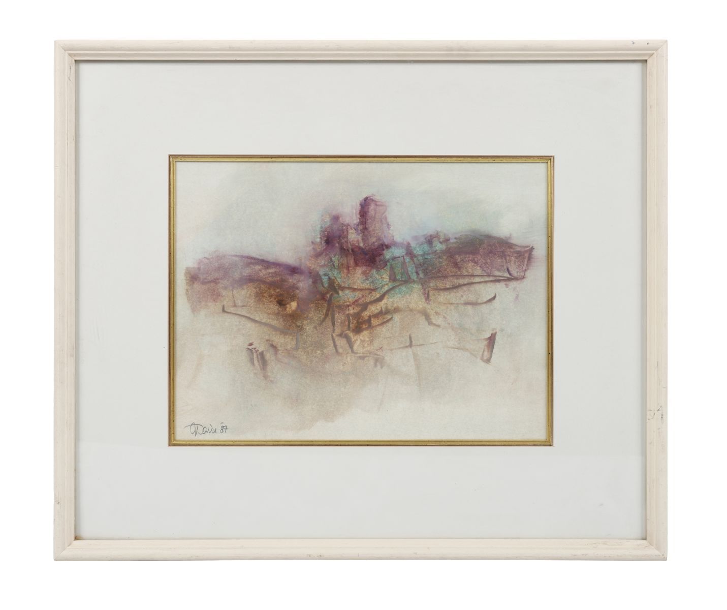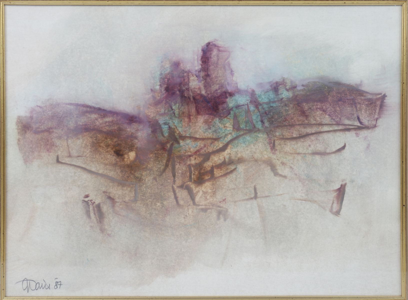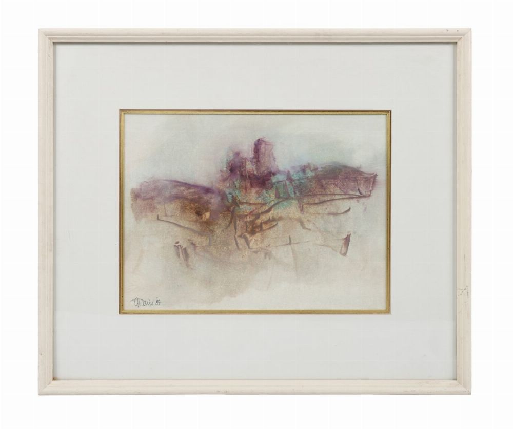 Depicting an abstracted landscape with muted earthy tones and a misty horizon. Signed and dated ‘87 lower left. Presented in a gilt slip frame with mount.