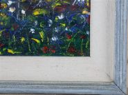 Geraldine Hone, Wild Meadow, a vibrant and expressive abstract landscape, painted in thick impasto oils on board. The composition features bursts of red, yellow, blue, and white strokes evoking wildflowers against a dark ground, suggesting a densely blooming field in summer. Presented in a wide cream-painted and silver-toned frame.
