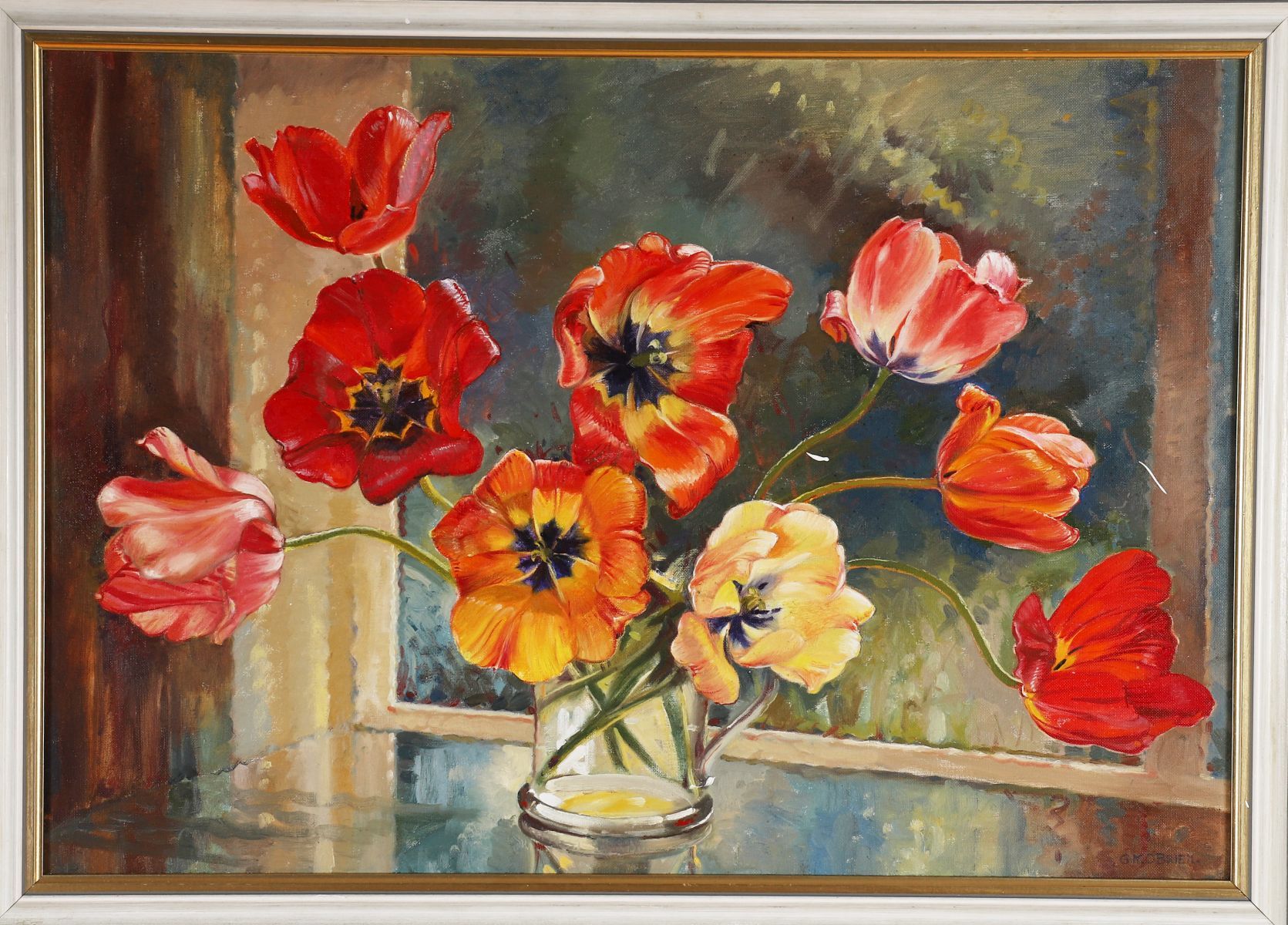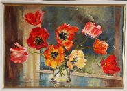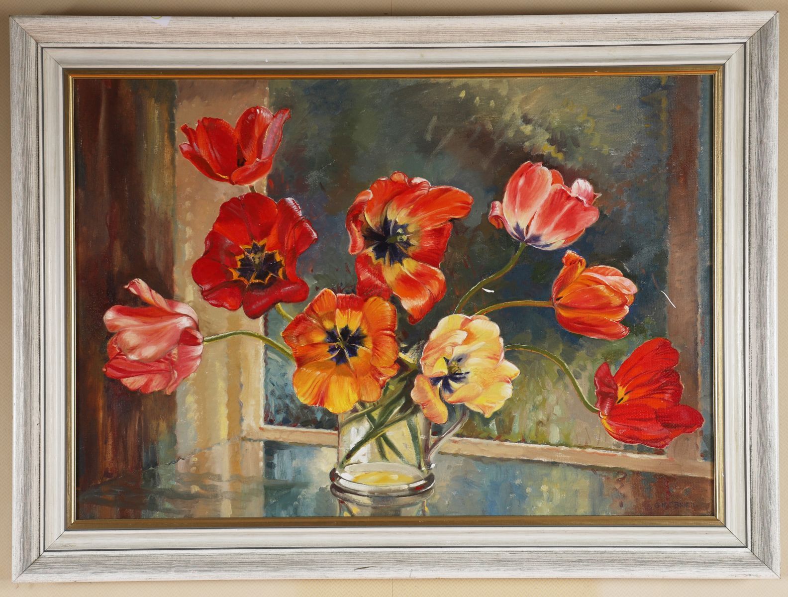 Bright still life composition of tulips arranged in a glass vase, signed. Framed. Oil on canvas.