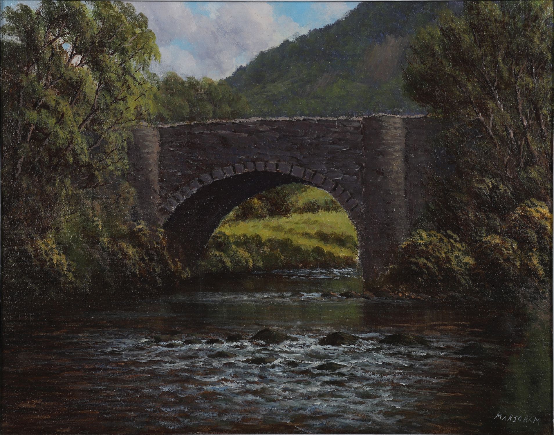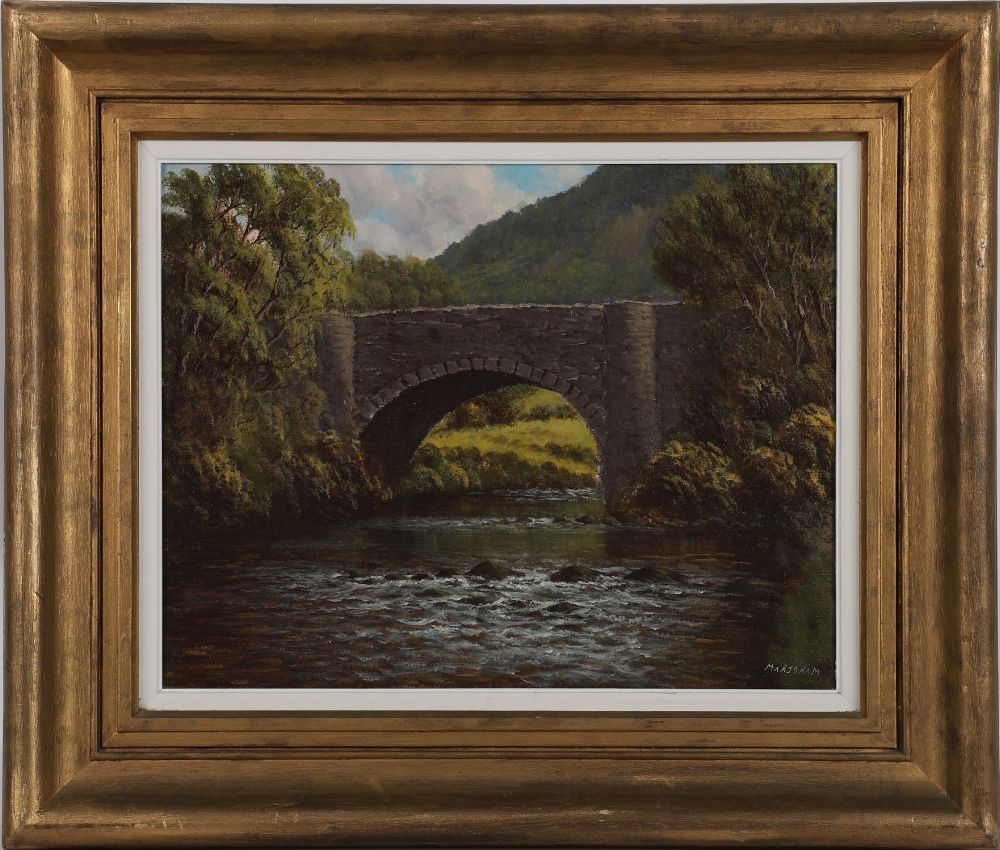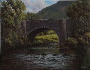 Description: A bright landscape with a stone bridge over flowing water, set against a backdrop of wooded hills. Signed lower right.