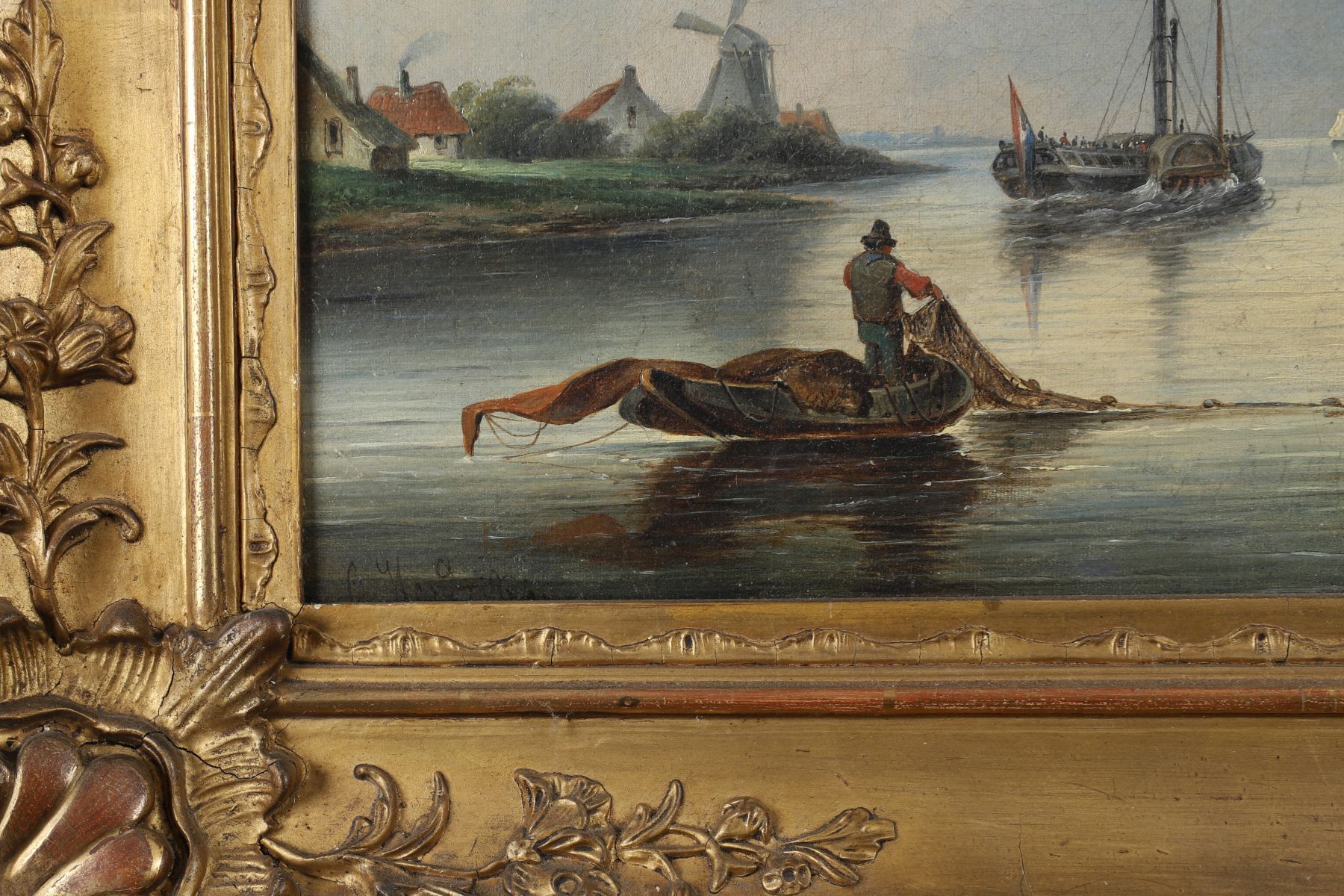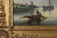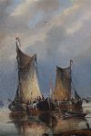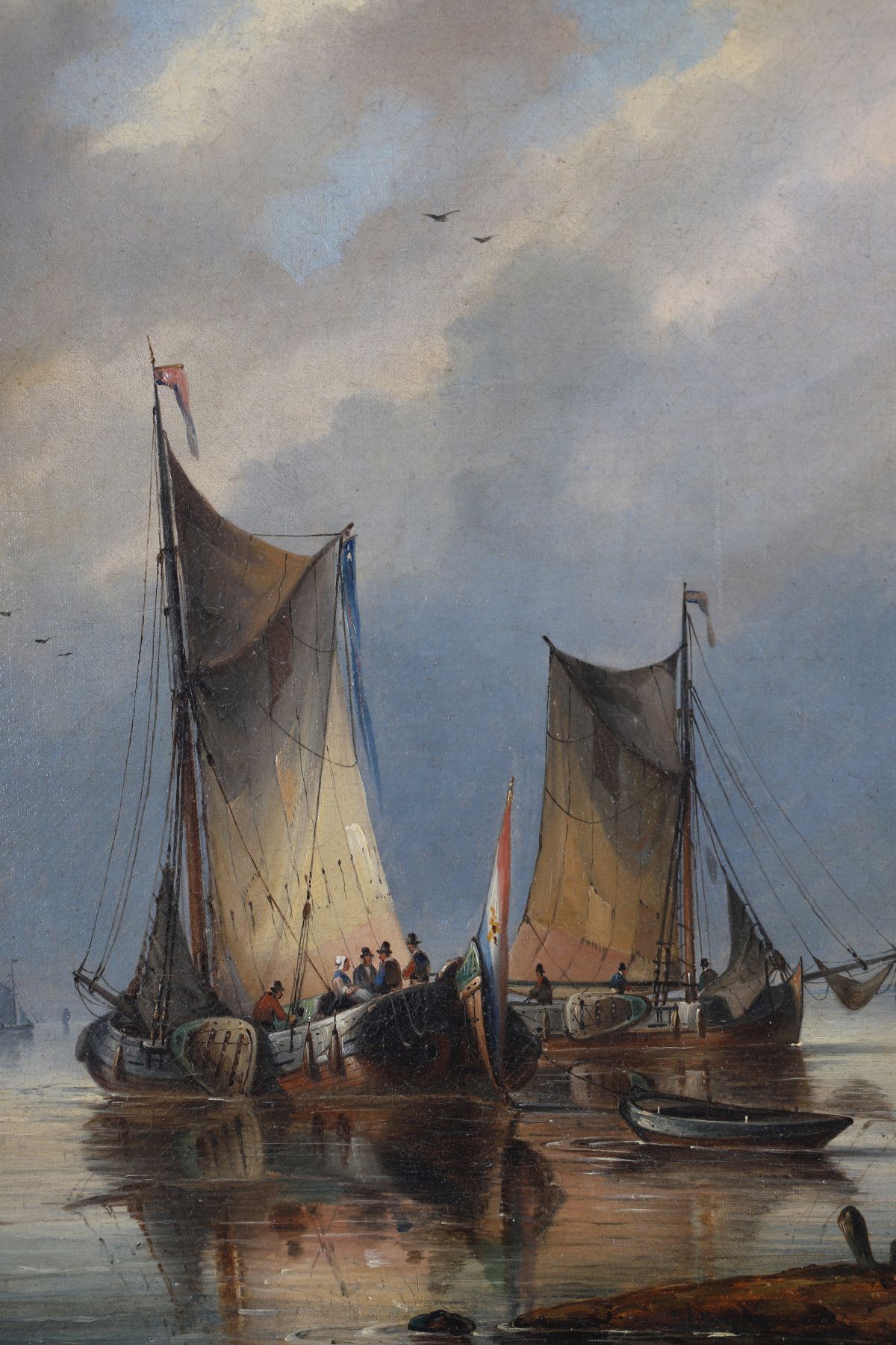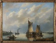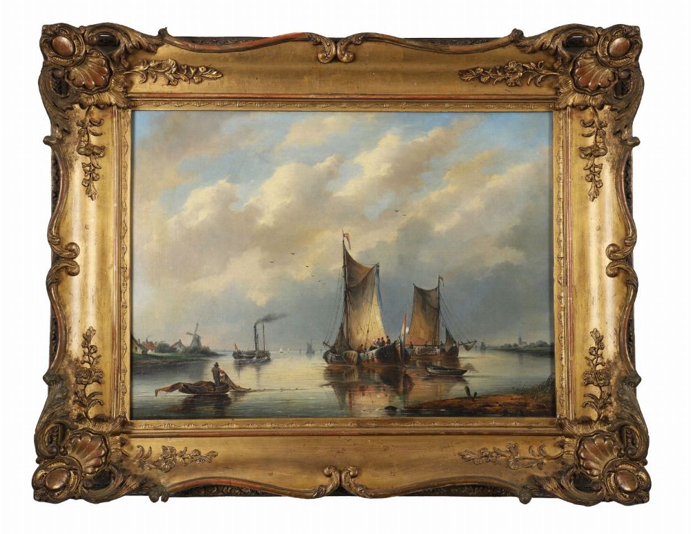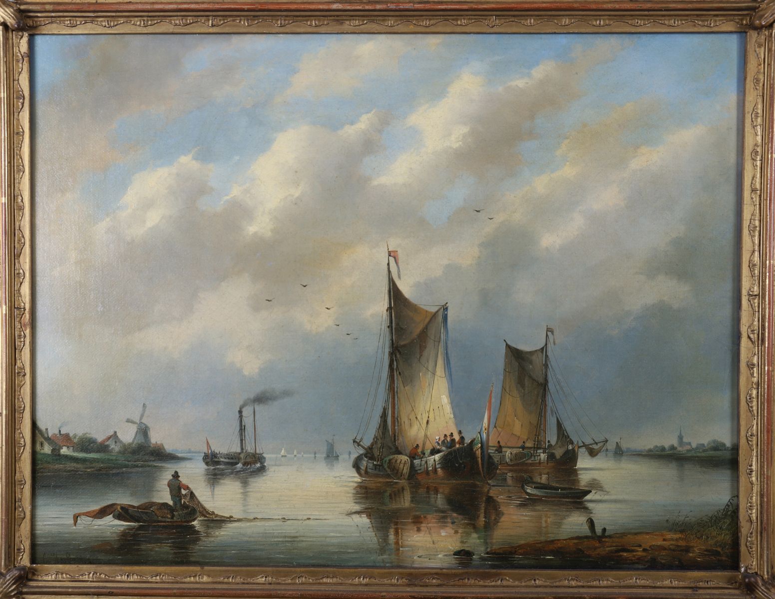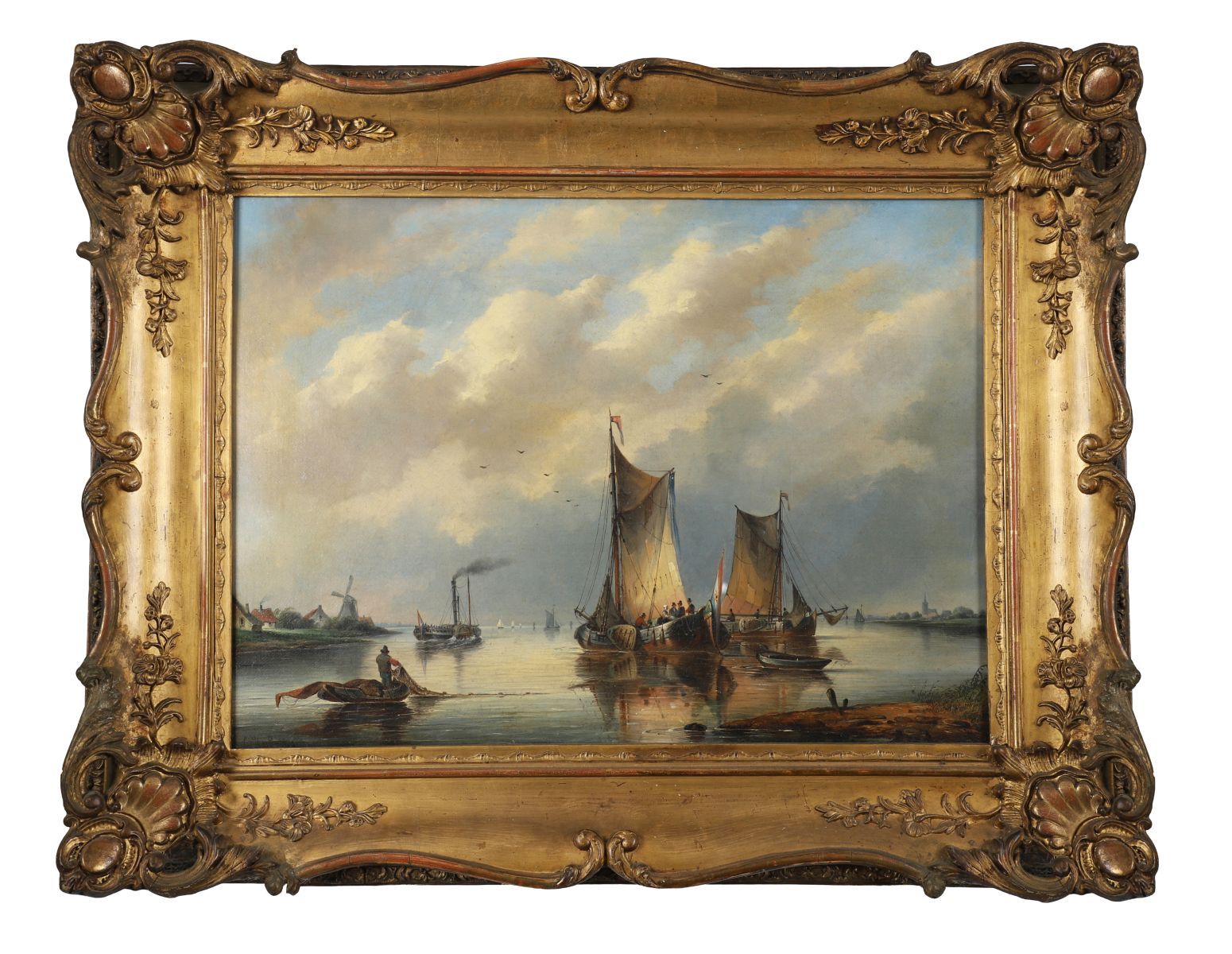 A detailed marine scene depicting Dutch sailing vessels and steamships moored on calm estuarial waters under a soft evening sky. Oil on canvas, signed lower left. Presented in a gilt frame.