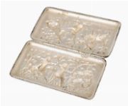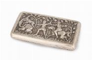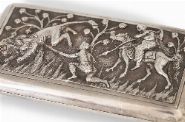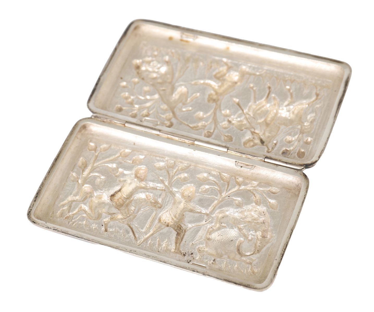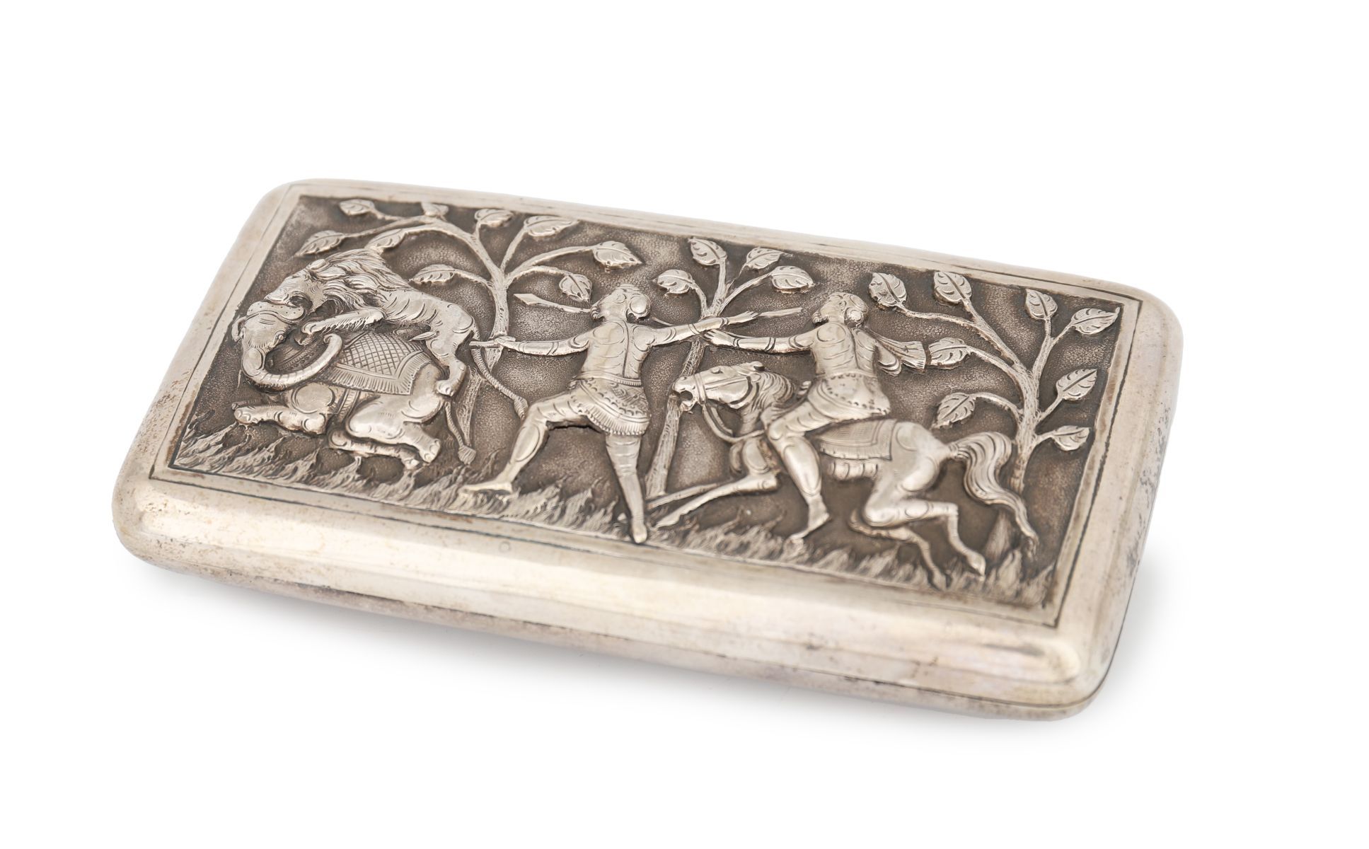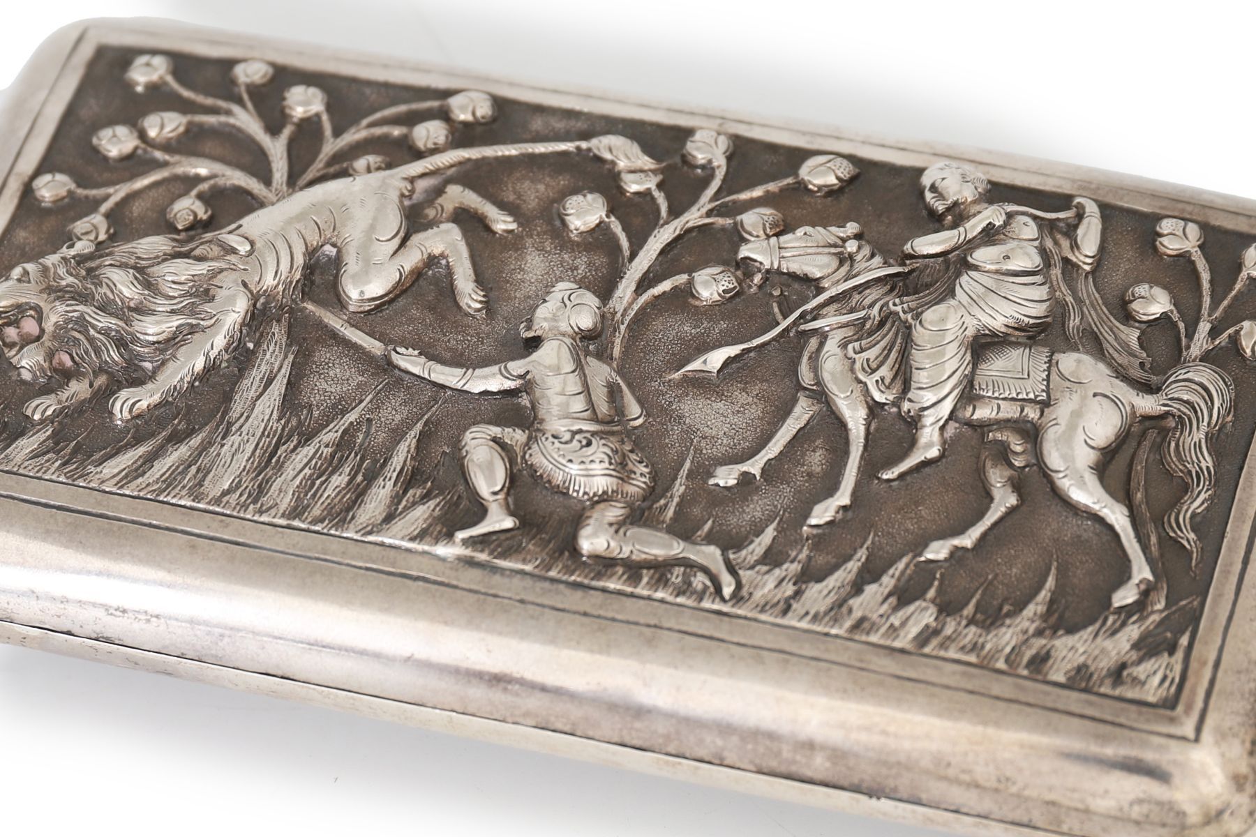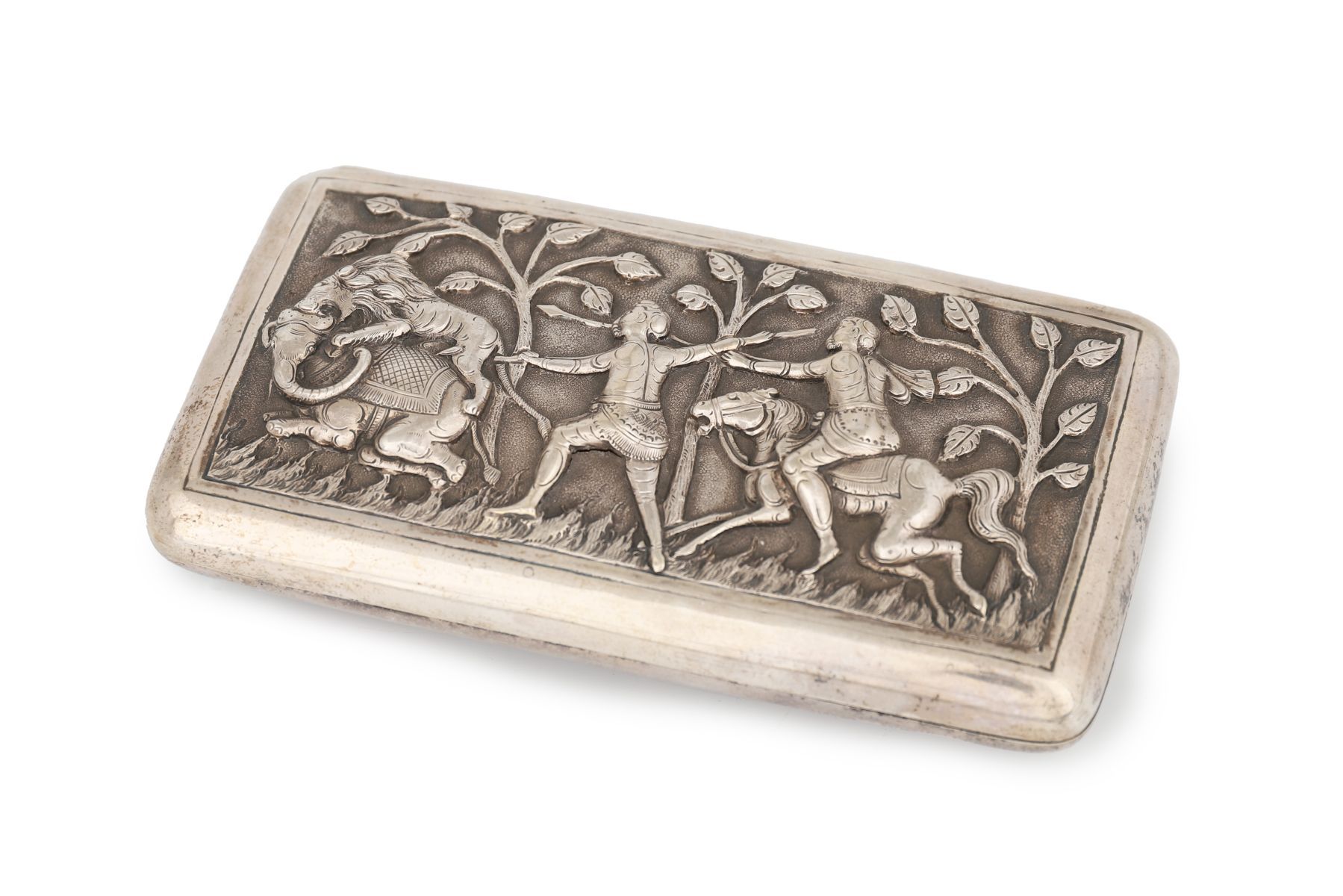 Rectangular hinged box with rounded corners, made in Germany, probably Hanau, late 19th century, the front and reverse finely worked in high-relief repoussé and chasing, each panel depicting animated Indian royal hunting scenes, including mounted hunters armed with spears and a lion attack, set amongst stylised trees and textured ground. The borders neatly framed, the sides plain, the interior undecorated. The subject reflects late Victorian European fascination with Mughal and Orientalist imagery.
