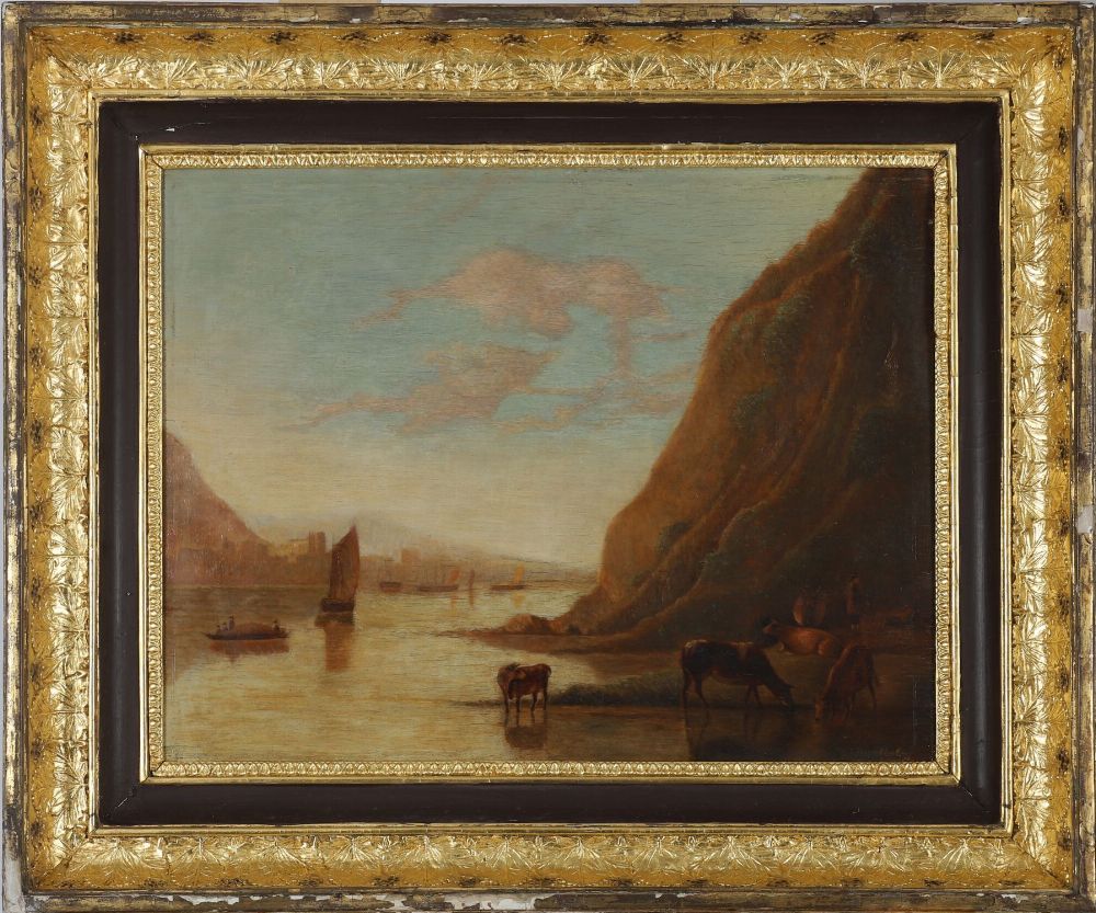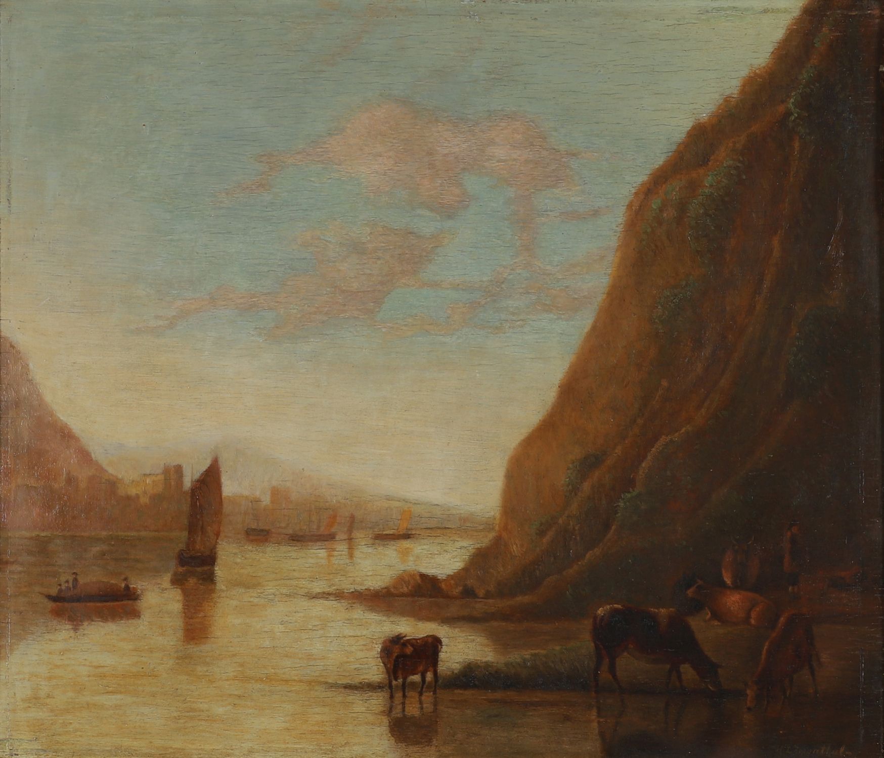 Sailboats in the bay with Grazing Cattle. Oil on Board. Framed