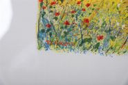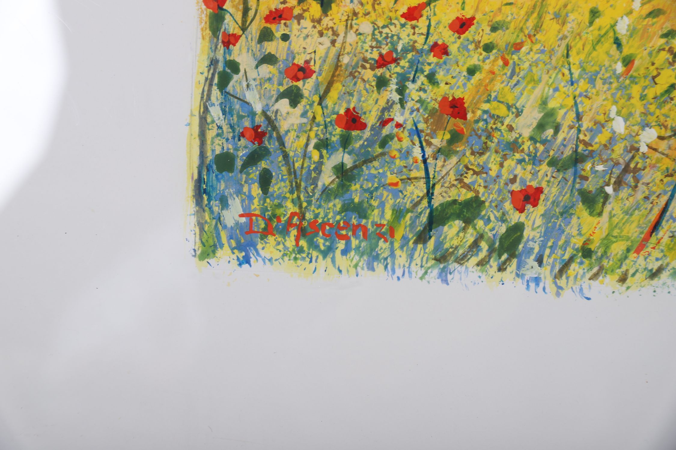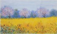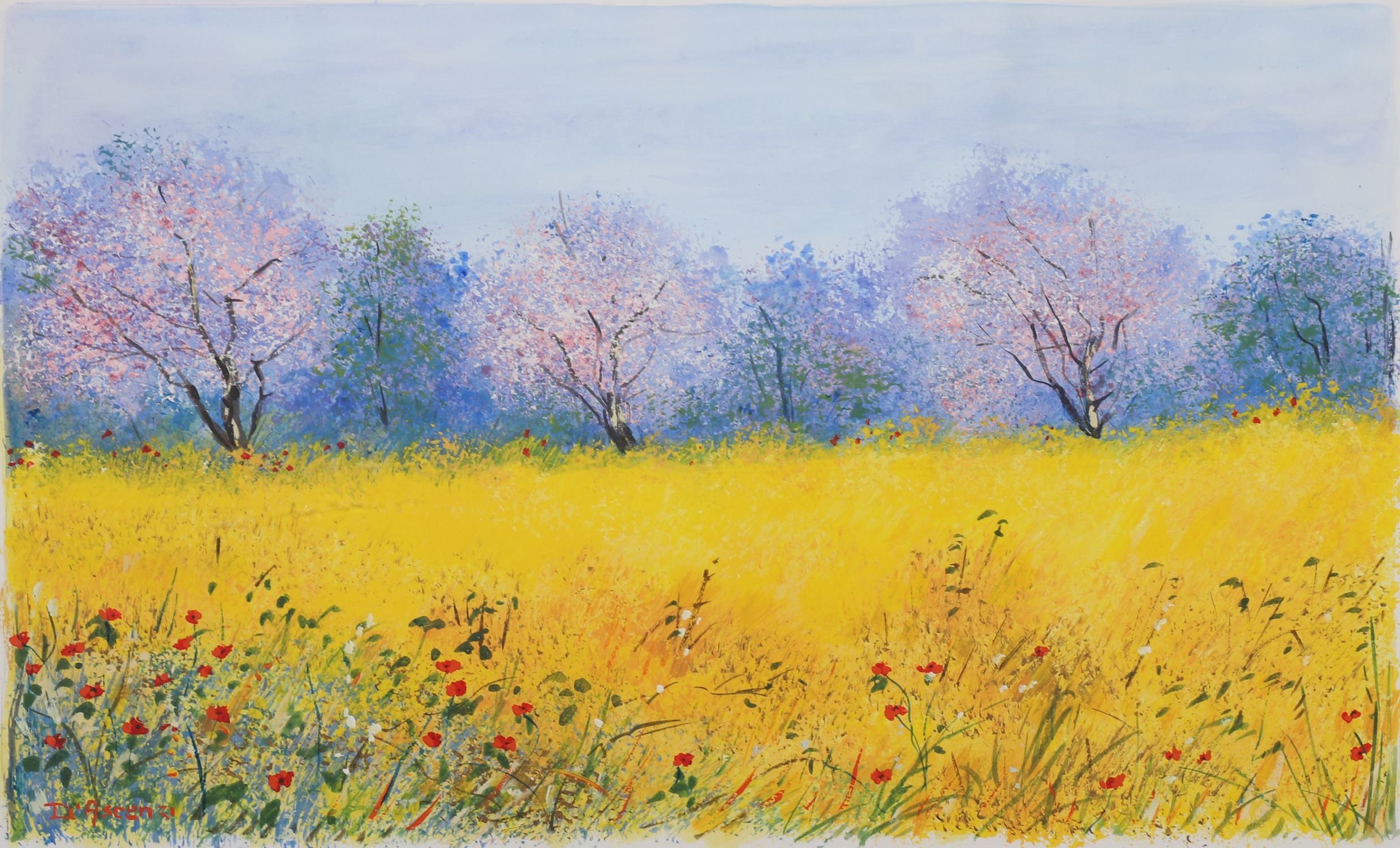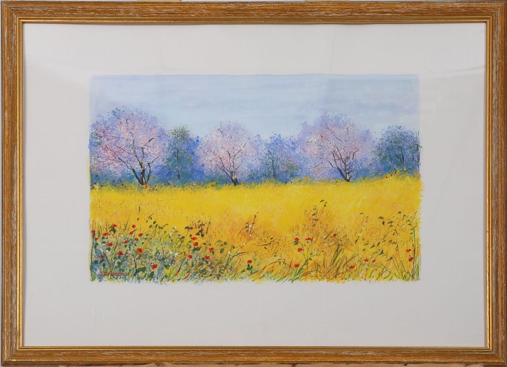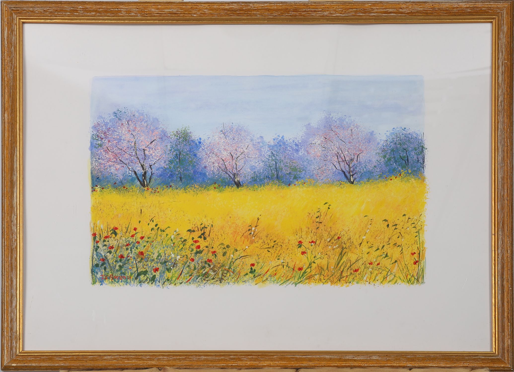 Oil on card, depicting a bright yellow meadow with wildflowers, blossom trees, and blue hills beyond, Paesaggio. Presented in gilt frame under glass. Signed oil on card.