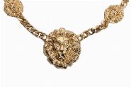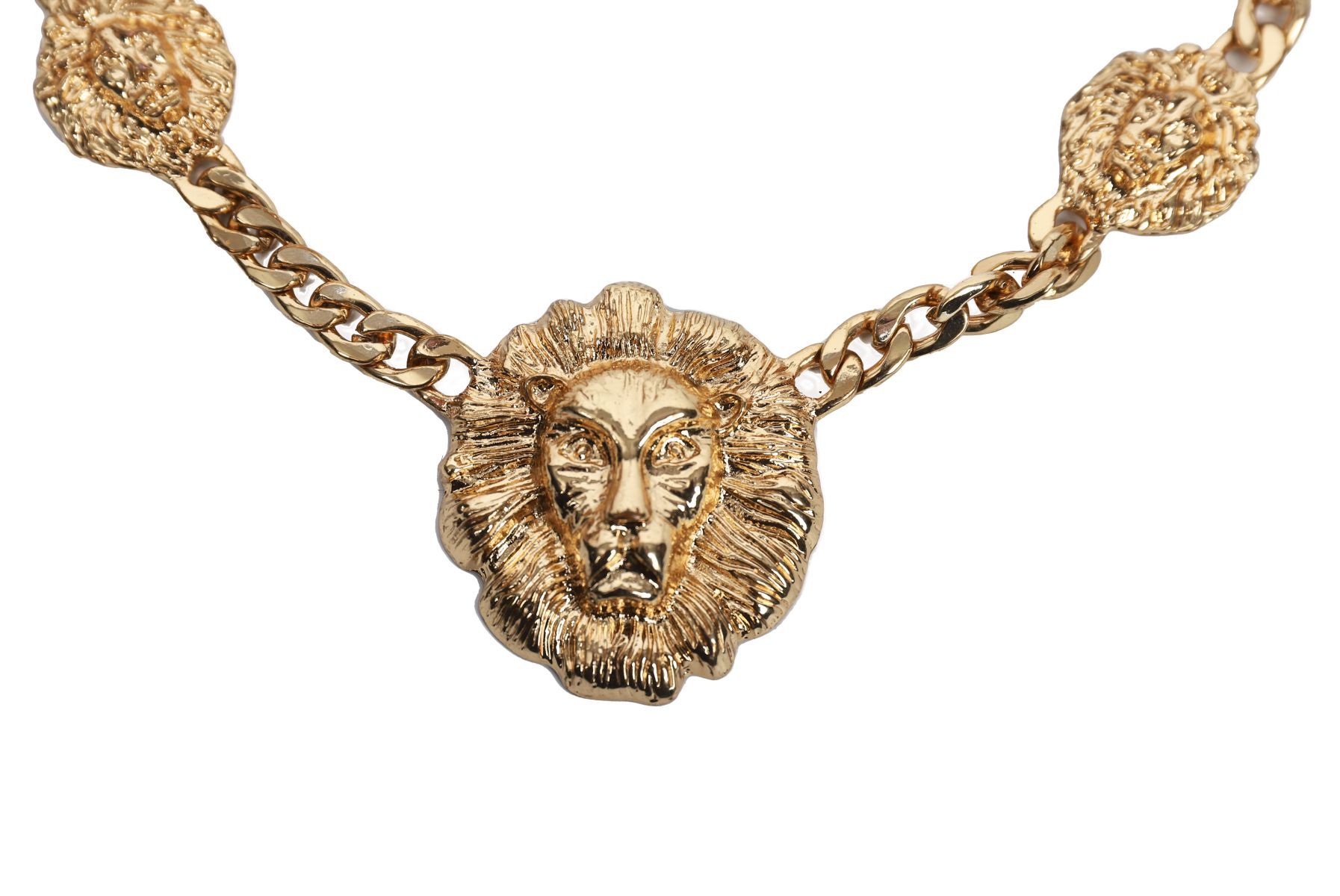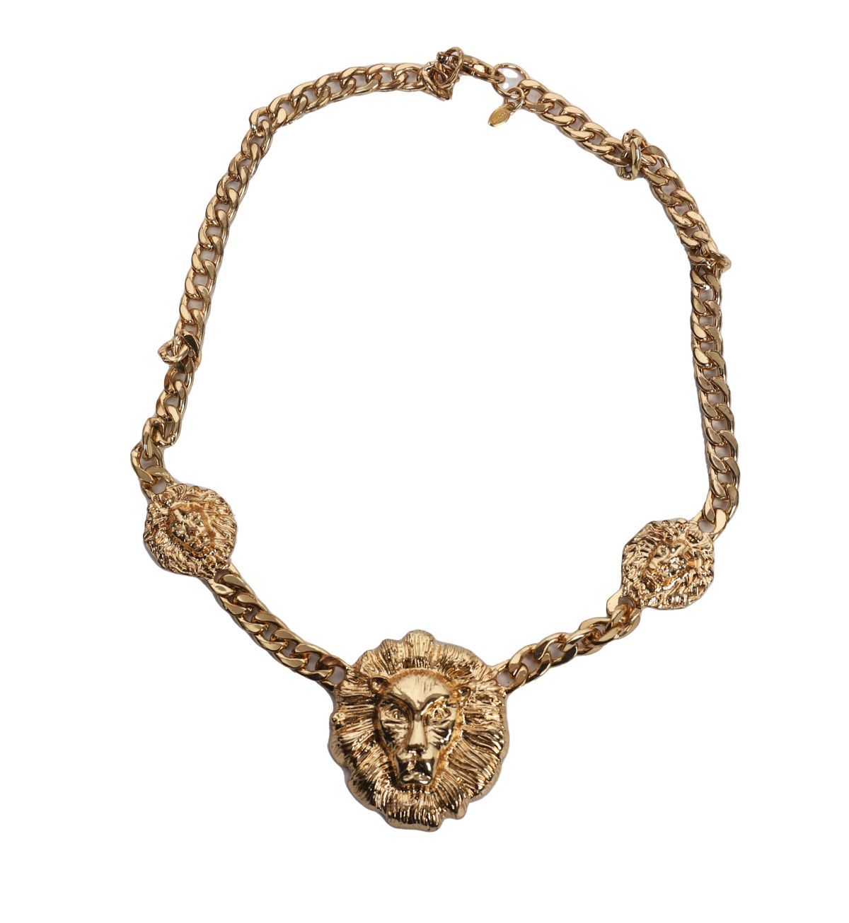 A bold gilt metal necklace with central lion head medallion flanked by smaller matching motifs, linked by curb chain.