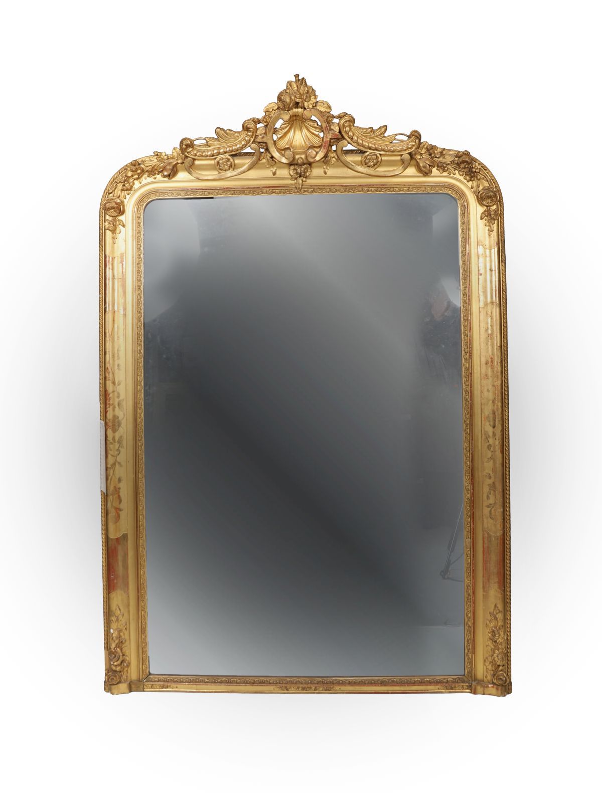 A 19th-century giltwood overmantel mirror with arched top surmounted by a central shell and floral cresting, with scrolling foliate decoration throughout. Retaining original plate and rich gilding.