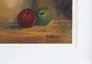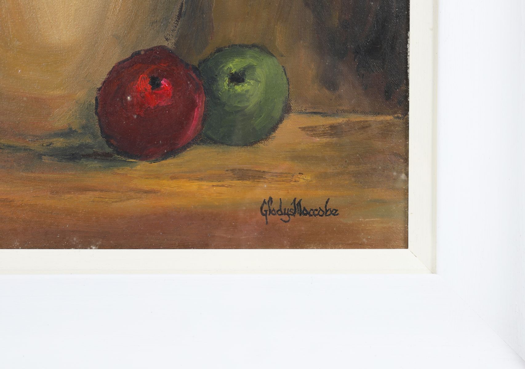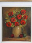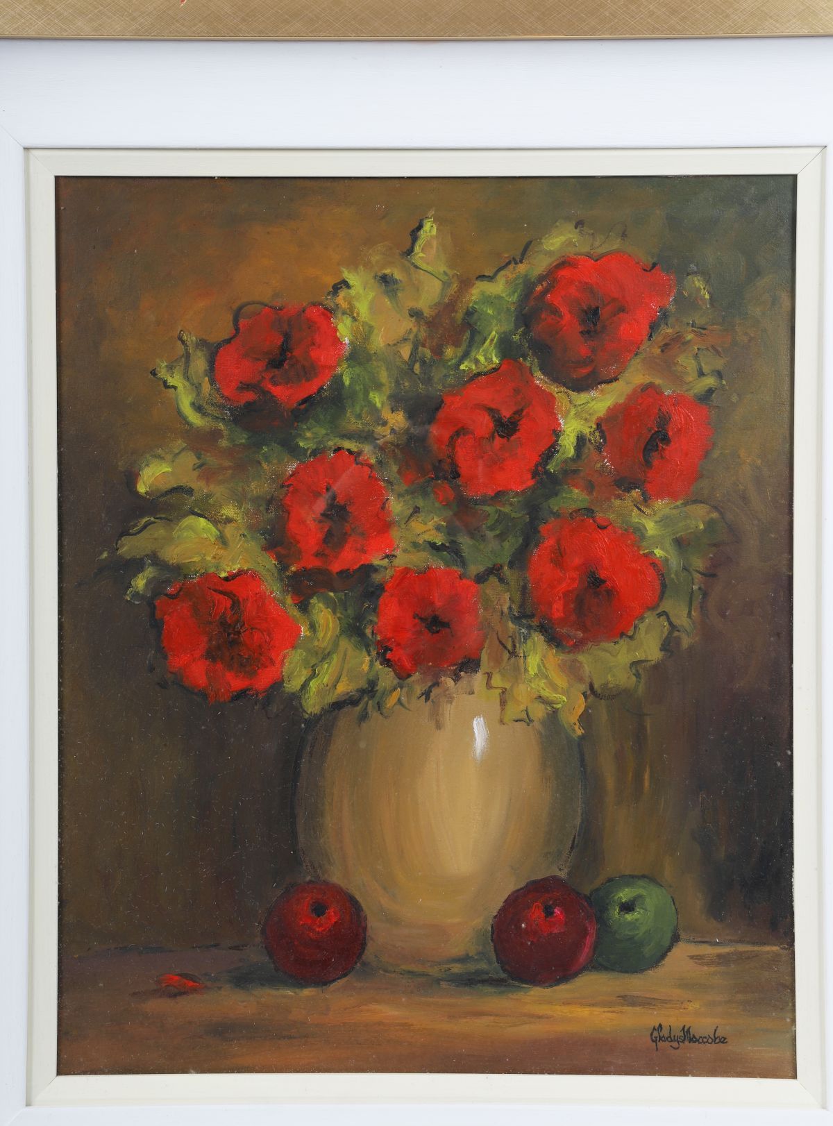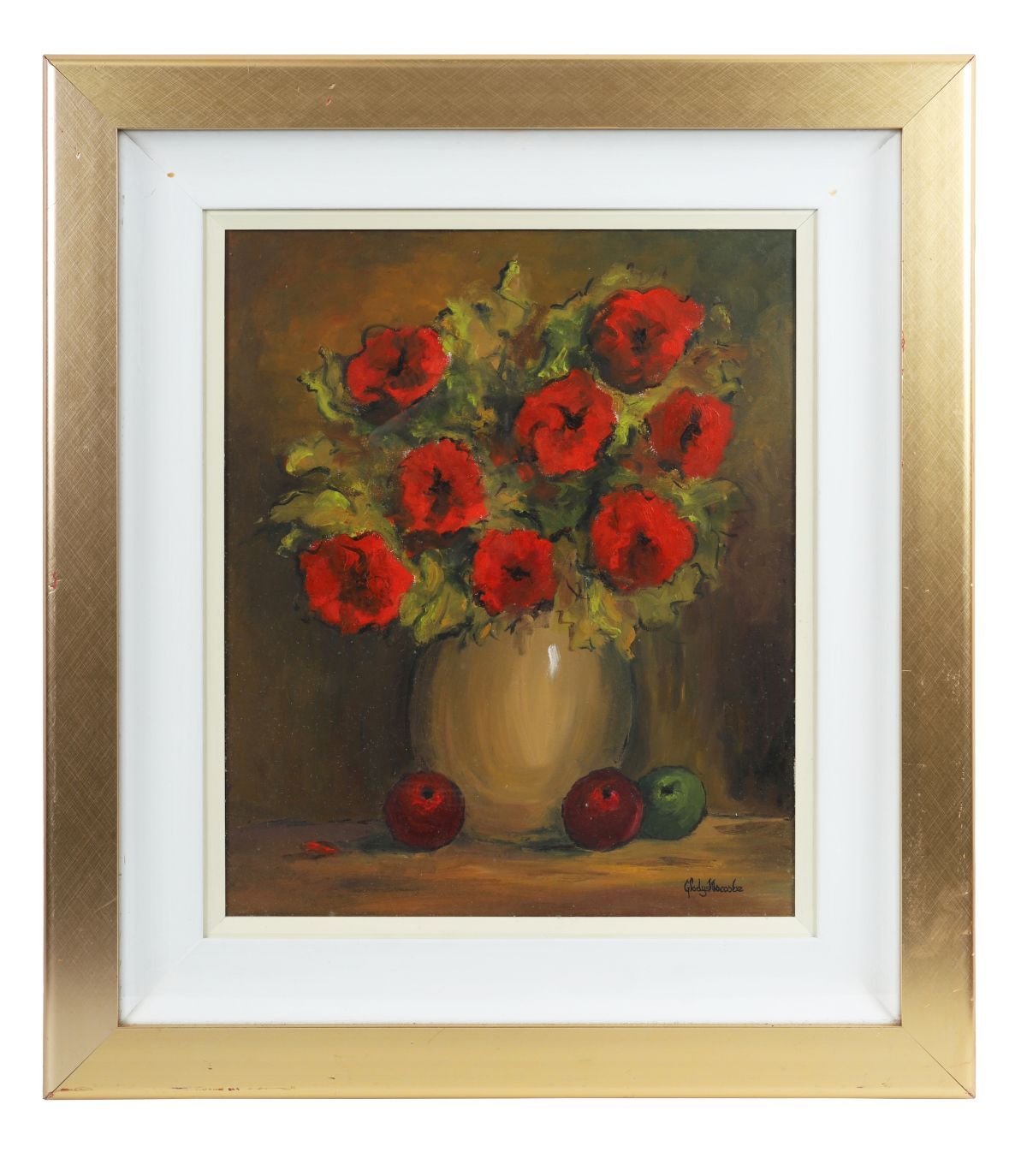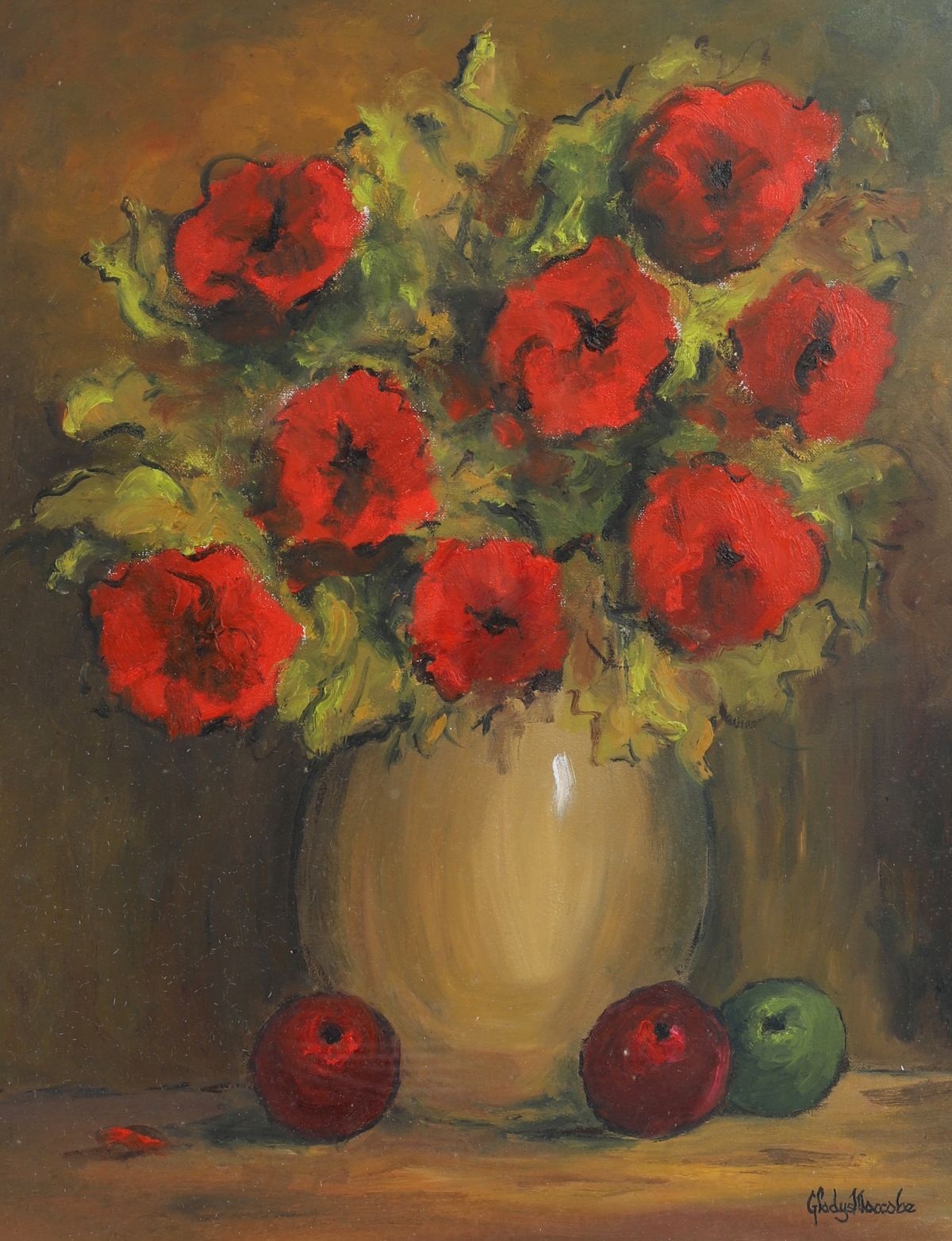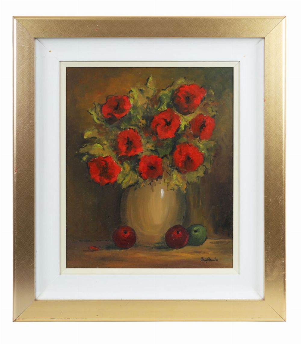 A radiant still life with scarlet poppies in a cream vase, surrounded by fruit. Maccabe’s confident brushwork and nuanced colour convey vibrancy and texture with painterly sophistication.