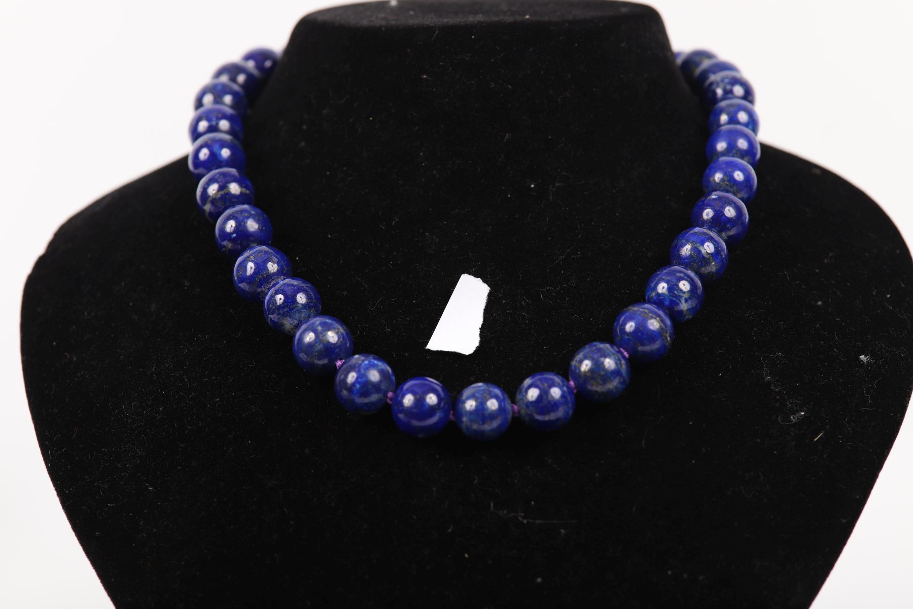 A gold-mounted necklace composed of uniform spherical lapis lazuli beads of deep blue tone with golden flecks, fitted with a gold clasp.