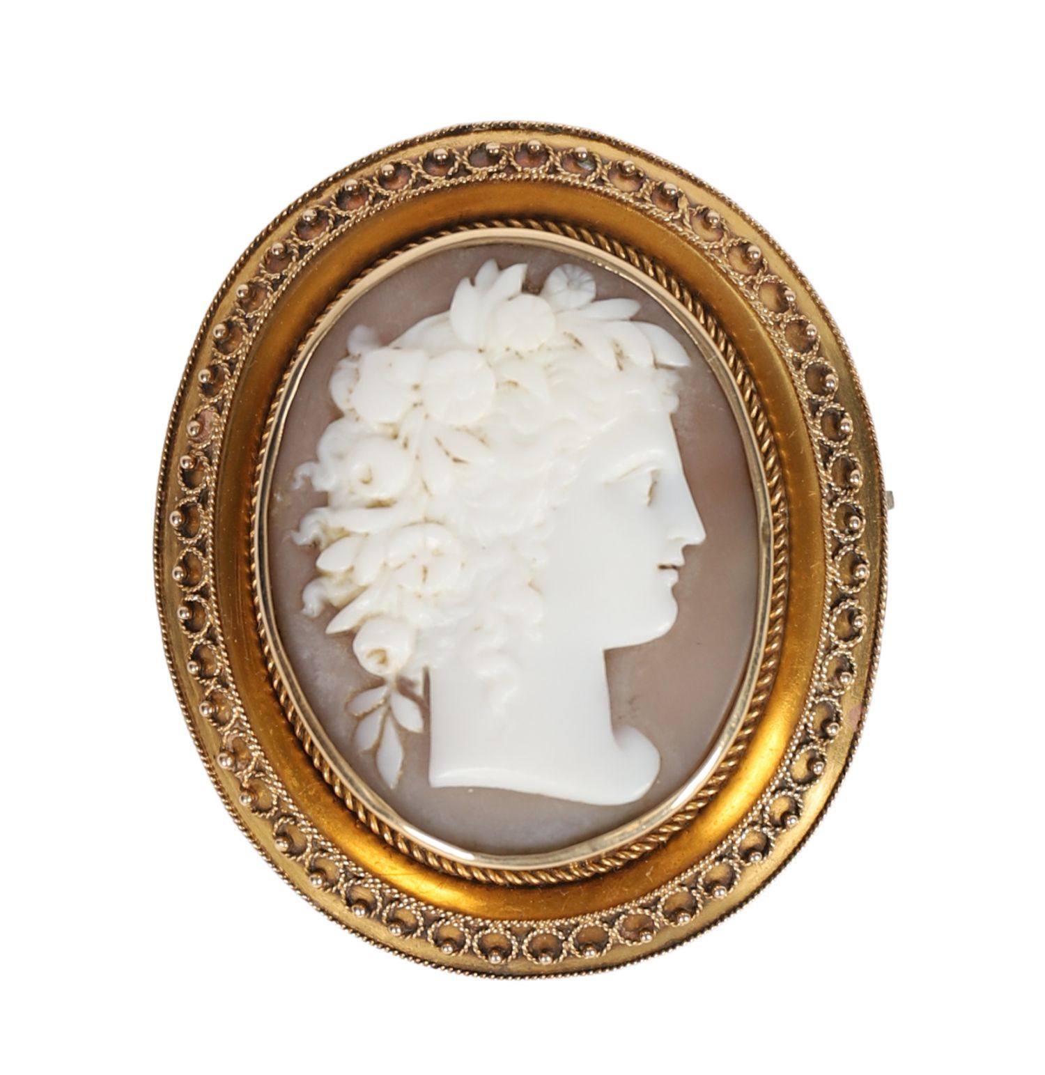 An oval shell cameo finely carved in high relief, depicting a classical female profile facing right, her hair adorned with a laurel wreath and floral sprays, possibly representing Flora or a Bacchante. The cameo is set within an intricate yellow gold mount decorated with an applied beaded border and engraved foliate detail. Pin and clasp fitting to reverse. A refined example of 19th-century cameo work, combining skilled carving with quality goldsmithing.