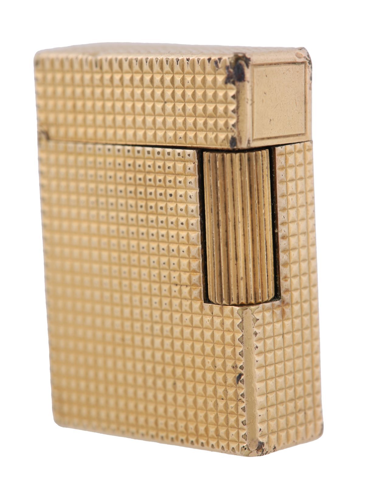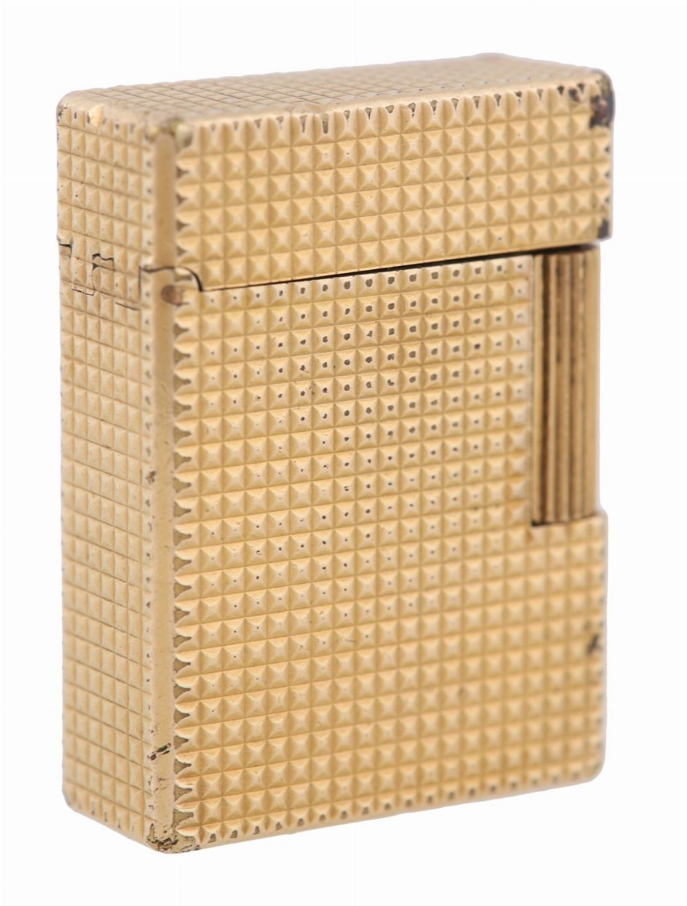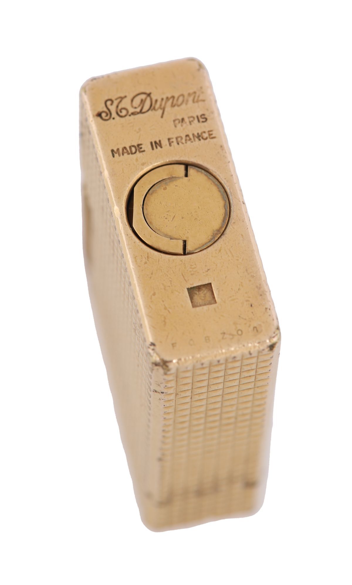 An S.T. Dupont Paris gas lighter in gold plate with diamond-cut finish. Marked to base S.T. Dupont – Paris, Made in France, serial number F0BZ0.