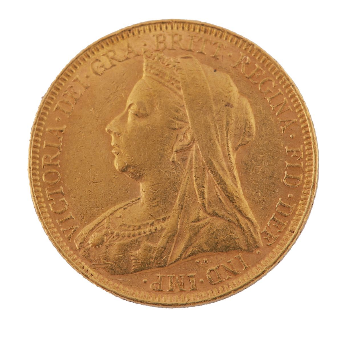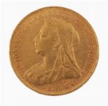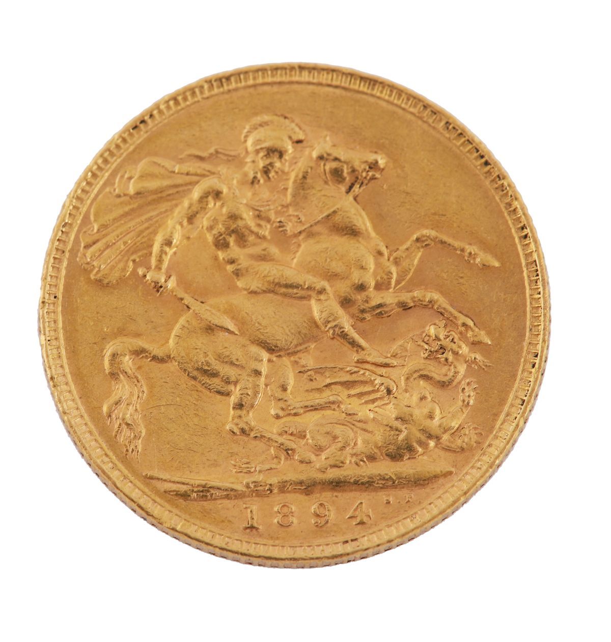 An 1894 gold sovereign, the reverse depicting St George and the Dragon.
