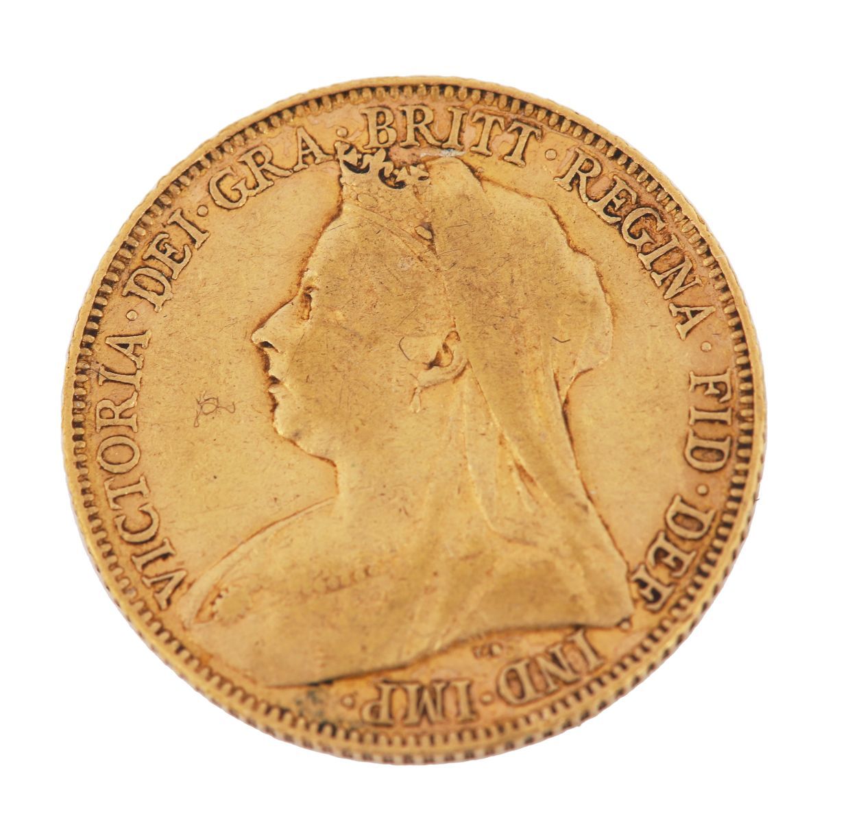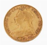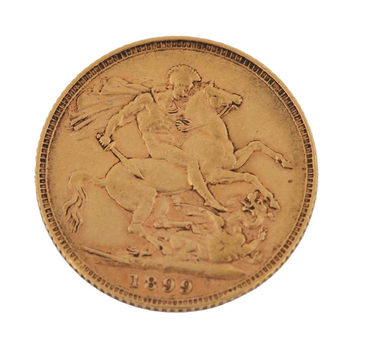 An 1899 gold sovereign, the reverse depicting St George and the Dragon, the obverse with veiled head portrait of Queen Victoria.