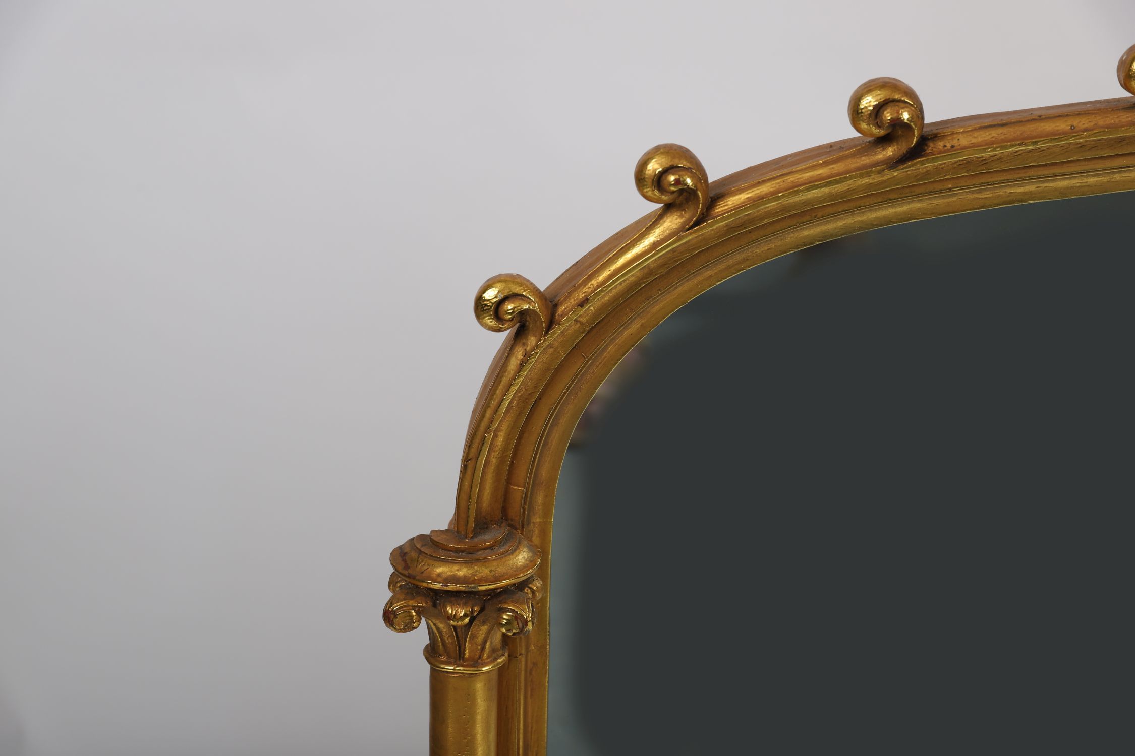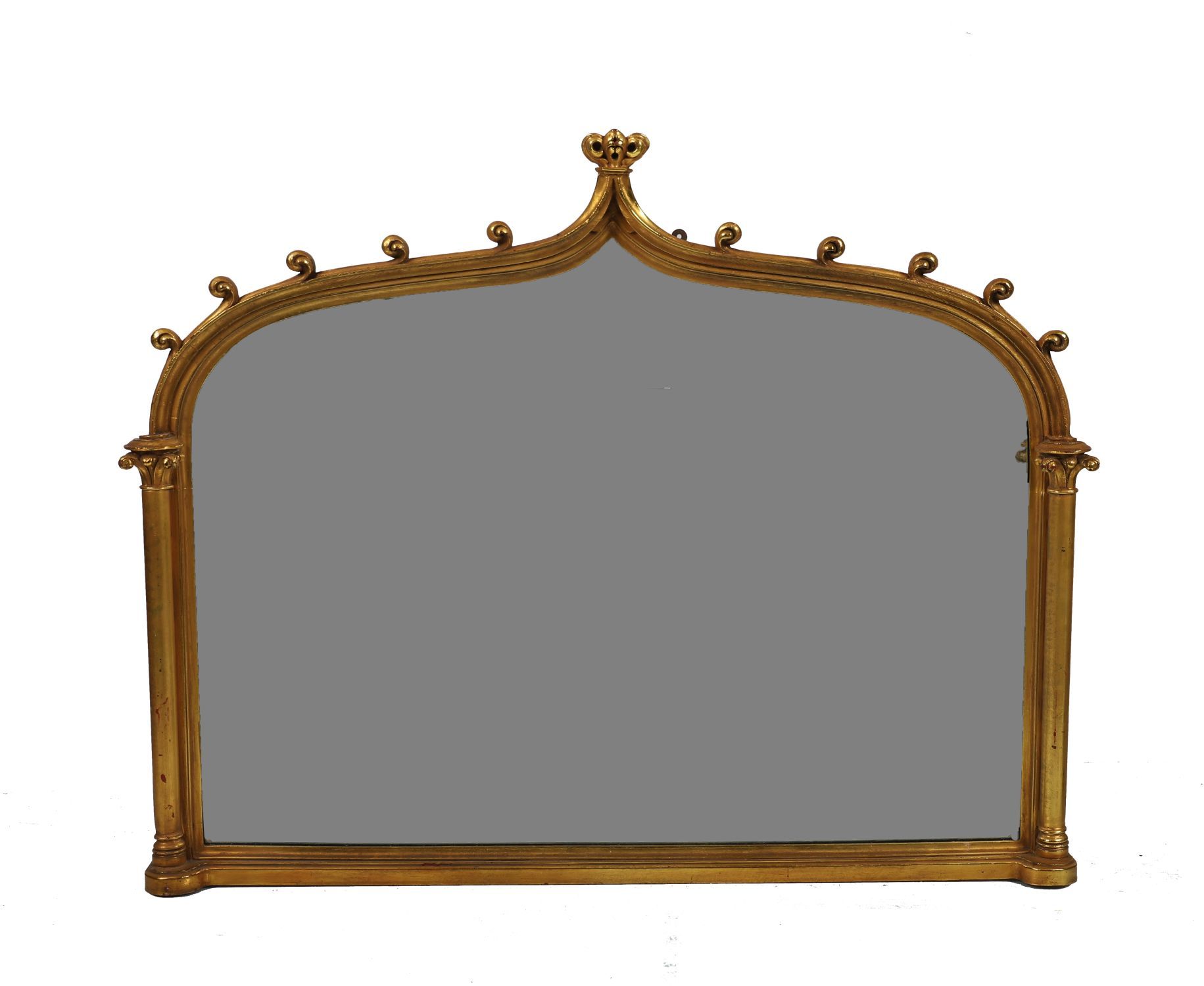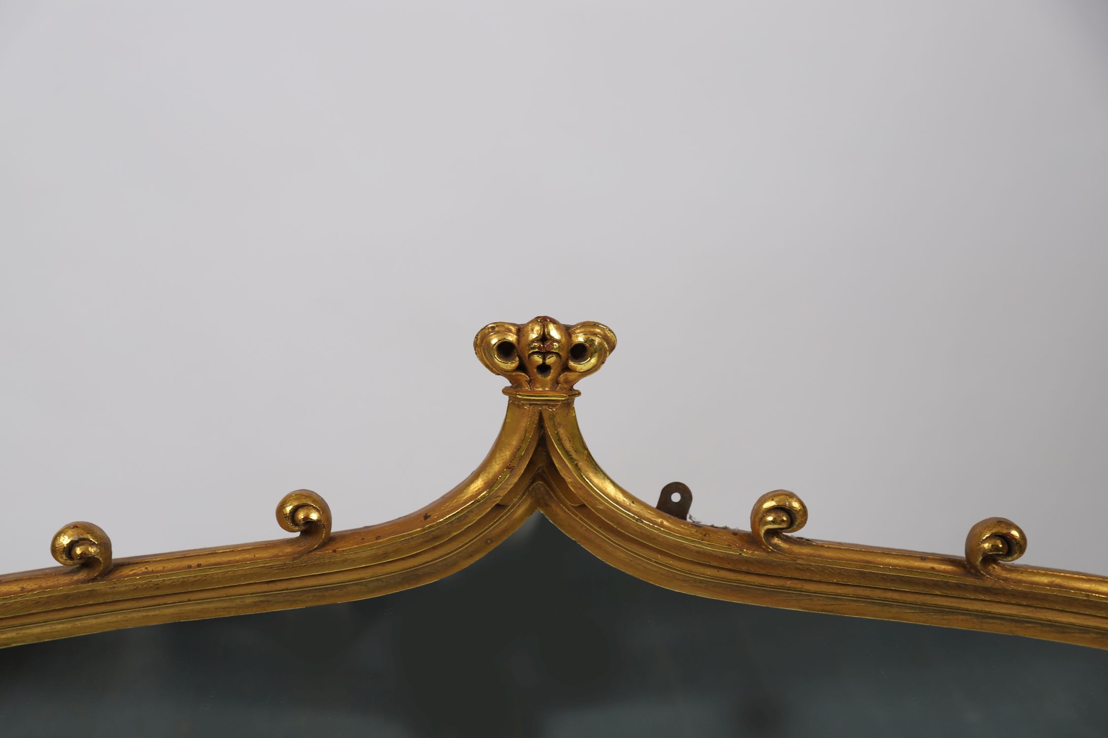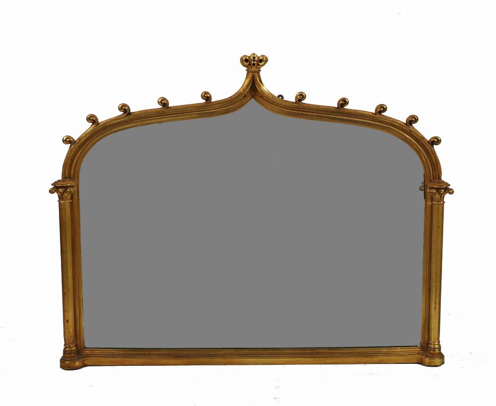 A large giltwood wall mirror in the Gothic revival style, the cresting with trefoil finials and scrolling ornament above an arched bevelled mirror plate, the moulded frame with a burnished gold finish.