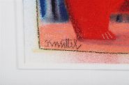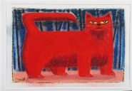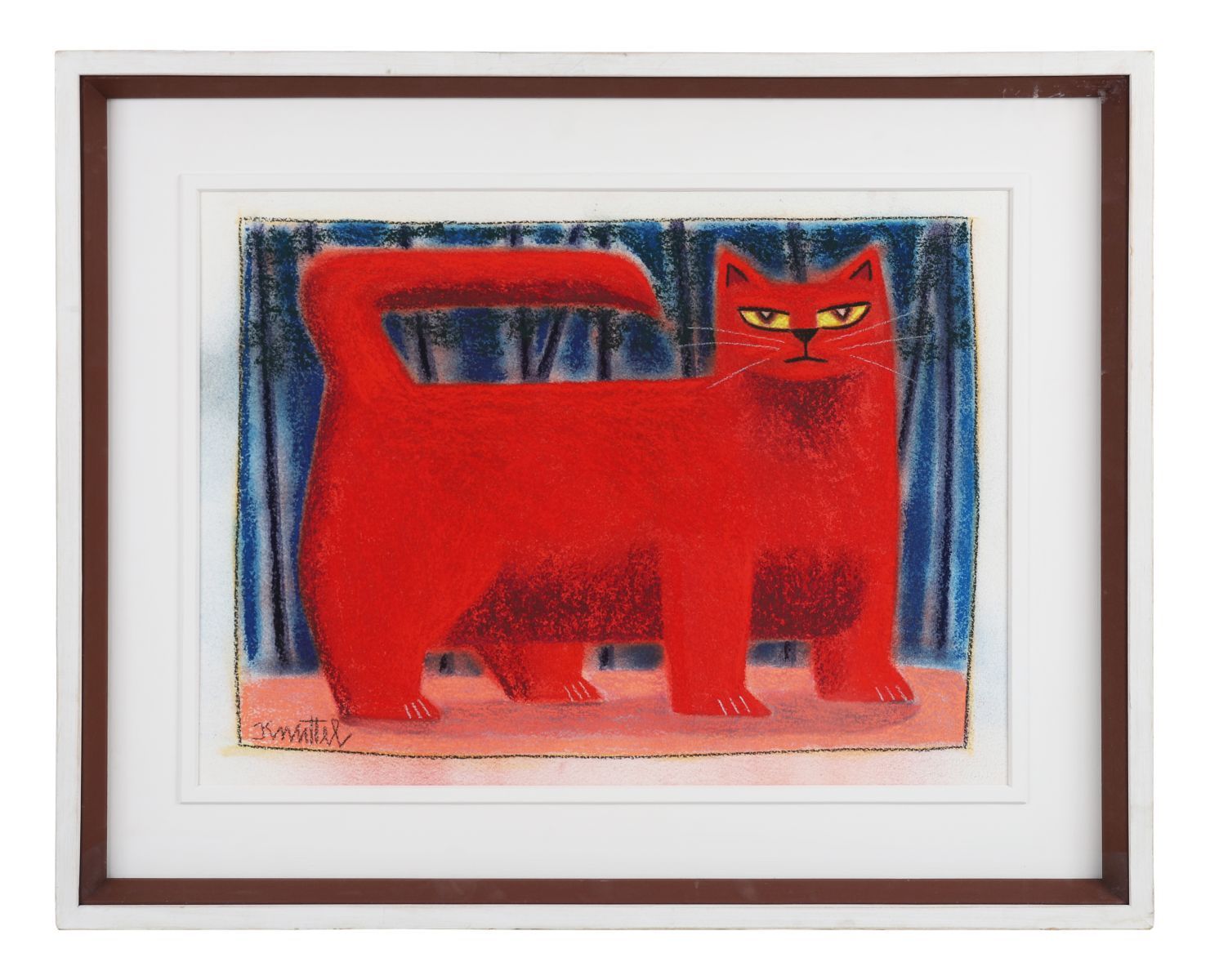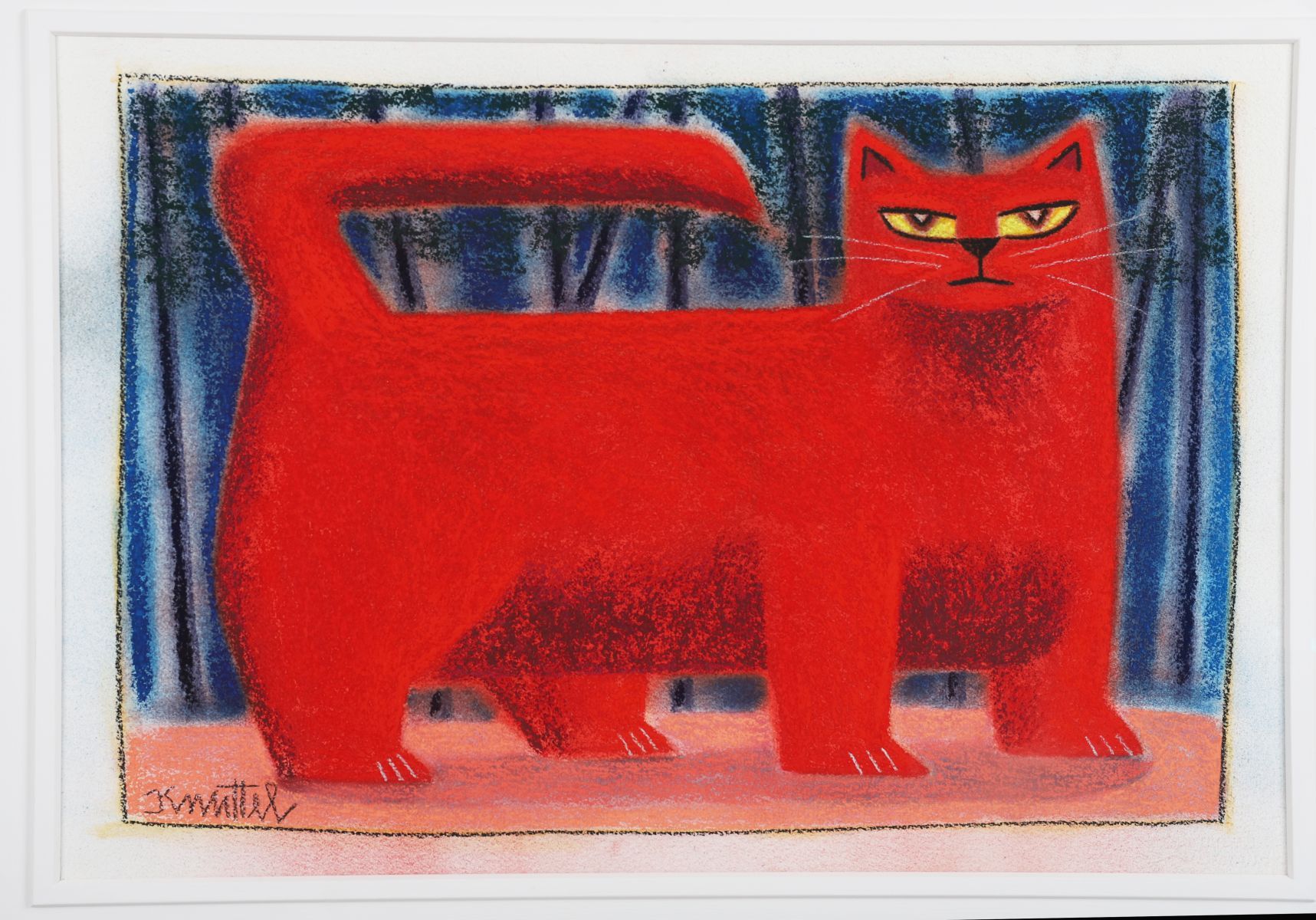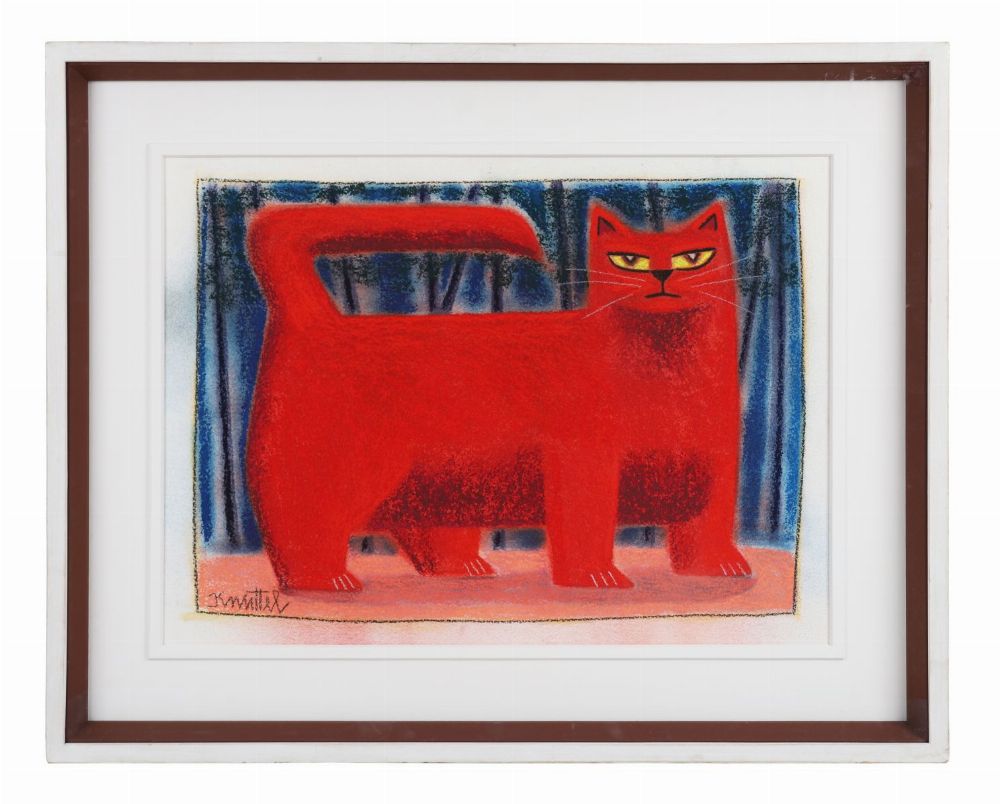 A striking pastel composition featuring a boldly rendered red cat against a deep blue interior backdrop. Knuttel’s signature stylisation, dense surface texture and vivid chromatic contrasts give the work a strong, iconic presence. Signed bottom left.