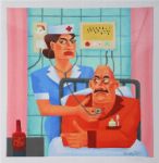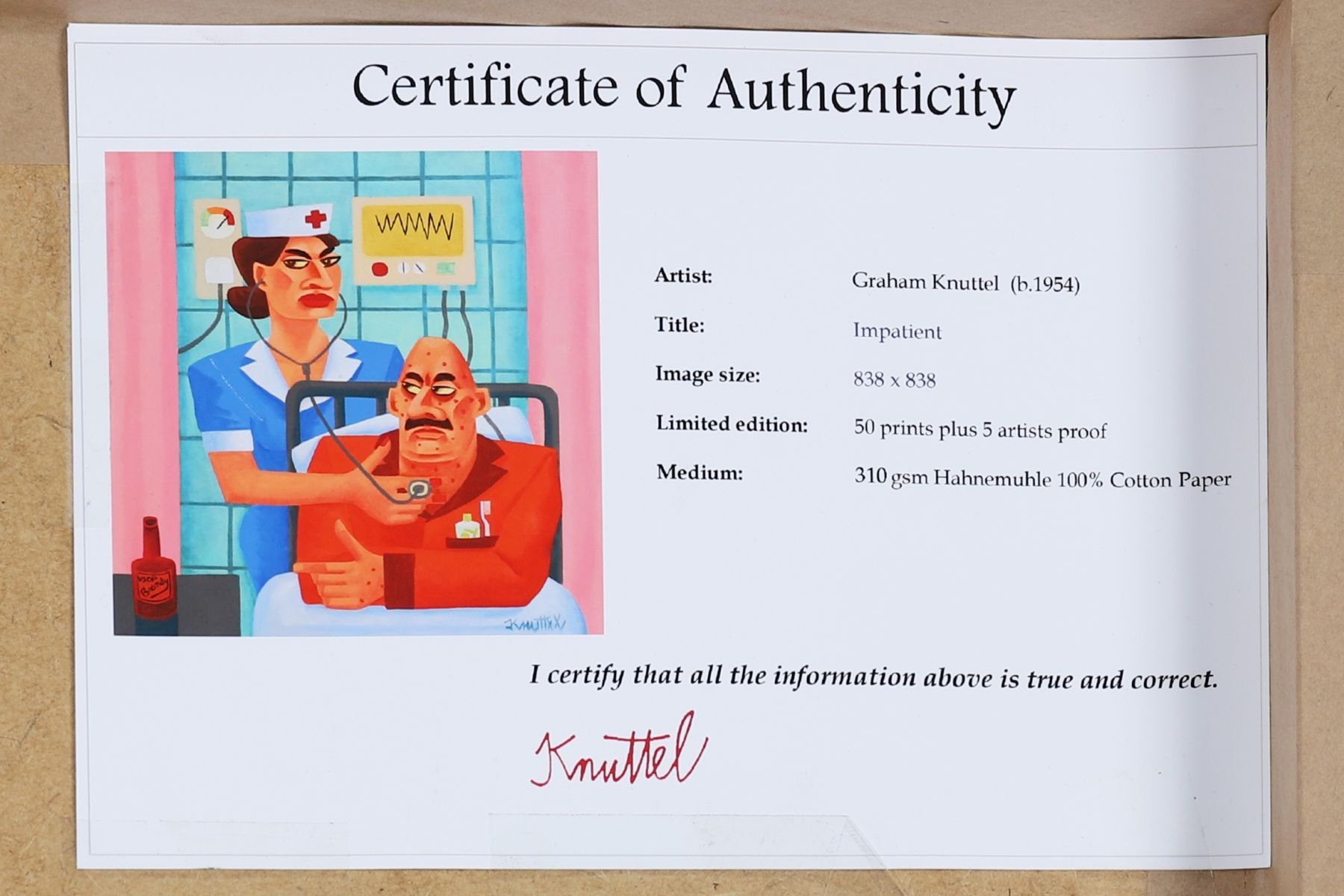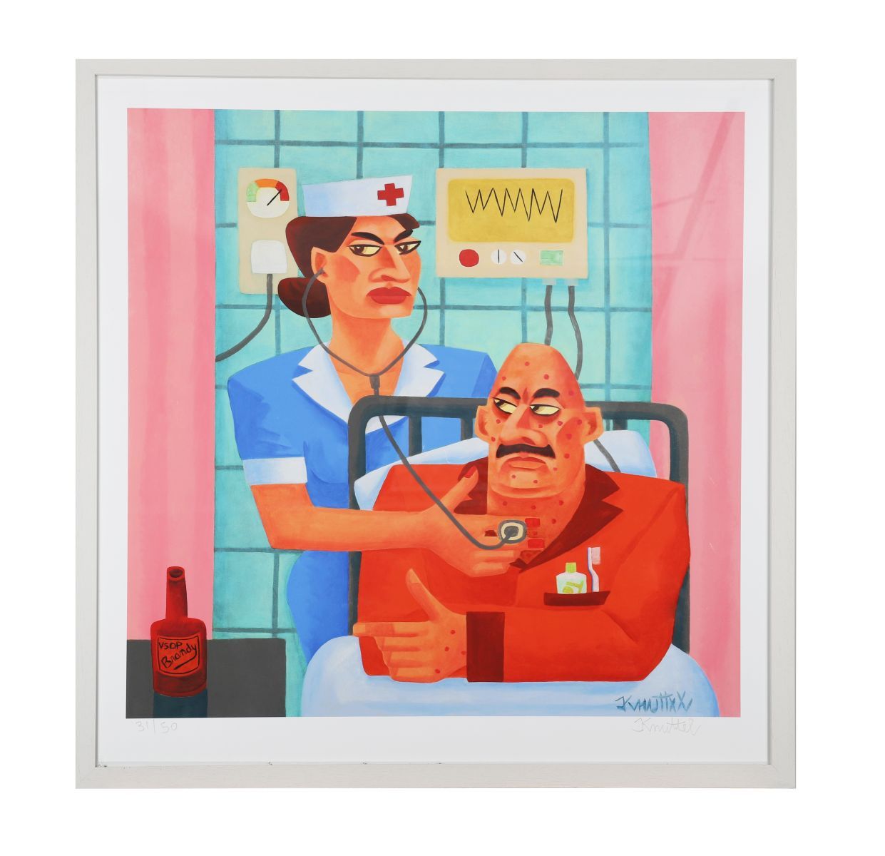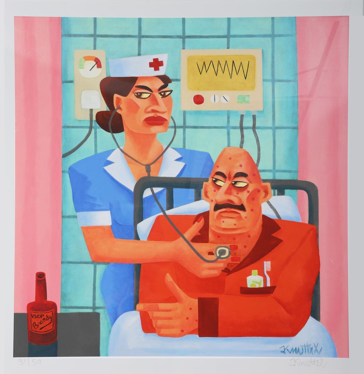 A limited edition screenprint by Graham Knuttel titled Impatient, depicting a nurse attending a disgruntled patient in Knuttel’s distinctive stylised form. Bold colours, strong outlines, and sharp geometry reflect the artist’s signature approach to human tension and psychology. Signed lower right and numbered 31/50 lower left. Presented in a white frame.