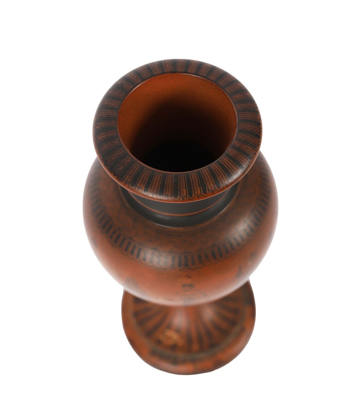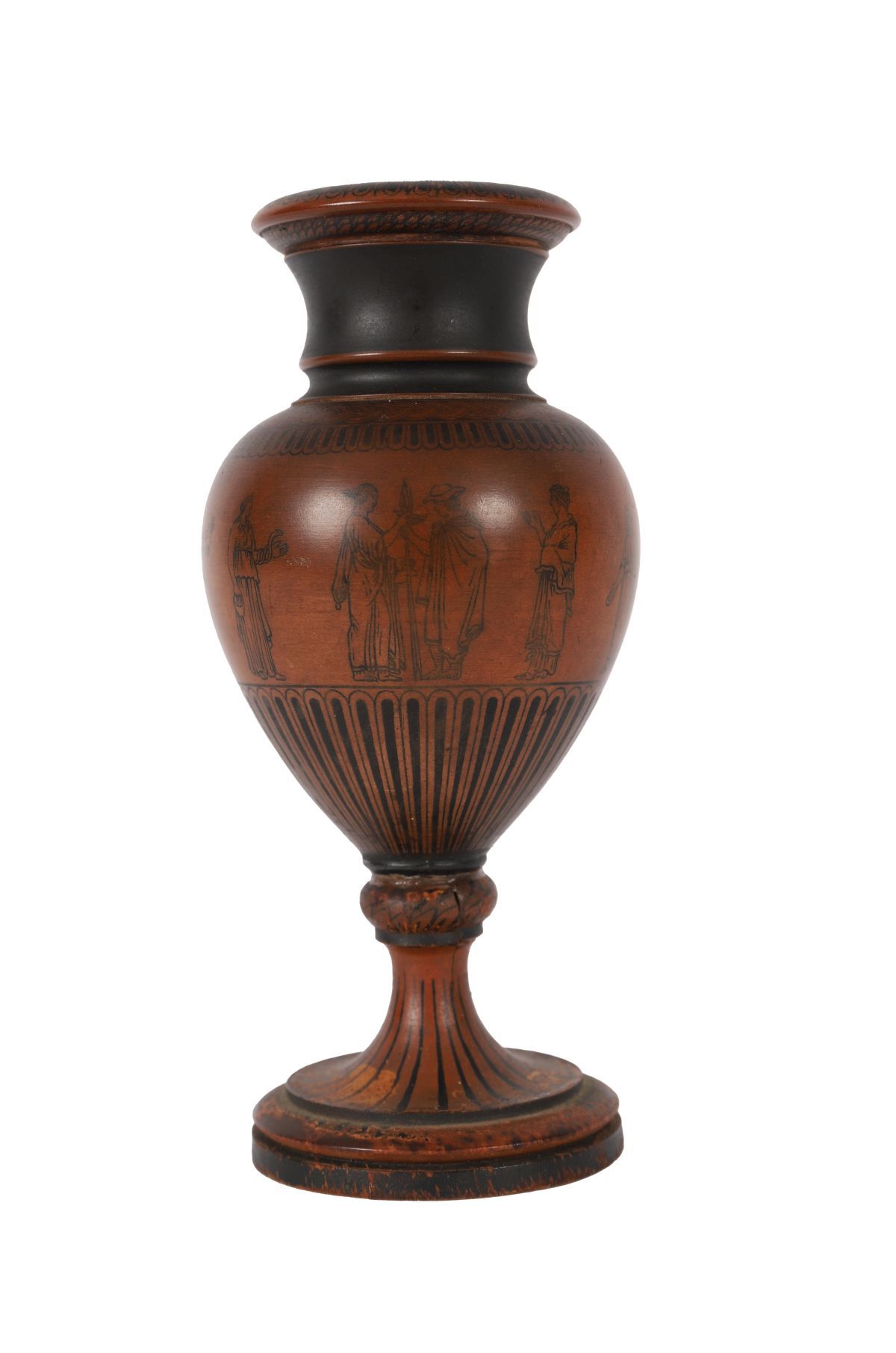 A neoclassical terracotta vase inspired by ancient Greek red-figure pottery, depicting classical draped figures and stylised ornament. Produced by the Giustiniani workshop, Naples, noted for Grand Tour reproductions of antiquities.