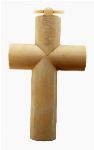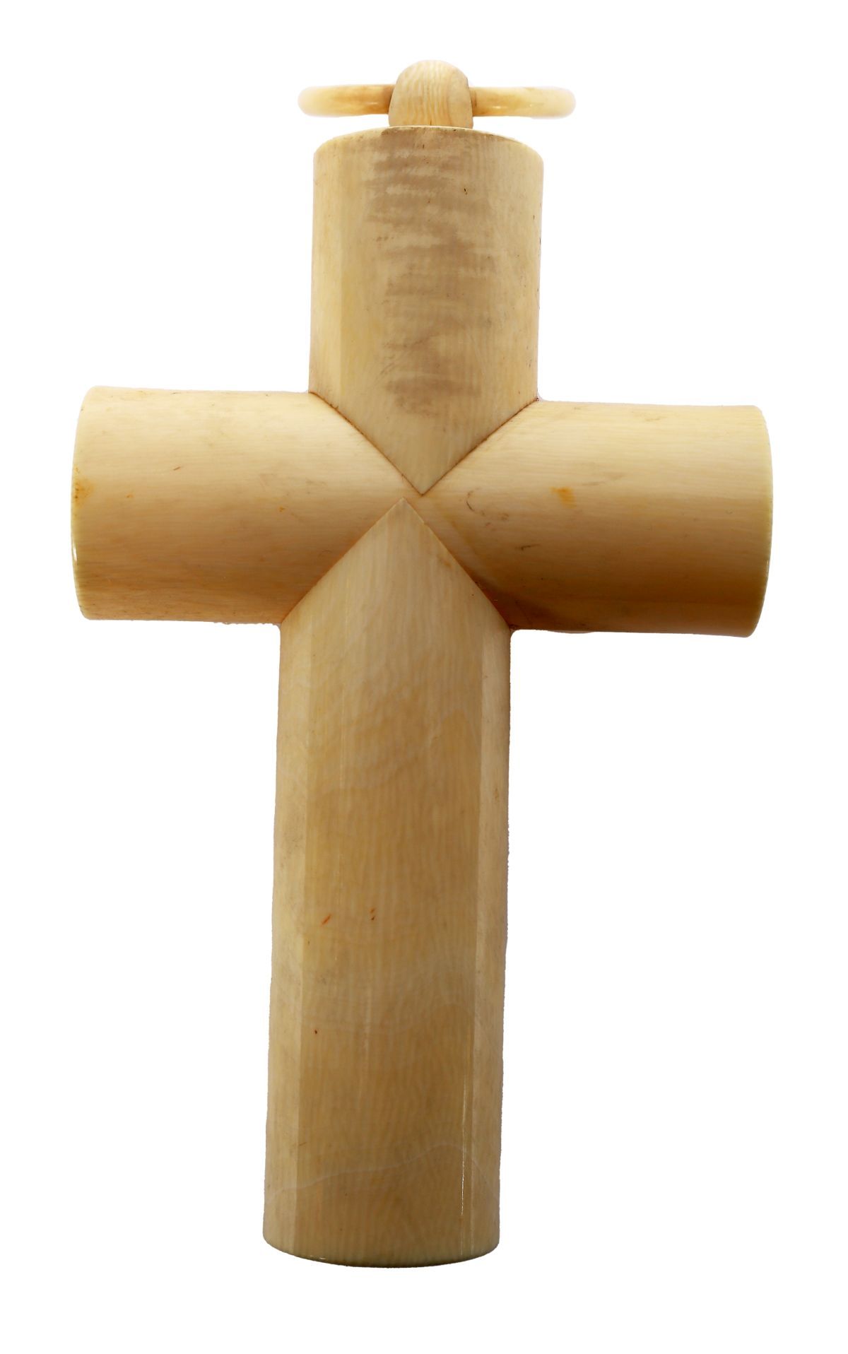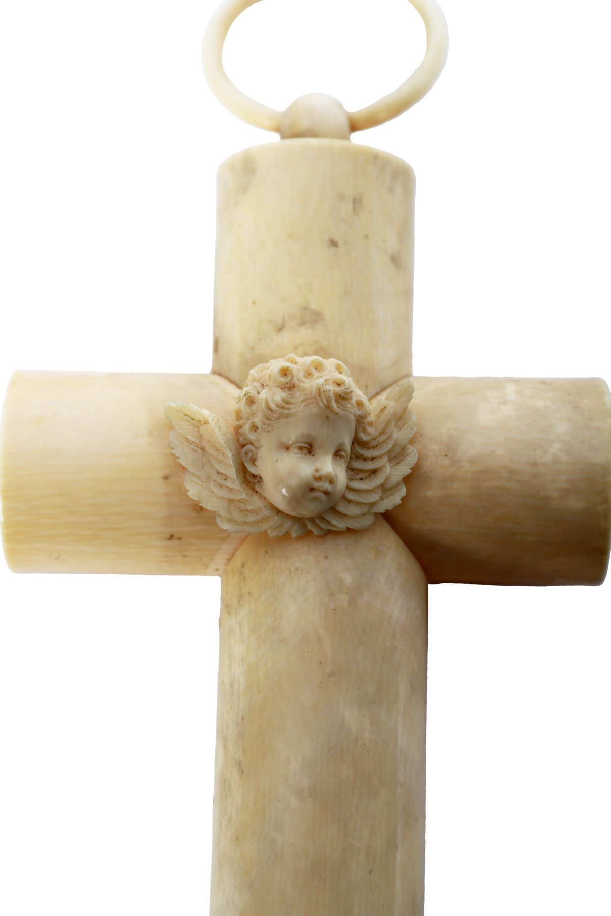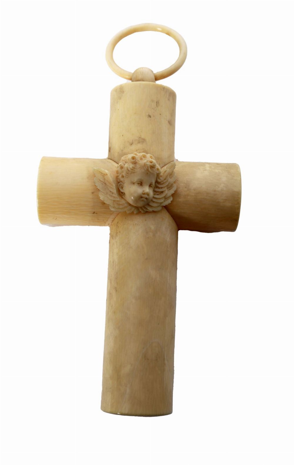A carved ivory crucifix of cylindrical form with applied angel head at the intersection and small peg fitting, the surface showing the typical grain and tonality of aged ivory. Italian, late 19th century.