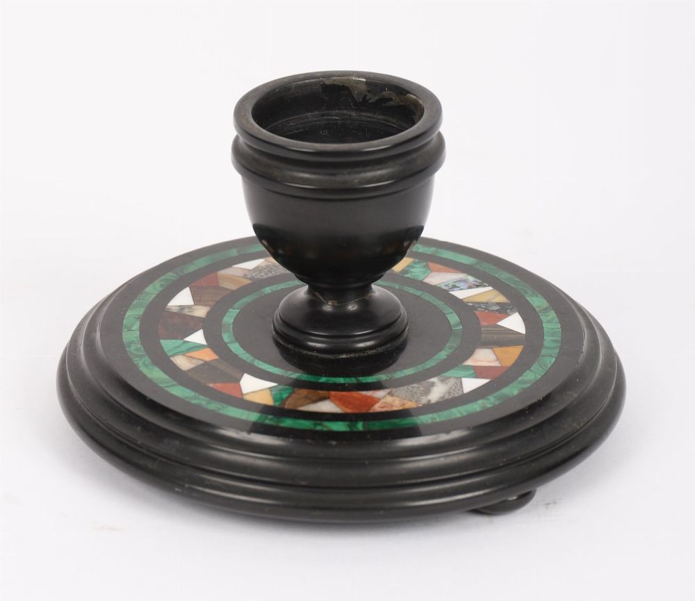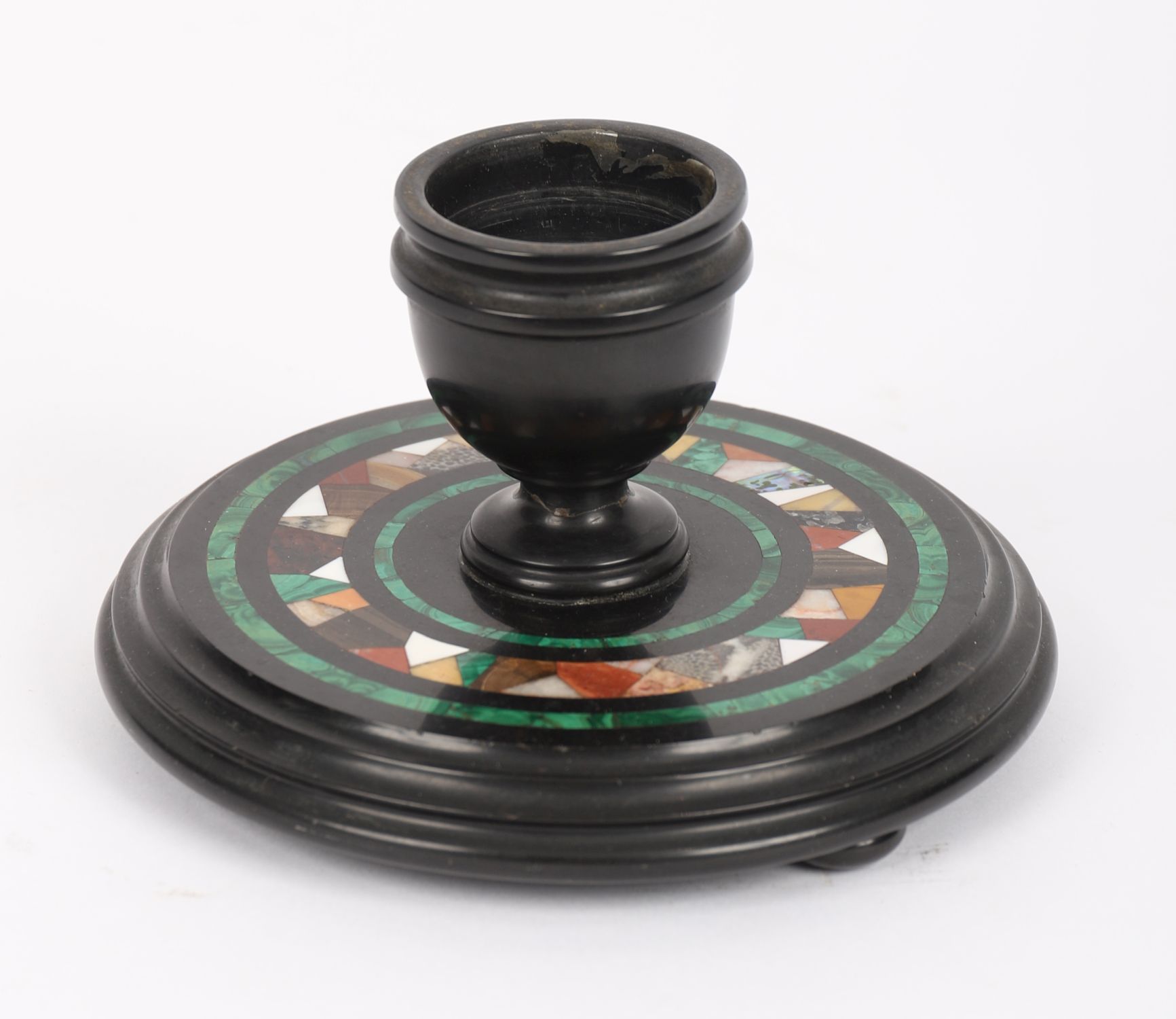 A 19th century Grand Tour black marble candlestick, the circular base inset with specimen hardstone panels including malachite, agate, and porphyry, arranged in concentric geometric bands.